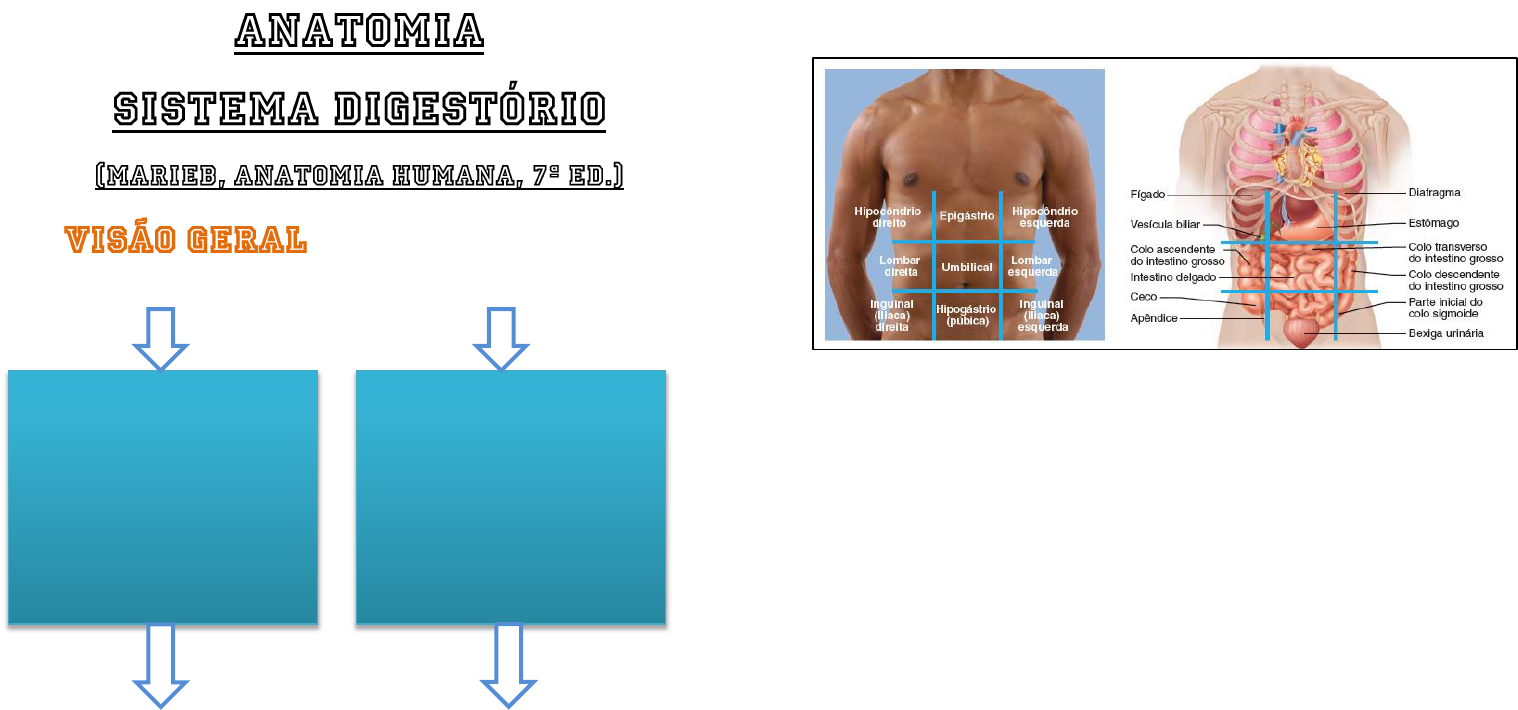 Trato digestório, TGI (tubo muscular) + Órgãos acessórios anexos 9 metros Água, enzimas, soluções-tampão REGIÕES ABDOMINAIS CAVIDADE PERITONEAL E PERITÔNIO Peritônio visceral + peritônio parietal = cavidade peritoneal (contém líquido seroso que permite o deslizamento das vísceras) MESENTÉRIOS É uma dupla camada de peritônio, mantêm os órgãos em suas posições, armazenam gordura e servem de rota para vasos e nervos chegarem aos órgãos na cavidade peritoneal. Alguns são chamados de ligamentos, mas sem relação com aqueles do sistema locomotor. Órgãos peritoneais e seus mesentérios: fígado (ligamento falciforme e omento menor), estômago (omento maior e menor), íleo e jejuno (mesentério próprio), colo transverso (mesocolo transverso) e colo sigmóide (mesocolo sigmóide). Cavidade oral Faringe Esôfago Estômago Intestino delgado (ID) Intestino grosso (IG) Dentes Língua Glândulas salivares Fígado Vesícula biliar Pâncreas Os mesentérios ventrais são ligamento falciforme (liga face anterior do fígado à parede anterior do abdômen e ao diafragma) e omento menor (vai do fígado á curvatura menor do estômago e início do duodeno). Os mesentérios dorsais são o omento maior (liga a curvatura maior à parede posterior do abdômen, sua margem esquerda é o ligamento gastro- esplênico que se continua dorsalmente como ligamento esplenorrenal), o mesentério (sustenta as espirais do jejuno e do íleo), o mesocolo transverso e o mesocolo sigmóide. Os órgãos retroperitoneais, depois de bem desenvolvidos, não possuem mesentério e nem peritônio, tais como duodeno, colo ascendente, colo descendente, reto e pâncreas. PROCESSOS DIGESTÓRIOS São seis as funções desempenhadas pelo sistema digestório: Ingestão: captação do alimento pela boca Propulsão: movimento do alimento pelo TGI. Inclui deglutição (voluntária) e peristalse (involuntária, envolve contração e relaxamento para misturar e espremer o alimento) Decomposição mecânica: inclui mastigação, agitação do alimento no estômago e segmentação (constrições locais rítmicas do intestino) Digestão: etapas em que moléculas complexas são decompostas em elementos químicos básicos. Absorção: transporte dos produtos finais da digestão até os capilares sanguíneos e linfáticos. Defecação: eliminação dos não digeríveis em forma de fezes. 1. Em que ponto do tubo digestório ocorre a propulsão? Ao longo de todo o TGI (da cavidade oral até o ânus), iniciando com a deglutição até a peristalse que se propaga ao longo de todo o tubo. 2. Diferencie a cavidade abdominal e a cavidade peritoneal. Quais órgãos do sistema digestório estão situados na cavidade abdominal, mas não são intraperitoneais? A cavidade abdominal corresponde a toda região delimitada desde o diafragma ate os limites com a cavidade pélvica; a cavidade peritoneal corresponde ao espaço delimitado pelas lâminas serosas de peritônio visceral e parietal e ocupa a região abdominopélvica, porém nem toda a região abdominal é constituída de peritônio, tendo em vista que, boa parte do duodeno, o colo ascendente, o colo descendente, o reto e o pâncreas são retroperitoneais. 3. Identifique todos os mesentérios que conectam cada órgão mencionado. Para cada um deles, afirme se é um mesentério dorsal ou um mesentério ventral. (a)Fígado: ligamento falciforme e omento menor – mesentérios ventrais, (b) Estômago: omento menor – mesentério ventral e omento maior – mesentério dorsal, (c) Colo sigmoide: mesocolo sigmóide – mesentério dorsal. 4. A lesão no baço ou fígado pode provocar sangramento interno profuso. Onde se acumularia o sangue de uma lesão como essa? Acumular-se-ia na cavidade peritoneal e causaria uma peritonite necessitando, assim, de uma drenagem abdominal. HISTOLOGIA As paredes do TGI, desde o esôfago até o canal anal, têm as mesmas quatro camadas de tecido. A partir da luz, essas camadas são: mucosa, submucosa, muscular e serosa/adventícia. Mucosa Mais interna, mais complexa, contém três subcamadas: epitélio de revestimento, lâmina própria e muscular da mucosa. O epitélio reveste a luz do tubo e participa nos processos de digestão, absorção e secreção de muco, sendo contínuo com ductos e células secretoras intrínsecas. A lâmina própria possui fibras reticulares, nutre o epitélio e absorve os nutrientes digeridos. Contém o MALT (tecido linfático associado à mucosa), o qual defende contra a invasão de microorganismos. A muscular da mucosa, também conhecida como camada muscular interna, é composta por músculo liso que produz movimentos à mucosa. Submucosa Tecido conjuntivo (meio frouxo, meio denso irregular) que reveste a mucosa e alberga vasos sanguíneos (emite ramos para todas as outras camadas) e linfáticos, além de fibras nervosas. Possui muitas fibras elásticas que permitem a distensão do TGI à passagem de alimento. Muscular Também conhecida como camada muscular externa é composta por duas camadas de músculo liso: camada circular interna (comprime o tubo - segmentação) e camada longitudinal (encurta o tubo - peristaltismo). A camada circular pode se tornar espessa em alguns locais, o que forma esfíncteres (válvulas que impedem o refluxo de alimento de um órgão a outro). Serosa É também o peritônio visceral, constituída por epitélio pavimentoso simples (mesotélio) sustentado por uma fina camada de tecido conjuntivo frouxo. Partes do TGI que não estão associadas à cavidade peritoneal, possuem adventícia (tecido conjuntivo fibroso comum), como a porção torácica do esôfago. Órgãos retroperitoneais possuem serosa (parte anterior – cavidade peritoneal) e adventícia (parte posterior – adesão à parede abdominal). MÚSCULO LISO Nas paredes das vísceras ocas, as fibras musculares lisas estão dispostas em ângulos retos, pois são organizadas em duas lâminas: camada longitudinal (mais externa) e camada circ