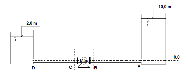 Hidráulica e Hidrologia – Profa. Carla Silva LISTA DE EXERCÍCIOS 02 – MÁQUINAS HIDRÁULICAS 1) Bombeiam-se 0,15 m3/s de água através de uma tubulação de 0,25 m de diâmetro, de um reservatório aberto cujo nível d’água mantido constante está na cota de 567,00 m. A tubulação passa por um ponto alto na cota 587,00 m. Calcule a potência necessária à bomba, com rendimento de 75 %, para manter no ponto alto da tubulação um pressão disponível de 147 kN/m 2 , sabendo que entre o reservatório e o ponto alto, a perda de carga é igual a 7,5 m. RESPOSTA: Pot = 84 kW 2) Entre os dois reservatórios mantidos em níveis constantes, encontra-se uma máquina hidráulica instalada em uma tubulação circular com área igual a 0,01 m 2 . Para uma vazão de 20 l/s entre os reservatórios, um manômetro colocado na seção B indica uma pressão de 68,8 kN/m 2 e a perda de carga entre as seções D e C é igual a 7,5 m. Determine o sentido do escoamento, a perda de carga entre as seções A e B, o tipo de máquina hidráulica (bomba ou turbina) e a potência da máquina se o rendimento é de 80 %. RESPOSTA: HAB=2,78 m; Pot = 0,564 kW. 3) A figura a seguir mostra o sistema de bombeamento de água do reservatório R1 para o reservatório R2, através de uma tubulação de diâmetro igual a 0,40 m, pela qual escoa uma vazão de 150 l/s com uma perda de carga unitária J=0,0055 m/m. As distâncias R1B1 e B1R2 medem, respectivamente, 18,5 m e 1800 m. A bomba B1 tem potência igual a 50 cv e rendimento de 80 %. Com os dados da figura, determine: a) a que distância de B1 deverá ser instalada B2 para que a carga de pressão na entrada de B2 seja igual a 2 m.c.a; b)a potência da bomba B2, se o rendimento é de 80 %, e a carga de pressão logo após a bomba. Despreze, nos dois itens, a carga cinética na tubulação. RESPOSTAS:a) x=527 m; b) Pot=22,075 kW; P2/=14 m.c.a Hidráulica e Hidrologia – Profa. Carla Silva 4) O esquema indica o transporte de 60 l/s de água do reservatório I para o reservatório II, através de uma tubulação de 200 mm de diâmetro. Com os dados da figura, determinar: a) a posição da bomba, definida pela distância X, para que a carga de pressão imediatamente a sua montante seja 0,90 m.c.a. b) a potência da bomba em c.v. admitindo um rendimento de 80 %. c) traçar mais ou menos em escala, a linha piezométrica indicando os valores das cargas de pressão no ponto B e imediatamente a montante e a jusante da bomba. A perda de carga por metro de tubulação (perda unitária) é dada por J=0,1V 2 /2g (m/m). Despreze as perdas de carga localizadas e considere a carga cinética. Dados LAB=500 m, LBC=1000 m. RESPOSTAS:a) X= 315 m; b) Pot=48 c.v.; c) PB/=22,51 m; Pm/=0,90m; Pj/=48,9m. 5) No esquema mostrado na figura a pressão na seção (2) é 205,80 kPa e a perda de carga total entre as seções (1) e (4) é 2,0 m, a vazão é 10 l/s e a área da seção das duas tubulações é 100 cm 2 . Os reservatórios estão em níveis constantes. Determinar: a) O sentido do escoamento; b) O tipo de máquina hidráulica Hidráulica e Hidrologia – Profa. Carla Silva (bomba ou turbina). c) A potência da máquina em c.v. se seu rendimento é de 70 %. Dados: H2O=9,8x10 3 N/m 3 . RESPOSTA: Pot=4,95 c.v. 6) Uma bomba eleva água do reservatório A para o reservatório B, como na figura. A perda de carga total de A à 1 é igual a 7 vezes a carga cinética do conduto A1 de sucção e a perda de carga total entre 2 e B é igual a 25 vezes a carga cinética do conduto 2B de recalque. Admitindo um rendimento de 80 % determine a potência fornecida pela bomba quando a vazão for 30,0 l/s e as cargas de pressão nos pontos 1 e 2. RESPOSTAS: Pot=15 c.v. ; P1/=-2,98 m.c.a. ; P2/≈27 m.c.a.