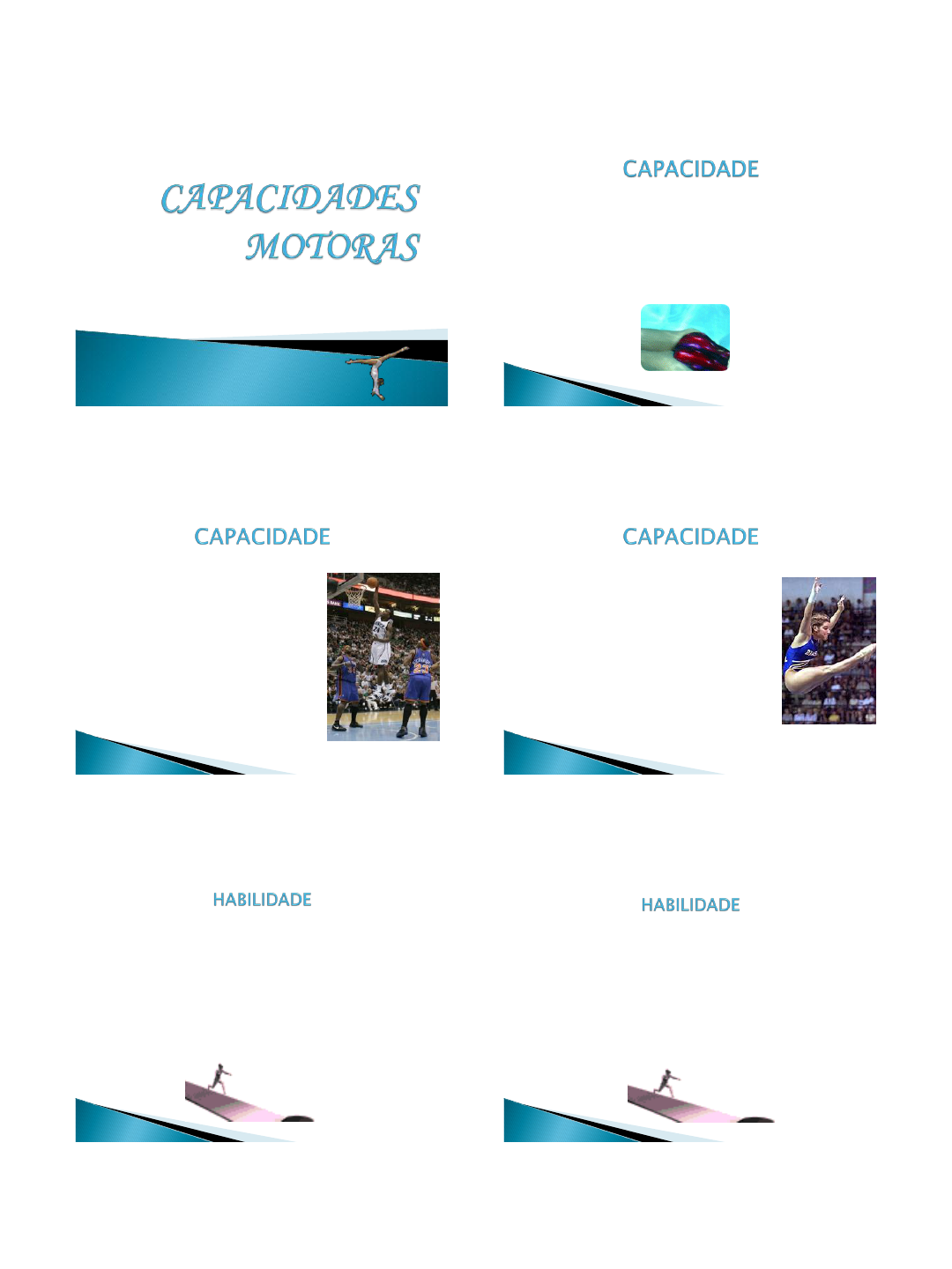 11/03/2018 1 CONCEITOS Capacidade: Traços inatos, relativamente permanente e estável do indivíduo que embasam ou dão suporte a vários tipos de atividades ou habilidades (MAGGILL, 1999). Traços estáveis e duradouros que, na sua maior parte, são geneticamente determinados e que embasam a performance habilidosa dos indivíduos (SCHIMIDT, 2000) São consideradas geneticamente determinadas. Elas representam o hardware (o que ele já tem) que os indivíduos trazem consigo para as situações de performance e aprendizagem (MAGGILL, 1999). Potencialidades para produzir um resultado de performance com máxima certeza, mínimo de energia ou tempo mínimo, desenvolvida como um resultado da prática (MAGGILL, 1999). Capacidades podem ser considerados os “equipamentos” básicos com o qual as pessoas nascem e as habilidades são os movimentos. 11/03/2018 2 Quanto mais sofisticado é o hardware do computador, melhor ele será, todavia, o computador mais sofisticado do mundo é inútil sem programas de software. As capacidades são os hardwares e as habilidades são os softwares (programas). HABILIDADE ≠ CAPACIDADE CAPACIDADES HABILIDADES Traços herdados Desenvolvidas com prática Adquiridas através do treino Modificáveis com a prática Poucas em número Muitas em número Embasam a performance de muitas habilidades Dependem dos diferentes subconjuntos de capacidades diferentes Magill, 1999 CAPACIDADES: Depende tanto de fatores genéticos como de fatores vivenciais. São características gerais e bastante contínuas, que se tornam permanentes após os anos de desenvolvimento formativo. HABILIDADES: É um ato específico, um movimento pré- determinado a um dado estímulo; É aprendida através da prática e depende de fatores subjacentes; HABILIDADES: Uma capacidade pode servir como base para muitas habilidades e, por outro lado, uma habilidade pode depender de várias capacidades para sua execução ideal. CLASSIFICAÇÃO Habilidades Perceptivo Motoras CAPACIDADES MOTORAS HABILIDADES & CAPACIDADES MOTORAS Habilidades que dependem da qualidade das estruturas do organismo Habilidades que dependem da experiência passada - PROPOSTA POR FLEISHAN (1972) 11/03/2018 3 Habilidades perceptivo motoras HABILIDADES PERCEPTIVO MOTORAS Coordenação Precisão de controle Tempo de reação Controle de graduação Destreza manual Destreza dos dedos Pontaria MAGGILL (1999) Coordenação motora geral Coordenação Estática Coordenação Dinâmica Habilidades que dependem da qualidade das estruturas do organismo Coordenação motora específica Coordenação Viso motora Coordenação óculo Manual Coordenação cinestésica Coordenação acústica MAGGILL (1999) Habilidades que dependem da experiência passada HABILIDADES PERCEPTIVO MOTORAS Orientação Cinestésica Esquema Corporal Lateralidade Expressão corporal Orientação e/ou percepção espaço-temporal Expressão Corporal MAGGILL (1999) Capacidades de Proficiência física CAPACIDADES Força Estática Força Dinâmica Força Explosiva Flexibilidade Resistência Velocidade MAGGILL (1999) DESEMPENHO HABILIDOSO Capacidade de se alcançar algum resultado final com o máximo de certeza e o mínimo de dispêndio de energia, ou de tempo e de energia (GUTHRIE, 2003). Uma ação complexa e voluntária, envolvendo toda uma cadeia de mecanismos sensoriais, centrais e motores que, pelo processo de aprendizagem, tornam-se organizados e coordenados, para alcançar objetivos pré- determinados com máxima certeza (WHITING, 1998). Até por volta dos 6 a 7 anos, a criança se caracteriza pela aquisição, estabilização e diversificação das habilidades básicas. 11/03/2018 4 Por volta dos 10 a 12 anos, teremos o refinamento e diversificação na combinação destas habilidades em padrões cada vez mais complexos (TANI,1988). Ex.:A criança adquire primeiro o padrão fundamental de andar e com base nesse padrão, desenvolve o andar diversificado em termos de formas, velocidades e direções. Muitos professores ou até pais, na ânsia de obter resultados imediatos de seus pequenos alunos nos campeonatos mirins e infantis, não se atenta, para esse processo hierárquico de aprendizagem motora, promovendo a especialização precoce. O sucesso final vai depender, significativamente, de respeito à hierarquia na aprendizagem motora e aos períodos críticos que influenciam essa aprendizagem. Certos períodos, durante o crescimento e desenvolvimento, são ótimos para influenciar a aprendizagem de um determinado tipo de comportamento. É o momento em que a maturação das estruturas neuromotoras atingiram as capacidades mínimas necessárias para a aprendizagem de determinadas habilidades. Antes disso, as tentativas resultam de pouca aprendizagem, enquanto que, Após esse período, diversos fatores atuam no sentido de dificultar a aprendizagem. Sugerimos aos professores que consultem a bibliografia especializada nos jogos e na educação física infantil, onde poderão encontrar exemplos e, utilizando a sua própria criatividade, adaptar para a sua aula a forma que julgar mais motivadora eficaz. À medida que as crianças forem dominando os movimentos propostos, e que a faixa etária for aumentando, o professor deverá apresentar novos desafios, onde ocorra a combinação das habilidades já desenvolvidas. 11/03/2018 5 OBR!GADA!