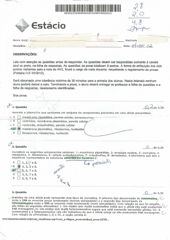 Prova BIOLOGIA CELULAR AV2