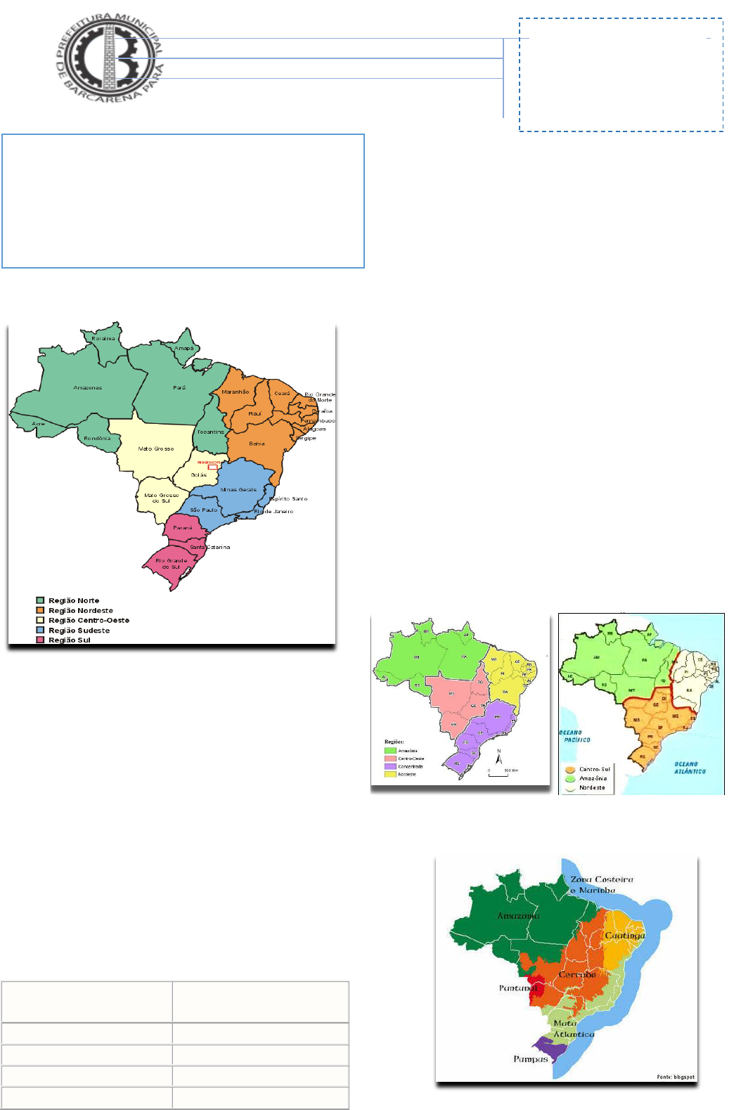 E. M. Laurival M. Cunha 1º Processo Avaliativo de Geografia de 2018 Professora: Silvana Nascimento Turmas 7º ano ________ Aluno(a)_________________________________ Avaliação Bimestral (6.0): Qualitativa (4.0): Total (10): I N S T R U Ç Õ E S Utilizar somente caneta nas cores AZUL ou PRETA; Leia com atenção as questões e responda; Rasuras anularão as questões, portanto, primeiramente, responda a lápis com calma e apenas quando tiver certeza da resposta, passe a mesma para caneta. 1-Observe o mapa a baixo e marque as alternativas corretas das questões. 1) O melhor título para o mapa acima é: a( ) Regiões do IGBE b( ) Biomas Brasileiros c( ) Os quatros brasis 2) O Brasil, segundo a regionalização do IBGE, está dividido em 5 regiões brasileiras, são elas a( ) Sul, sulista, América, nordeste e norte b( ) Norte, Nordeste, Centro-Oeste, Sul e Sudeste c( ) Sudeste, São Paulo, Centro, Brasileira e Norte 3) Relacione a 2ª coluna de acordo com a 1ª, considerando as Regiões Brasileiras: ( 1 ) Região Centro-Oeste ( ) Mato Grosso ( 2 ) Região Nordeste ( ) Amazonas ( 3 ) Região Sudeste ( )Santa Catarina ( 4 ) Região Sul ( ) Rio Grande do Norte ( 5 ) Região Norte ( ) Rio de Janeiro 4-Quais são as 3 regiões dos complexos regionais da proposta de Geiser? a( ) Centro Sul, Amazônia e Nordeste b( ) Nordeste, Amazônia e Sudeste c( ) Sul, Cento Oeste e Norte. 5- Que região brasileira tem maior população? a( ) Sudeste b( ) Nordeste c( ) Sul 6- Associe os mapas com seus respectivos nomes: (a) Complexos regionais. (b) Biomas Brasileiros. (c) Quatro Brasis ( ) ( ) ( ( )