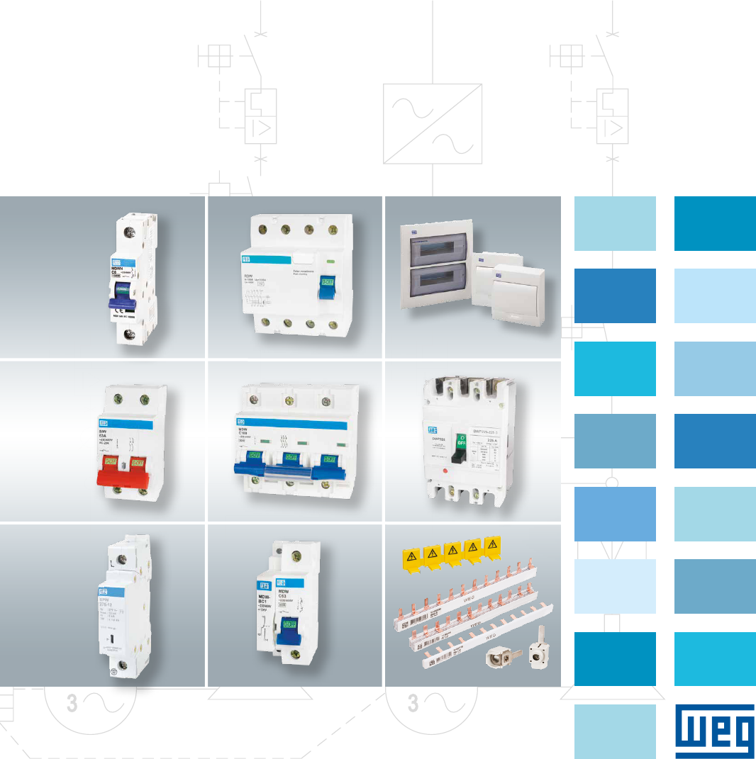 Motores | Automação | Energia | Transmissão & Distribuição | Tintas Automação Minidisjuntores MDW e MDWH Quadros de Distribuição QDW Disjuntores em Caixa Moldada Predial DWP Interruptores Diferenciais Residuais RDW Dispositivos de Proteção Contra Surto SPW www.weg.net Minidisjuntores - Quadros e Acessórios de Distribuição - Interruptores - Dispositivos de Proteção - Disjuntores2 Índice Minidisjuntores - MDW e MDWH ................................................................................................3 Quadros de Distribuição - QDW .................................................................................................8 Acessórios de Distribuição .........................................................................................................9 Interruptores Seccionadores - SIW ..........................................................................................10 Interruptores Diferenciais Residuais - DRs RDW ...................................................................... 11 DPS - Dispositivos de Proteção Contra Surtos - SPW e SPWC ...............................................14 Disjuntores em Caixa Moldada - DWP .....................................................................................16 Dimensões (mm) ......................................................................................................................18 Esquemas de Ligação ..............................................................................................................19 www.weg.net Minidisjuntores - Quadros e Acessórios de Distribuição - Interruptores - Dispositivos de Proteção - Disjuntores 3 Referência e Código WEG MDW Minidisjuntores - MDW e MDWH Curvas de Disparo g Curva B O minidisjuntor de curva B tem como característica principal o disparo instantâneo para correntes entre 3 a 5 vezes a corrente nominal. Sendo assim, são aplicados principalmente na proteção de circuitos com características resistivas ou com grandes distâncias de cabos envolvidas. Ex.: lâmpadas incandescentes, chuveiros, aquecedores elétricos, etc. g Curva C O minidisjuntor de curva C tem como característica o disparo instantâneo para correntes entre 5 a 10 vezes a corrente nominal. Sendo assim, são aplicados para a proteção de circuitos com instalação de cargas indutivas. Ex.: lâmpadas fluorescentes, geladeiras, máquinas de lavar, etc. A linha de minidisjuntores MDW e MDWH oferece proteção contra sobrecarga e curto-circuito em condutores elétricos, atendendo as curvas características de disparo B e C, conforme a norma NBR NM 60898 e NBR IEC 60947-2. Desenvolvida para aplicações em circuitos de baixa tensão, de corrente contínua ou alternada de 2 a 125 A e capacidade de interrupção de curto-circuito de até 10 kA. A linha de minidisjuntores conta com bloco de contatos auxiliares, barramento de distribuição monopolar, bipolar e tripolar, e trava cadeado, conforme exigência da norma NR 10, como acessórios. Possui também mecanismo de disparo livre, onde o disparo independe da posição da manopla, e indicação do estado do disjuntor (MDWH). Referência Corrente Curva Código WEG - - - - - - - - MDW-B6 6 A B 10076396 MDW-B10 10 A B 10076404 MDW-B16 16 A B 10076412 MDW-B20 20 A B 10076420 MDW-B25 25 A B 10076428 MDW-B32 32 A B 10076436 MDW-B40 40 A B 10076444 MDW-B50 50 A B 10076452 MDW-B63 63 A B 10076460 MDW-B70 70 A B 11134964 MDW-B80 80 A B 10076468 MDW-B100 100 A B 10075742 MDW-B125 125 A B 11807321 Referência Corrente Curva Código WEG MDW-C2 2 A C 10076381 MDW-C4 4 A C 11076389 MDW-C6 6 A C 10076397 MDW-C10 10 A C 10076405 MDW-C16 16 A C 10076413 MDW-C20 20 A C 10076421 MDW-C25 25 A C 10076429 MDW-C32 32 A C 10076437 MDW-C40 40 A C 10076445 MDW-C50 50 A C 10076453 MDW-C63 63 A C 10076461 MDW-C70 70 A C 11134789 MDW-C80 80 A C 10076469 MDW-C100 100 A C 10075743 MDW-C125 125 A C 11807325 Minidisjuntores Monopolares www.weg.net Minidisjuntores - Quadros e Acessórios de Distribuição - Interruptores - Dispositivos de Proteção - Disjuntores4 www.weg.net Minidisjuntores - MDW e MDWH Minidisjuntores Bipolares Referência Corrente Curva Código WEG - - - - - - - - MDW-B6-2 6 A B 10076398 MDW-B10-2 10 A B 10076406 MDW-B16-2 16 A B 10076414 MDW-B20-2 20 A B 10076422 MDW-B25-2 25 A B 10076430 MDW-B32-2 32 A B 10076438 MDW-B40-2 40 A B 10076446 MDW-B50-2 50 A B 10076454 MDW-B63-2 63 A B 10076462 MDW-B70-2 70 A B 11134696 MDW-B80-2 80 A B 10076470 MDW-B100-2 100 A B 10075744 MDW-B125-2 125 A B 11807322 Referência Corrente Curva Código WEG MDW-C2-2 2 A C 10076383 MDW-C4-2 4 A C 10076391 MDW-C6-2 6 A C 10076399 MDW-C10-2 10 A C 10076407 MDW-C16-2 16 A C 10076415 MDW-C20-2 20 A C 10076423 MDW-C25-2 25 A C 10076431 MDW-C32-2 32 A C 10076439 MDW-C40-2 40 A C 10076447 MDW-C50-2 50 A C 10076455 MDW-C63-2 63 A C 10076463 MDW-C70-2 70 A C 11134790 MDW-C80-2 80 A C 10076471 MDW-C100-2 100 A C 10075745 MDW-C125-2 125 A C 11807327 Minidisjuntores Tripolares Referência Corrente Curva Código WEG - - - - - - - - MDW-B6-3 6 A B 10076400 MDW-B10-3 10 A B 10076408 MDW-B16-3 16 A B 10076416 MDW-B20-3 20 A B 10076424 MDW-B25-3 25 A B 10076432 MDW-B32-3 32 A B 10076440 MDW-B40-3 40 A B 10076448 MDW-B50-3 50 A B 10076456 MDW-B63-3 63 A B 10076464 MDW-B70-3 70 A B 11134697 MDW-B80-3 80 A B 10077877 MDW-B100-3 100 A B 10075746 MDW-B125-3 125 A B 11807323 Referência Corrente Curva Código WEG MDW-C2-3 2 A C 10076385 MDW-C4-3 4 A C 10076393 MDW-C6-3 6 A C 10076401 MDW-C10-3 10 A C 10076409 MDW-C16-3 16 A C 10076417 MDW-C20-3 20 A C 10076425 MDW-C25-3 25 A C 10076433 MDW-C32-3 32 A C 10076441 MDW-C40-3 40 A C 10076449 MDW-C50-3 50 A C 10076457 MDW-C63-3 63 A C 10076465 MDW-C70-3 70 A C 11134791 MDW-C80-3 80 A C 10075739 MDW-C100-3 100 A C 10075747 MDW-C125-3 125 A C 11807348 Minidisjuntores Tetrapolares Referência Corrente Curva Código WEG - - - - - - - - MDW-C6-4 6 A C 10076403 MDW-C10-4 10 A C 10076411 MDW-C16-4 16 A C 10076419 MDW-C20-4 20 