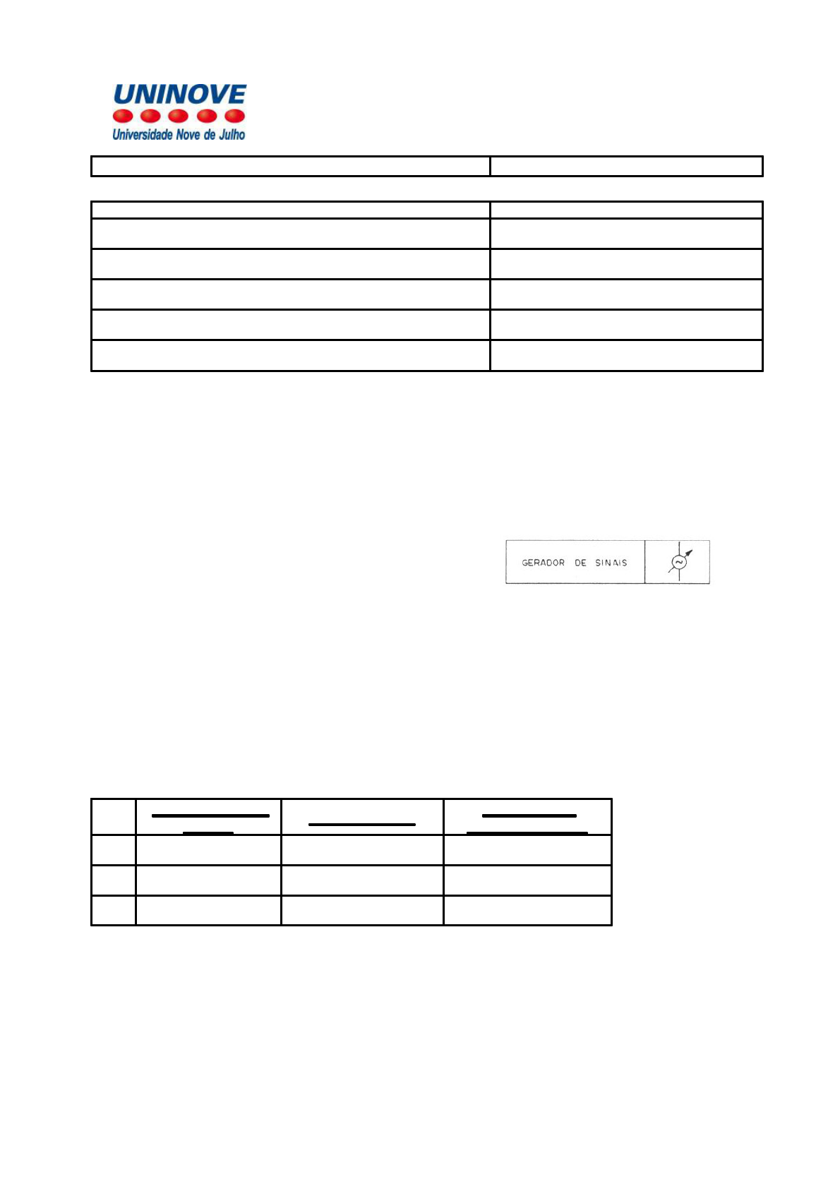 1 Universidade Nove de Julho Osciloscópio e Gerador de Sinais Experiência 01 Identificação dos alunos Rev.28082015 1 Turma: 2 Disciplina: Circuitos Elétricos 2 3 Data: ____/_____/_____ 4 Profº Laboratório: 5 Visto Profº: Objetivos: 1. Familiarização com o osciloscópio, gerador de sinais e seus controles; 2. Verificar utilizando o osciloscópio, as formas de onda senoidal, triangular e quadrada; 3. Medir tensões alternadas e contínuas. Material Experimental: Gerador de Sinais _________________; Osciloscópio _________________; Kit Datapool 8860 _________________; Multímetro: _________________. Procedimento 1. Ligue o osciloscópio com o Canal 1 conectado à saída de calibração, através de uma ponta de prova; 2. Verifique e anote a atuação de cada controle; 3. Faça a calibração do osciloscópio através da saída de calibração; 4. Ajuste a fonte de tensão com o voltímetro para os valores especificados no quadro 1. Meça cada valor com o osciloscópio, anotando a posição do atenuador vertical (Volts/Div) e o número de divisões do deslocamento. V(V) Pos. atenuador (V/Div) Nº de divisões Vmedido no osciloscópio (V) 2 10 15 Quadro 1. 5. Ajuste o gerador de sinais para as freqüências especificadas nos quadros 2, 3 e 4 com amplitude máxima para as formas de ondas senoidal, quadrada e triangular. Meça cada frequência com o osciloscópio, anotando respectivamente a posição da varredura (sec/div) e o número de divisões ocupadas pelo período. 2 Onda Senoidal f gerador Pos. de varredura (t/div) Nº de divisões T f 100Hz 5kHz Quadro 2. Onda Quadrada f gerador Pos. de varredura (t/div) Nº de divisões T f 250Hz 1200Hz Quadro 3. Onda Triangular f gerador Pos. de varredura (t/div) Nº de divisões T f 600Hz 10KHz Quadro 4. 6. Ajuste o gerador de sinais para frequência de 60Hz, onda senoidal. Utilizando o multímetro na escala Vac, ajuste a saída do gerador para os valores especificados no quadro 5. Para cada caso, meça com o osciloscópio e anote respectivamente, a tensão Vp e a tensão Vpp, conforme ligação vista na figura. Vef Voltímetro Vp Vpp Vef Calculado 1 4 7 Quadro 5. 3 Questões Teóricas 1. Utilizando os valores de pico, obtidos com o osciloscópio no ítem 5 da experiência, calcule os valores eficazes, preenchendo o quadro 5 e comparando-os com os medidos pelo voltímetro. 2. Através do gráfico abaixo, determine: a) T e f; b) Vp, Vpp e Vef; c) A equação V(t); d) v(t) para t = 15ms e t = 22ms; e) Vdc. 3. Calcule T, f e Vdc para a tensão da figura. 4. Determine a frequência e a amplitude do sinal visto na tela do osciloscópio da figura abaixo. Slide 1 Slide 2 Slide 3