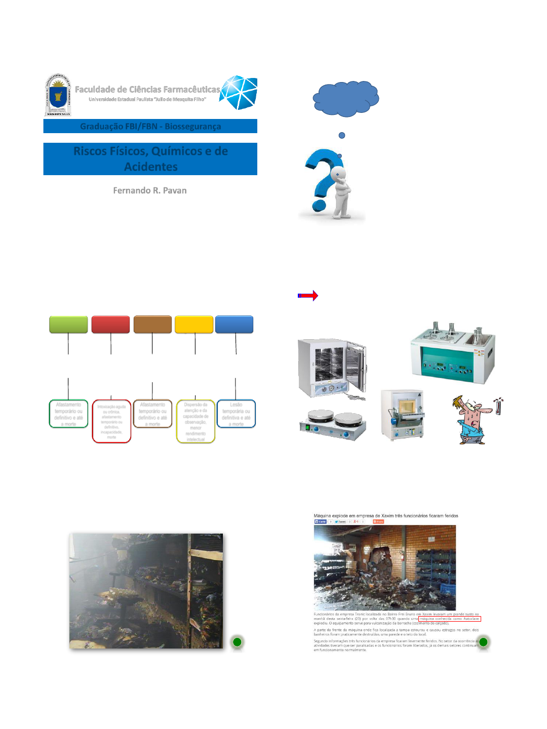 20/03/2018 1 Riscos Físicos, Químicos e de Acidentes Fernando R. Pavan Faculdade de Ciências Farmacêuticas Universidade Estadual Paulista “Julio de Mesquita Filho” Graduação FBI/FBN - Biossegurança Riscos?? É a probabilidade de um evento acontecer. É o resultado obtido pela efetividade do perigo Risco Físico Risco Químico Risco Biológico Risco Ergonômico Risco Acidentes Calor, frio, ruído, vibração, radiação Afastamento temporário ou definitivo e até a morte Contaminantes do ar, subst. tóxicas e inflamáveis, irritantes e carcinogênicos Intoxicação aguda ou crônica, afastamento temporário ou definitivo, incapacidade, morte Contaminação: Bactérias, fungos, vírus ou protozoários Afastamento temporário ou definitivo e até a morte Fadiga física ou mental, instabilidade emocional, depressão, dores gerais Dispersão da atenção e da capacidade de observação, menor rendimento intelectual Vidrarias, instrumentos perfuro-cortantes Lesão temporária ou definitiva e até a morte Classificação dos riscos ambientais/ocupacionais Calor 1800ºC Departamento de Alimentos e Nutrição/FCFAR Incêndio em 2008 causado por equipamento de laboratório Riscos físicos Riscos Físicos Riscos físicos 20/03/2018 2 Ultrafreezer (-80ºC), nitrogênio líquido (-180ºC), gelo seco (- 78ºC), câmara frias (variável) Riscos Físicos Riscos físicos Frio Não é apenas o calor que queima o frio também pode causar esses danos!! Riscos físicos - Luvas e aventais 100% à prova de água. - Multicamadas que permitam isolamento térmico (ex. Nylon ou couro) - Diversas marcas no mercado - Óculos de proteção Como trabalhar com criogenia! Riscos físicos Ruídos e vibração: trituradores, ultra-som, bombas de vácuo. Avaliar níveis de decibéis (NBR 10152/ABNT) Riscos físicos Ruídos e Vibrações Radiações Luz visível, ondas de rádio e televisão, raios X Toda energia que se propaga em forma de onda através do espaço!!! Radiações não ionizantes (não penetrantes) Radiações ionizantes (penetram) Engloba toda a radiação e os campos do espectro eletromagnético que não tem energia suficiente para provocar mudanças nos átomos em que incide. É a radiação eletromagnética com energia suficiente para provocar mudanças nos átomos em que incide (ionização), como é o caso dos raios X, dos raios alfa, beta e gama, e dos materiais radioativos. 20/03/2018 3 Efeitos no Organismo Humano - Ionizantes Efeitos no Organismo Humano – Não ionizantes Ultravioleta Infravermelho Inflamação nos tecidos do globo ocular Queimaduras de pele, lesões oculares e pigmentação de pele Podem ou não depender da dose da radiação levando a um efeito mais ou menos severo Radiação Ultra Violeta: Transiluminador Riscos físicos Exemplos de equipamentos Radiação Ultra Violeta: Cabine de fluxo laminar (lâmpada germicida). Riscos físicos Exemplos de equipamentos Perigos da exposição à radiação ionizante Material Radioativo: Tópico especial onde os laboratórios devem ser construídos conforme recomendações e o manipulador deve fazer cursos de manipulação de radioisótopos. Risco x período de exposição Riscos físicos RISCOS QUÍMICOS Intoxicação aguda ou crônica, afastamento temporário ou definitivo, incapacidade e até a morte!!! Consideram-se agentes de risco químico as substâncias, compostos ou produtos que possam penetrar no organismo do trabalhador principalmente pela via respiratória, nas formas de poeiras, fumos gases, neblinas, nevoas ou vapores, ou possam ter contato ou ser absorvido pelo organismo através da pele ou por ingestão. 20/03/2018 4 Principais Meios de Penetração das Substâncias Químicas no Organismo Inalação Absorção Ingestão PROPRIEDADES PERIGOSAS asfixiantes irritantes inflamáveis comburentes explosivas corrosivas danosas ao meio ambiente teratogênicas mutagênicas carcinogênicas alergênicas tóxicas Classificação das Substâncias Químicas Substâncias capazes de causar qualquer efeito adverso ou nocivo sobre um organismo vivo. Em geral, todas as substâncias químicas apresentam toxicidade. (Paracelsus, 1493-1541) Grau de Toxicidade DL 50 / CL 50 DL 50 oral DL 50 cutânea CL 50 inalação muito tóxica tóxica nociva ratos mg/kg ratos, coelhos mg/kg ratos mg/m3 < 25 < 50 < 0,5 25 - 200 50 - 400 0,5 - 2 200 - 2000 400 - 2000 2 - 20 Substância DL 50 oral (ratos, mg/kg) 7000etanol cloreto sódio formol dioxina tox. botulínica 3000 100 0,001 0,00001 Tóxicas DL50 e CL50 são as doses ou concentrações que levam a morte 50% dos animais! Um potencial carcinogênico ocupacional significa qualquer substância, combinação ou mistura de substâncias, que causam um aumento da incidência de neoplasias benignas ou malignas, como resultado de exposição por via oral, respiratória ou dérmica, ou qualquer outra exposição que resulte na indução de tumor em um local diferente do local de administração. (Hunter, 1989). Riscos químicos Carcinogênicas Carcinogênicos: Classificação das substâncias Substâncias suspeitas de causas de câncer no organismo humano, sem as quais não se dispõe de dados suficientes para provar sua atividade carcinogênica, e os estudos com animais não fornecem provas suficientes para classifica-las na classe II. Classe I Substância cujo efeito carcinogênico para o homem foi demonstrado através de estudos epidemiológicos de causa-efeito. Classe II Substância provavelmente carcinogênicas para o homem. Estudos de toxicidade a longo prazo efetuados em animais. Classe III Riscos químicos HIDROCARBONETOS Possui como via de absorção a via inalatória Pertence ao Grupo 1 Estudos indicam a relação da exposição aos hidrocarbonetos e leucemias Riscos químicos Utilizados largamente nos combustíveis e indústrias química Por quê? Na década de 90 com a escassez do etanol, foi utilizado metanol para abastecimento de carros. Logo ele foi retirado do mercado. Por quê? 20/03/2018 5 R