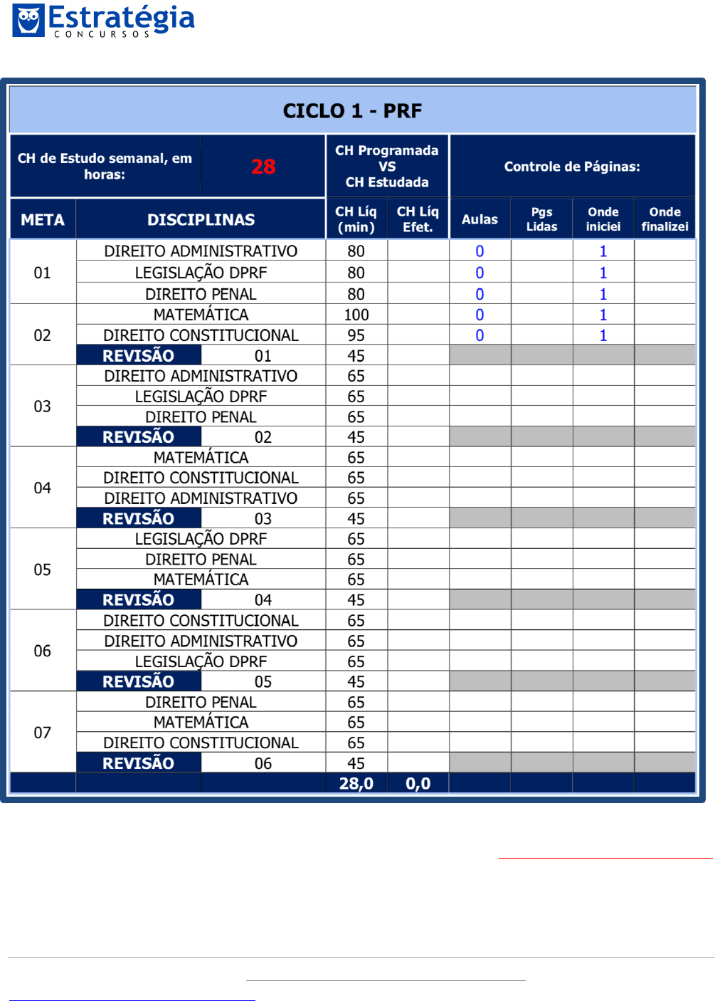 Programa de Coaching do Estratégia Concursos Plano de Estudos Projeto PRF Equipe do Coaching www.estrategiaconcursos.com.br 1 de 10 coaching@estrategiaconcursos.com.br Como utilizar este Plano de Estudos para Agente da PRF: https://youtu.be/i8PjF1u-80w Programa de Coaching do Estratégia Concursos Plano de Estudos Projeto PRF Equipe do Coaching www.estrategiaconcursos.com.br 2 de 10 coaching@estrategiaconcursos.com.br Programa de Coaching do Estratégia Concursos Plano de Estudos Projeto PRF Equipe do Coaching www.estrategiaconcursos.com.br 3 de 10 coaching@estrategiaconcursos.com.br Programa de Coaching do Estratégia Concursos Plano de Estudos Projeto PRF Equipe do Coaching www.estrategiaconcursos.com.br 4 de 10 coaching@estrategiaconcursos.com.br Programa de Coaching do Estratégia Concursos Plano de Estudos Projeto PRF Equipe do Coaching www.estrategiaconcursos.com.br 5 de 10 coaching@estrategiaconcursos.com.br Programa de Coaching do Estratégia Concursos Plano de Estudos Projeto PRF Equipe do Coaching www.estrategiaconcursos.com.br 6 de 10 coaching@estrategiaconcursos.com.br Algumas considerações: 1) Importante! Todas as planilhas e ideias aqui divulgadas são apenas sugestões. Não temos a pretensão de dizer que o planejamento acima é melhor ou pior do que qualquer outro. O objetivo é dar o ponto de vista de direcionamento da Equipe de Coaching do Estratégia, entretanto sem considerar as peculiaridades de rotina e de conhecimento de cada aluno, já que seria impossível fazer planejamentos de estudos para todos os perfis de candidatos. Tente perceber a ideia por trás da construção dos ciclos - que é demonstrada através dos vídeos no Canal do YouTube do Estratégia e também do vídeo de Plano de Estudos para o Concurso de Agente da Polícia Rodoviária Federal. Faça as adaptações para a sua situação, caso perceba que algo demonstrado aqui será válido para a sua preparação, beleza? 2) 1º Ciclo: Sugestão de estudo INICIAL das matérias com base no peso da disciplina para a prova, a importância do seu conhecimento para o aprendizado de outras disciplinas a serem inseridas mais para frente, o seu tamanho e também a sua Programa de Coaching do Estratégia Concursos Plano de Estudos Projeto PRF Equipe do Coaching www.estrategiaconcursos.com.br 7 de 10 coaching@estrategiaconcursos.com.br complexidade. Esse assunto foi amplamente tratado no vídeo sobre o Plano de Estudos. 3) Caso você queira realmente otimizar os seus estudos, a principal atitude que recomendamos é: deixar de fazer resumos escritos e/ou mapas mentais. Para substituí-lo, teste outras técnicas de estudo. No Coaching, recomendamos que nossos alunos grifem o material de estudo para, posteriormente, usar esses grifos como o próprio resumo. Ao comparamos o tempo necessário para fazer resumos escritos e o tempo necessário para grifar o material, notamos que, em média, o estudo da aula aliado ao uso dos grifos utiliza apenas metade do tempo necessário para se estudar a aula enquanto em conjunto com a produção dos resumos escritos. É normal, no começo, sentir uma insegurança ao tentar estudar apenas grifando, mas depois você notará que é o “método”, e não o “instrumento”, o maior responsável pela memorização da matéria. O método é a revisão constante (Ciclos de Revisão), enquanto o instrumento pode ser o resumo escrito, o resumo em áudio ou o material grifado com resumo. Recomendo então que acesse os links abaixo sobre o preparo eficiente do seu material de estudos: v Como fazer marcações no material para ganhar tempo: clique aqui. v Revisões x Marcações x Resumos x Mapas Mentais: clique aqui. v Como estudar (do início): clique aqui. 4) Foram programadas revisões de 24h/7 dias aliadas aos Ciclos de Revisões, que – basicamente - é a sistemática de revisões que, aqui no Estratégia, consideramos a mais eficiente. Entretanto, no vídeo sobre o Plano de Estudos para a PRF, sugerimos modelos de estudo com menos revisões para otimização do seu tempo. Na planilha em Excel, enviamos os modelos em formato editável. 5) 2º Ciclo: Seria o equivalente à 2ª semana de estudo. Iniciamos nele as revisões de 7 dias. Nos turnos brancos de estudo (turnos de estudo teórico e inédito), permanecemos com as mesmas disciplinas. 6) 4º Ciclo: Seria o equivalente à 4ª semana de estudo, onde iniciamos os Ciclos de Revisões. Os Ciclos de Revisão são revisões feitas com base em uma carga horária, porém sem a obrigação de fazer a revisão de um determinado intervalo de páginas, assim como acontece nas revisões de 24h e de 7 dias. Nos turnos brancos de estudo, as mesmas matérias são mantidas, já que o estudo estaria ainda no primeiro mês, representando, portanto, pouco avanço na teoria das disciplinas estudadas. 7) Quando você quiser inserir mais disciplinas ao Ciclo de Revisão, é só criar mais turnos de Ciclo de Revisão e dedicar algum tempo para eles. Dentro do Ciclo de Revisão, as disciplinas são revezadas da mesma maneira como ocorre nos turnos brancos de estudo. Mas, se você estiver com boa confiança no que já estudou e quiser atrasar a entrada de mais disciplinas no Ciclo de Revisão, você pode ir Programa de Coaching do Estratégia Concursos Plano de Estudos Projeto PRF Equipe do Coaching www.estrategiaconcursos.com.br 8 de 10 coaching@estrategiaconcursos.com.br fazendo os ciclos semanais da mesma forma que o 4º Ciclo (ou seja, com poucos turnos de Ciclos de Revisão, para sobrar mais tempo para os turnos brancos de estudo e, portanto, mais tempo para o avanço nas aulas ainda não estudados). Resumindo esse ponto: vá inserindo disciplinas ao Ciclo de Revisão conforme preferir e achar melhor para o seu estudo, mas tenha em mente que deixar totalmente de revisar é muito perigoso! Na planilha e no vídeo, eu sugiro deixar as revisões de 24h/7d de lado para deixar para iniciar as revisões quando você atingir 50% do conteúdo da matéria.