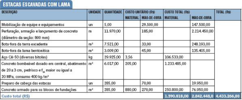 Custo por Unidade Para a elaboração de custo unitário é necessário o conhecimento da tarefa a ser orçada, suas características, as etapas de execução e os recursos necessários na composição da estrutura construtiva, também é importante saber os equipamentos utilizados, a mão-de-obra, os materiais e serviços. No caso da estaca escava que é perfurada com o auxílio de trado helicoidal com perfuratriz rotativa, o material utilizado que vai variar de acordo com o local onde ela ser feita (seja nos tipos de solo já citados anteriormente ou na água). E armação da mesma e suas medidas de vão variar de acordo com a demanda da obra. Depois de definir os recursos da composição, deve – se elaborar passo a passo. A primeira parte é analisar o projeto, o local de implantação e o local que vai ser utilizado pelos materiais que auxiliaram a escavação. O segundo passo é calcular o consumo de materiais por metro de estaca (seguindo as orientações do projeto). Deve – se calcular o volume de concreto (m³) e os consumo de aço. E por fim, montar a composição dos preços unitários, entram os valores dos equipamentos, a mão – de – obra, e dos materiais e serviços. Deve se levar em consideração a profundidade das estacas, a quantidade de estacas e encargos extras como especificações de materiais por conta de locais com mais dificuldade de trabalho (água). Exemplo de tabela de valor de estaca escava, esse tipo foi submetido a uma dificuldade de procedimento