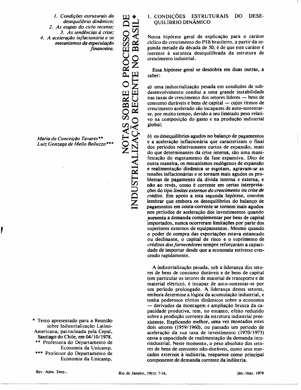 1. Condições estruturais do desequilíbrio dinâmico; 2. As etapas do ciclo recente; 3. As tendências à crise; 4. A aceleração inflacionária e os mecanismos da especulação financeira. Maria da Conceição Tavaress" Luiz Gonzaga de Mello Betluzzov": , • Texto apresentado para a Reunião sobre Industrialização Latino- Americana, patrocinada pela Cepal, Santiago do Chile, em 04/10/1978. •• Professora do Departamento de Economia da Unicamp. ••• Professor do Departamento de Economia da Unicamp. Rev. Adm. Emp .• 1. CONDIÇÕES ESTRUTURAIS DO DESE- QUILÍBRIO DINÂMICO Nossa hipótese geral de explicação para o caráter cíclico do crescimento do PIB brasileiro, a partir da se- gunda metade da década de 50, é de que este caráter é inerente à natureza desequilibrada da estrutura de crescimento industrial. Essa .hipótese geral se desdobra em duas outras, a saber: a) uma industrialização pesada em condições de sub- desenvolvimento conduza uma grande instabilidade nas taxas de crescimento dos setores líderes - bens de consumo duráveis e bens de capital - cujos ritmos de crescimento acelerado são incapazes de auto-sustentar- se, por muito tempo, devido a seu limitado peso relati- vo na composição do gasto e na produção industrial global; b) os desequilíbrios agudos no balanço de pagamentos e a aceleração inflacionária que caracterizam o final dos períodos relativamente curtos de expansão, mais do que determinantes da crise interna, são uma mani- festação do esgotamento da fase expansiva. Dito de outra maneira, os mecanismos endógenos de expansão e realimentação dinâmica se esgotam, agravam-se as tensões inflacionárias e se tornam mais agudos os pro- blemas de pagamento da dívida interna e externa, e não ao revés, como é corrente em certas interpreta- ções do tipo limites externos do crescimento ou crise de 'crédito. Em apoio a esta segunda hipótese, convém . lembrar que embora os desequilíbrios do balanço de pagamentos em conta-corrente se tomem mais agudos nos períodos de aceleração dos investimentos quando aumenta a demanda complementar por bens de capital -importados, nunca ocorreram limitações por parte dos superiores externos de equipamentos. Mesmo quando o poder de compra das exportações estava estancado ou declinante, o capital de risco e o suprimento de créditos dos fornecedores sempre reforçaram a capaci- dade de' importar desde que a economia estivesse cres- cendo rapidamente. A industrialização pesada, sob a liderança dos seto- res de bens de consumo duráveis e de bens de capital (em particular os setores de material de transporte e de material elétrico), é incapaz de auto-sustentar-se por um período prolongado. A liderança destes setores, embora determine a lógica da acumulação industrial, e tenha poderosos efeitos dinâmicos sobre a economia - derivados da montagem e ampliação brusca da ca- pacidade produtiva, tem, no entanto, efeito reduzido sobre a produção corrente da estrutura industrial pree- xistente. Explicando melhor, uma vez montados estes dois setores (1959/1960), ou passado um período de aceleração da sua taxa de investimento (1970/1973) cessa a capacidade de realimentação da demanda inte- rindustrial. Neste momento, o peso absoluto dos seto- res de bens de consumo não-duráveis, como seus mer- cados externos à indústria, reaparece como principal componente de demanda corrente da indústria. . Rio de Janeiro, 19(1): 7-16, jan.lmar. 1979 Notas sobre o processo de industrialização recente no Brasil Sua capacidade de sustentação, porém, depende da taxa de crescimento do emprego e da taxa de salário, ou seja, depende da taxa de acumulação urbana e por isso é incapaz de manter por si mesma o auge do ciclo. Para maior clareza do argumento, podemos recorrer às categorias de uso final (bens de capital, bens de con- sumo duráveis e bens de consumo não-duráveis), su- pondo que os insumos têm uma lógica de expansão ar- ticulada com cada um destes subsetores de demanda final. 8 Comecemos pelo setor de bens de capital e o de insu- mos pesados de uso difundido (mecânica, metalurgia e materiais de construção). Seu ritmo de crescimento corrente e de acumulação são determinados não so- mente pelo ritmo de acumulação geral da economia como principalmente pelo ritmo de expansão de capa- cidade da própria indústria. Este, por sua vez, depende de como se articulam a lógica da concorrência interca- pitalista das grandes empresas internacionais do com- plexo metal/mecânico e da capacidade do setor públi- co de promover in.vestimentos complementares, tanto na órbita das grandes empresas públicas industriais, quanto na esfera dos investimentos públicos conven- cionais em transportes e energia. Esta lógica corres- ponde a um mesmo padrão básico desde o plano de metas, apenas aumentando o peso absoluto e a auto- nomia relativa do Estado e das grandes empresas inter- nacionais. O setor nacional de mecânica pesada vai ar- rastado por este movimento, sendo seu mercado ga- rantido pelas encomendas que lhe são feitas, por um lado pelas empresas estatais e, por outro, pelas empre- sas internacionais. Neste sentido, o grande desenvolvi- mento do setor de bens de capital, verificado na última década, tem-se dado pela expansão mais que propor- cional do subsetor de bens de capital/capital e não pe- lo subsetor de bens de capital/consumo. A moderni- zação e ampliação de capacidade produtiva das princi- pais indústrias de bens de consumo não-duráveis (têx- til e alimentar) dá-se por saltos, após um período de aceleração de taxa de acumulação, no auge do ciclo, não tendo, porém, efeitos realimentadores importan- tes sobre a expansão e modernização do parque de bens capital/consumo. A demanda de ampliação e modernização da capaci- Tabela 1 dade produtiva deste setor da indústria rebate para o exterior sob a forma de importação de equipamentos 