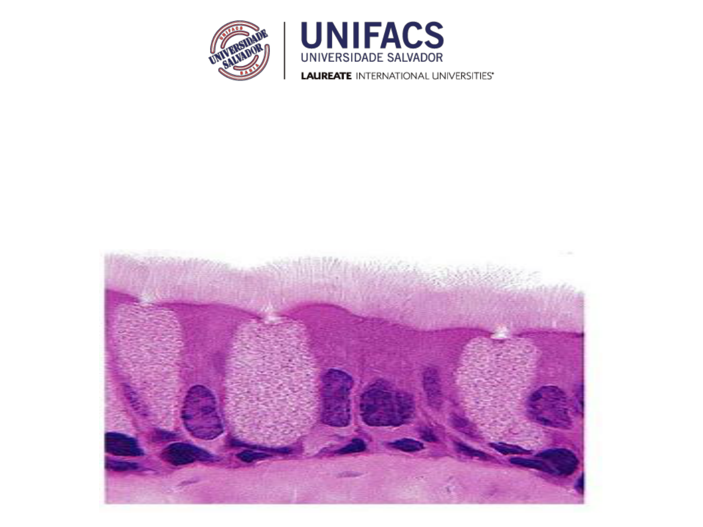 Escola de Ciências da Saúde ESTUDO DOS TECIDOS HUMANOS SISTEMA RESPIRATÓRIO Sua maior parte é revestida por epitélio pseudoestratificado colunar (ou cilíndrico) ciliado com presença de células caliciformes TECIDO RESPIRATÓRIO EPITÉLIO RESPIRATÓRIO TECIDO RESPIRATÓRIO EPITÉLIO RESPIRATÓRIO Muco e cílios EPITÉLIO RESPIRATÓRIO Tipos celulares do epitélio respiratório (5 tipos de células): Mais abundante, cílios na superfície apical. Numerosas mitocôndrias que fornecem ATP para os batimentos ciliares Secretoras de muco, a parte apical contém gotículas de muco composto por glicoproteínas São apoiadas na lâmina basal. Renovação do tecido epitelial (células pluripotentes) EPITÉLIO RESPIRATÓRIO Tipos celulares do epitélio respiratório (5 tipos de células): Microvilos apicais. Na base existe terminações nervosas (receptores sensoriais) Semelhante às células basais mas contém numerosos grânulos (neurotransmissores) EPITÉLIO RESPIRATÓRIO Tipos celulares do epitélio respiratório (5 tipos de células): BASE DOS CÍLIOS CÉLULAS CILIADAS CÉLULAS CALICIFORMES MICROVILOS CÉLULA BRUSH CÉLULA BASAL CÉLULA GRANULAR (sist. neuroendócrino) FOSSAS NASAIS TECIDO RESPIRATÓRIO FOSSAS NASAIS São revestidas por mucosa (tipo de tecido epitelial) com diferentes estruturas. Distinguem-se nas fossas nasais três regiões: Epitélio estratificado pavimentoso. Possui pelos curtos (vibrissas) ÁREA RESPIRATÓRIA Maior parte das fossas nasais. Epitélio pseudoestratificado colunar ciliado ÁREA OLFATÓRIA Sensibilidade olfatória. Área revestida pelo epitélio olfatório FOSSAS NASAIS ÁREA OLFATÓRIA Formado por três tipos celulares: células de sustentação, basais e olfatórias Situada na região superior das fossas nasais (lâmina cribriforme) Bulbo olfatório Placa cribriforme do osso etmóide Eptélio olfatório Células olfatórias Trato olfatório Bulbo olfatório Projeção do neurônio Forame cribriforme Axônio do neurônio bipolar Glândula Bowman Célula basal Célula de sustentação Neurônio olfatório dendritos Moléculas odor Trato olfatório Placa cribriforme Lâmina própria Epitélio olfatório Barreira de muco TRAQUÉIA Epitélio pseudoestratificado colunar ciliado com presença de células caliciformes BRÔNQUIOS Continuação da traquéia: anéis cartilaginosos e musculatura lisa Glândulas seromucosas: se abrem na luz do brônquio Ramos maiores (brônquios primários e secundários) Epitélio respiratório BRÔNQUÍOLOS Ramificação dos brônquios (segmentos intralobulares), menos de 1mm de diâmentro Ramos menores (brônquíolos) Epitélio simples cilíndrico ou colunar BRÔNQUÍOLOS TERMINAIS E RESPIRATÓRIOS Porções terminais da árvore brônquica Células da clara - não ciliadas - presença de grânulos - secreção protetora CÉLULAS DA CLARA CÉLULAS DA CLARA São responsáveis por excretar e absorver glicoproteínas São capazes de degradar substâncias tóxicas inaladas e auxiliam na reconstrução do epitélio ALVÉOLOS Estrutura de paredes delgadas, onde ocorrem as trocas gasosas (CO2 e O2) com o sangue Maior parte do parênquima pulmonar é formado pelos alvéolos ALVÉOLOS Epitélio simples (estrutura delgada) ALVÉOLOS Presença de PNEUMÓCITOS TIPO I E II Tipo I: São responsáveis pela troca gasosa e recobrem a maior parte da superfície alveolar (> 95%) Tipo II: produção e secreção de surfactante, uma lipoproteína que reduz a tensão superficial alveolar ALVÉOLOS Presença de PNEUMÓCITOS TIPO I E II RECAPITULANDO C O N D U TO R A R ES P IR A TÓ R IA Espessura do epitélio C A LIC IFO R M ES C . C LA R A C ILIA D A S G LÄ N D U LA S C . H IA LIN A M . LISO FIB R A ELÁ STIC A BOM ESTUDO! JUNQUEIRA, L. C. U.; CARNEIRO, J. Histologia básica texto e atlas. 10ª Ed. Rio de Janeiro: Guanabara Koogan, 2008.