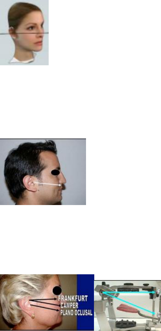 Linhas, eixos e planos anatômicos Plano de Frankfurt ou Linha infra-orbitomeatal O Plano de Frankfurt na fotografia passa pelo meio do trago no conduto auditivo externo e ponto onde se imagina que está a margem inferior da órbita. Pela palpação, no indivíduo ao vivo, pode-se localizar a borda inferior da órbita. O Ponto Orbitário é marcado por avaliação, sem precisão. Plano de Camper Linha de Camper é um linha imaginária que vai da borda inferior da asa do nariz a algum ponto definido do trago, na orelha, geralmente a ponta dele. Idealmente, o plano de Camper é considerado paralelo ao plano oclusal da arcada superior; este tem um ângulo de aproximadamente 10° em relação ao plano horizontal de Frankfurt, quando observado do plano sagital médio. Linha Bipupilar A linha bipupilar serve de referência para a orientação do plano oclusal e do plano incisal. Importância na montagem do ASA Na montagem do ASA o plano de Frankfurt estará paralelo ao arco facial e o plano de Camper paralelo ao plano da arcada superior. Eixos e Planos A. Eixo súpero-inferior ou vertical (planos coronal e sagital) B. Eixo ântero-posterior (planos sagital e transversal/axial) C. Eixo látero-lateral (planos coronal e transversal/axial) Linhas, eixos e planos anatômicos