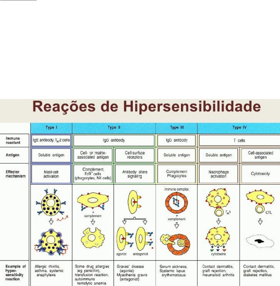 Imunologia- Hipersensibilidades tipo I e II Imunologia- Hipersensibilidades tipo I e II Introdução: Hipersensibilidade se refere às reações excessivas, indesejáveis (danosas, desconfortáveis e às vezes fatais) produzidas pelo sistema imune. Reações de hipersensibilidade requerem um estado pré-sensibilizado (imune) do hospedeiro. Reações de hipersensibilidade podem ser divididas em quatro tipos: tipo I, tipo II, tipo III e tipo IV, baseados nos mecanismos envolvidos e tempo levado para a reação. Frequentemente, uma condição clínica particular (doença) pode envolver mais de um tipo de reação. Atopia-> Alergia O que diferencia as hipersensibilidades é o tipo de mecanismo envolvido (células, imunoglobulinas...) Tanto a hipersensibilidade I quanto a II envolvem a ação de imunoglobulinas. Há a ativação de IgE e mastócitos na hipersensibilidade tipo I. Na hipersensibilidade tipo II há o envolvimento de fagócitos, sistema complemento e mediação das IgG e IgM. Os sintomas ocorrem de acordo com a via de entrada do alérgeno. Ex.: Inalação gera sintomas respiratórios... Hipersensibilidade tipo I: Hipersensibilidade tipo I é também conhecida como imediata ou hipersensibilidade anafilática. A reação pode envolver pele (urticária e eczema), olhos (conjuntivite), nasofaringe (rinorréia, rinite), tecidos broncopulmonares (asma) e trato gastrointestinal (gastroenterite). A reação pode causar uma variedade de sintomas desde inconveniências mínimas até a morte. A reação normalmente leva 15 - 30 minutos para o período de exposição ao antígeno, embora às vezes possa ter início mais demorado (10 - 12 horas). Hipersensibilidade imediata é mediada por IgE. O componente primário celular nessa hipersensibilidade é o mastócido ou basófilo. A reação é amplificada e/ou modificada pelos plaquetas, neutrófilos e eosinófilos. Uma biópsia do local da reação demonstra principalmente mastócitos e eosinófilos. Existe uma correlação genética nas respostas alérgicas. Por isso pais alérgicos provavelmente terão filhos alérgicos. O ambiente também influencia o aparecimento de alergias. Alérgenos inalados induzem a resposta de linfócitos TH2, que por sua vez ativam linfócitos B que produzem IgE. Os diversos alérgenos inalados que induzem rinites, asma e outras reações têm características comuns, como peso molecular reduzido, natureza protéica... A atividade enzimática de alguns alérgenos é capaz de penetrar nas barreiras epiteliais. A barreira epitelial das vias aéreas é formada por junções adesivas entre as células epiteliais. Partículas fecais do ácaro da poeira doméstica, Dermatophagoides pteronyssimus, contém a enzima proteolítica Derp 1, que atua como um alérgeno. Esta cliva a ocludina, uma proteína que ajuda a manter as junções adesivas, e assim destrói a função de barreira do epitélio. Antígenos fecais de ácaro podem atravessar e entrar em contato com as células dendríticas no tecido subepitelial. Derp 1 é capturada pelas células dendríticas, as quais são ativadas e se movem para os linfonodos (não mostrado), onde atuam como células apresentadoras de antígenos, induzindo a produção de células TH2 específicas para Derp 1 e a produção de IgE específica para Derp 1. Essa enzima pode ligar-se diretamente à IgE específica nos mastócitos residentes, desencadeando a ativação dos mastócitos. Mastócitos são encontrados em todos epitélios e tecidos conectivo, particularmente próximo aos vasos linfáticos e sangüíneos, e nervos. Pele e superfícies de membranas mucosas possuem altas concentrações. Possuem numerosos grânulos ligados ‘a membrana distribuídos pelo citoplasma, os quais assim como os basófilos, contêm mediadores farmacologicamente ativos. Após ativação esses mediadores são liberados dos grânulos, resultando nas manifestações clínicas de hipersensibilidade do tipo I. Mastócitos não são encontrados no sangue. Alguns exemplos de alérgenos comuns:Nem todo alérgeno protéico é uma enzima (proteína ativa). -Proteínas de pólen; -Proteínas de helmintos Mecanismo de resposta na hipersensibilidade tipo I: Linfócitos TH2 liberam IgE que se liga a receptores em mastócitos, ativando-os. Ao serem ativados, mastócitos sofrem diversas cascatas que levam a sua degranulação, liberando diversas substâncias que causam as reações alérgicas típicas. Os mediadores e citocinas liberados pelos mastócitos agem em vários tipos celulares, incluindo outros mastócitos, pois eles estimulam o aumento da produção e liberação de IgE que se ligará a novos mastócitos, levando à amplificação da resposta. A produção de IgE não é natural para causar alergias. Ela é originalmente específica para helmintos. Fase de sensibilização Mastócitos sensibilizados Hipersensibilidade tipo I Resposta imune efetora Fase efetora Resposta imune tardia Moléculas liberadas por mastócitos ativados: 1-Enzimas Ex.: Triptase, quinase, carboxpeptidade... Remodelam a matriz do tecido conjuntivo. 2-Mediadores tóxicos Ex.: Histamina e heparina. Tóxicos para parasitas, aumentam a permeabilidade vascular e causam contração do músculo liso. 3-Citocinas Ex.: IL-4, IL-5, IL-13,TNFa, etc. Diversas funções como ativação de eosinófilos, amplificam respostas de células TH2, promovem a inflamação... 4-Quimiocinas Ex.: CCL3. Atrai monócitos, macrófagos e neutrófilos. 5-Mediadores lipídicos Ex.: Leucotrienos, prostaglandinas, fator de ativação plaquetária... Estimulam a secreção de muco, agregação plaquetária, etc. A reação imediata deve-se a atividade da histamina, prostaglandinas, levando a um aumento da permeabilidade. A resposta tardia tem a ação de citocinas, que levam a uma resposta inflamatória (edema). Na fase imediata há mais mastócitos, na tardia além de mastócitos, há outros tipos celulares como linfócitos, eosinófilos e neutrófilos recrutados pelas cit