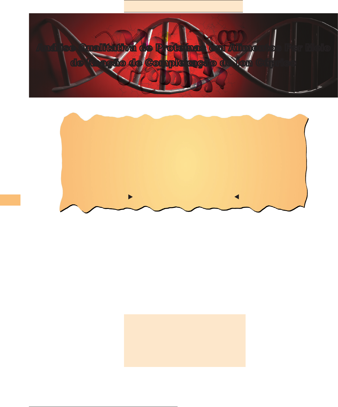 Análise Qualitativa de Proteínas em AlimentosQUÍMICA NOVA NA ESCOLA 34 Vol. 35, N° 1, p. 34-40, FEVEREIRO 2013 ExpErimEnto no Ensino dE Química Recebido em 12/09/2011, aceito em 14/08/2012 Vanessa Vivian de Almeida, Edmilson Antônio Canesin, Rúbia Michele Suzuki e Graciana Freitas Palioto O estudo das biomoléculas é comum às disciplinas de Química e de Biologia no ensino médio. Essas ciências, por sua vez, têm a experimentação como ferramenta importante do ensino-aprendizagem e da formação de conceitos. Nesse contexto, os alimentos tornam-se instrumentos contextualizadores do co- nhecimento químico que podem ser utilizados pelos professores em aulas práticas, possibilitando trabalhar conteúdos relacionados às biomoléculas. Este trabalho propõe um experimento simples, baseado na reação clássica de complexação entre cobre(II) e biureto, adaptada para detecção de proteínas em alimentos, pois utiliza materiais de fácil obtenção. compostos de coordenação, proteínas, biureto Análise Qualitativa de Proteínas em Alimentos Por Meio de Reação de Complexação do Íon Cúprico A seção “Experimentação no ensino de Química” descreve experimentos cuja implementação e interpretação contribuem para a construção de conceitos científicos por parte dos alunos. Os materiais e reagentes usados são facilmente encontráveis, permitindo a realização dos experimentos em qualquer escola. No organismo, as proteínas ingeridas dos alimentos são transformadas em cerca de 100.000 proteínas dos mais diversos tipos, totalizando um percentual médio de 15% da composição do organismo humano (Feltre, 2004). Proteínas As proteínas se caracterizam por ser o grupo mais abundante de macromoléculas, encontradas dentro e fora das células, e de importância vital aos seres vivos. Suas funções vão desde catálise de reações químicas (enzimas), transporte de outras moléculas, transmissão de impulsos nervosos, proteção imunitária e até mesmo função hormo- nal, entre outras. A alimentação humana deve incluir proteínas que são encontradas em carne, peixe, ovo, leite e derivados, entre outros. A Tabela 1 mostra que os alimentos mais ricos em proteínas são aque- les de origem animal. A grande maioria dos alimentos vegetais, como cereais, verduras, frutas, tubérculos, é pobre em proteína, com exceção das leguminosas (soja, amendoim, feijão etc.). No organismo, as proteínas ingeridas dos alimentos são transformadas em cerca de 100.000 proteínas dos mais diversos tipos, totalizando um percentual médio de 15% da composição do organismo humano (Feltre, 2004). As unidades constituintes fundamentais das proteínas são os aminoácidos. Estes, por sua vez, são moléculas or- gânicas que possuem ligadas ao mesmo átomo de carbono (denominado de carbono α) um átomo de hidrogênio, um grupo amino, um grupo carboxílico e uma cadeia lateral R (característica para cada aminoácido). Essa cadeia é o que difere os aminoácidos em estrutura, tamanho e propriedade físico-química (Francisco Jr. e Francisco, 2006). Os aminoácidos podem for- mar macromoléculas pela liga- ção do grupo carboxila de um aminoácido com o grupo amino de outro. Essa ligação carbono- -nitrogênio, chamada ligação peptídica, é obtida formalmente por exclusão intermolecular de uma molécula de água (Figura 1), o que leva à formação de uma cadeia polipeptídica, denomi- nada de estrutura primária da proteína. A estrutura primária é a sequência linear específica de aminoácidos da cadeia polipeptídica, sendo essa sequência muito importante, pois determinará as propriedades biológicas das proteínas. A função da proteína está intimamente relacionada com sua forma tridimensional. Essa conformação é obtida pelo dobramento da estrutura primária em secundária que, por sua Análise Qualitativa de Proteínas em AlimentosQUÍMICA NOVA NA ESCOLA 35 Vol. 35, N° 1, p. 34-40, FEVEREIRO 2013 vez, sofre mais dobramentos até chegar à estrutura terciária (Figura 2). Esta é mantida por interações fracas não cova- lentes e também por ligações dissulfeto (ligação covalente) entre as cadeias laterais dos aminoácidos (Figura 3). Moléculas de proteínas são relativamente grandes por serem formadas pela união sequencial de dezenas, centenas ou milhares de aminoácidos e podem ser formadas por uma ou mais de uma cadeia polipeptídica (estrutura quaternária) (Marzzoco e Torres, 2007). Embora possam ser encontra- das proteínas de alto peso molecular devido ao número de aminoácidos constituintes – como a proteína muscular conectina, com quase 27.000 aminoácidos e peso molecular de aproximadamente 3.000.000 –, a maioria das proteínas celulares possui menos de 2.000 aminoácidos. A insulina produzida pelo pâncreas, por exemplo, con- trola os níveis de açúcar no sangue após as refeições e é uma pequena proteína constituída por duas cadeias polipeptídicas, contendo 30 e 21 aminoácidos, respectivamente. Essas duas cadeias são ligadas entre si por duas pontes dissulfetos entre os grupos sulfidrilas das cadeias laterais dos aminoácidos cisteína (Figura 4). Já a enzima ribonuclease, também produzida no pân- creas, catalisa a hidrólise no intestino delgado dos ácidos Tabela 1: Conteúdo proteico dos alimentos. Alimento1 Teor de proteína (g/100 g de alimento) Carne bovina 27 Queijo prato 26 Fígado bovino 26 Carne de frango 24 Carne de porco 24 Peixe 23 Soja 17 Ovo 13 Feijão 6,0 Ervilha 6,0 Aveia 3,7 Leite de vaca2 3,5 Milho 2,4 Arroz 2,0 Batata 1,9 Banana 1,3 Gelatina3 1,2 Cenoura 1,0 Laranja 0,84 Mandioca 0,65 Maça 0,21 1 Alimentos cozidos, exceto frutas e cenoura. 2 Leite contém caseína, uma proteína de excelente valor nutri- cional, mas com alto teor de água. 3 Alguns produtos comercializados com gelatina contêm pre- dominantemente carboidratos. Fonte: Marzzoco e Torres, 2007. Figura 1: Formação da ligação peptídic
