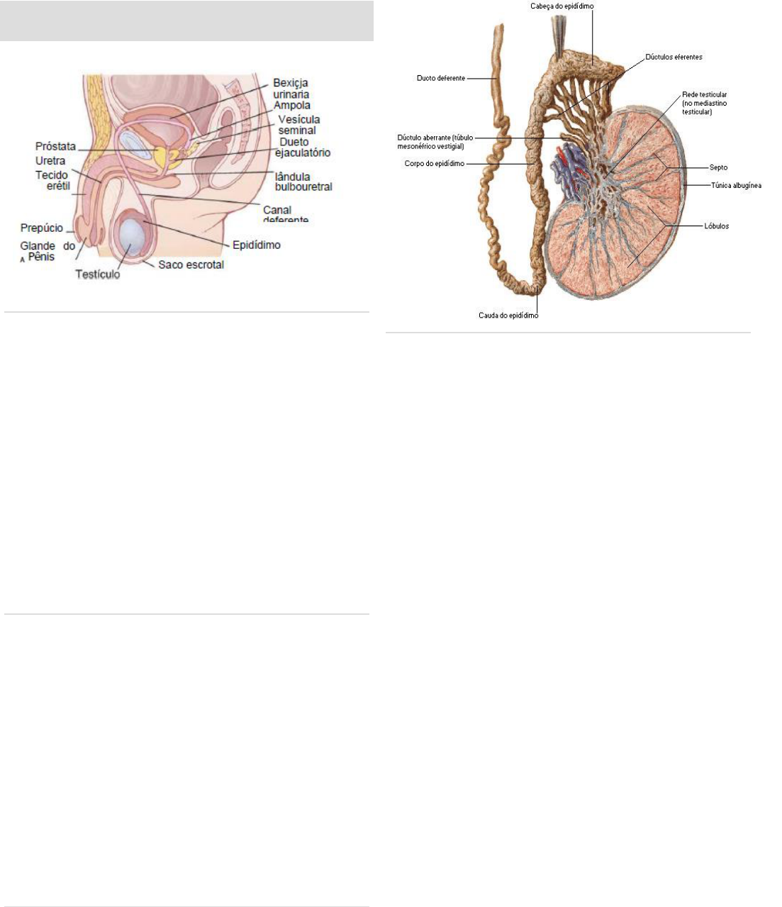 Medicina - Letícia Ataíde ANATOMIA E FISIOLOGIA DO SISTEMA REPRODUTOR MASCULINO Sêmen É o liquido ejaculado durante o ato sexual. Composto por espermatozoides (10%), líquidos da vesícula seminal (60%), líquido da próstata (30%), e pequenas quantidades de liquido das glândulas mucosas, especialmente as bulbouretrais. O liquido prostático dá ao sêmen uma aparência leitosa, e os líquidos das vesículas seminais e das glândulas mucosas dão ao sêmen o aspecto mucoso. Uma enzima coaguladora, do liquido prostático, também faz com que o fibrinogênio do liquido da vesícula seminal forme um coágulo fraco de fibrina que segura o sêmen nas regiões profundas da vagina onde se situa o colo uterino. Alguns minutos depois o coágulo é dissolvido pela ação da fibriolisina, formada a partir da pré- fribriolisina prostática. Ou seja, nos primeiros minutos após a ejaculação o esperma permanece imóvel, por causa da viscosidade do coágulo. À medida que o coágulo se dissolve, o espermatozoide torna-se altamente móvel. Vesículas seminais: A vesícula é tubo tortuoso revestido por um epitélio secretor, que secreta um material mucoso contendo frutose, ácido cítrico e outras substâncias nutritivas, assim como grandes quantidades de prostaglandinas e fibrinogênio. As prostaglandinas auxiliam na fertilização de duas maneiras: (1) reagindo com o muco cervical feminino, tornando-o mais receptivo ao espermatozoide. (2) possivelmente, induzindo contrações peristálticas reversas para trás, no útero e nas trompas de falópio., movendo os espermatozoides em direção ao ovário. Cada vesícula seminal esvazia seu conteúdo no ducto ejaculatório imediatamente após o canal deferente ter despejado os espermatozoides, aumentando consideravelmente o volume do sêmen. Assim, o liquido da vesícula compõe a maior parte do sêmen e serve para o arraste dos espermatozoides através do ducto ejaculatório e da uretra. Próstata Secreta um liquido fino, leitoso, contendo cálcio, íon citrato, íon fosfato, enzima de coagulação e uma pós-fribrinolisina. É ligeiramente alcalino, característica muito importante para fertilização, o que ajuda a neutralizar a acidez dos outros líquidos seminais durante a ejaculação, uma vez que o liquido do canal deferente é relativamente ácido auxiliando a inibir a fertilidade do sptz, além disso, as secreções vaginais femininas também são ácidas – com pH DE 3,5 a 4. Os espermatozoides não adquirem a mobilidade necessária até que o pH dos líquidos que o envolvem seja aproximadamente de 6 a 6,5. Saco escrotal, testículo e epidídimo O testículo é um órgão par (direito e esquerdo), situado numa bolsa músculo-cutânea, denominada saco escrotal que está localizada logo atrás do pênis, na região anterior do períneo. Cada testículo tem forma ovoide, com o grande eixo quase vertical, e ligeiramente achatado no sentido lateromedial, do que decorre apresentar duas faces, duas bordas e duas extremidades. As faces são lateral e medial, as bordas anterior e posterior e a extremidades superior e inferior. A borda posterior é ocupada de cima a baixo por uma formação cilíndrica, mais dilatada para cima, que o epidídimo. A metade superior da borda posterior do testículo representa propriamente o hilo do mesmo, recebendo a denominação especial de mediastino do testículo. É através do mediastino que o testículo se comunica propriamente com o epidídimo. O testículo é envolto por uma cápsula de natureza conjuntiva, branco-nacarada que se chama túnica albugínea, a qual envia para o interior do testículo delgado septos conhecidos como séptulos dos testículos, os quais subdividem-nos em lóbulos. Nos lóbulos dos testículos encontramos grande quantidade de finos longos e sinuosos ductos, de calibre quase capilar, que são denominados túbulos seminíferos contorcidos. É nesses túbulos seminíferos contorcidos que se formam os espermatozoides. Os túbulos seminíferos convergem para o mediastino do testículos e vão se anastomosando, constituindo túbulos seminíferos retos, os quais se entrecruzam formando uma verdadeira rede (de Haller) ao nível do mediastino. No mediastino, os túbulos seminíferos retos desembocam em dez a quinze dúctulos eferentes, que do testículo vão à cabeça do epidídimo. 80% de cada testículo compreende a cerca de 900 túbulos seminíferos que contém as células germinativas (espermatogônias), células de sertoli e espermatozoides em vários estágios de desevolvimento. Os outros 20% correspondem ao tecido conjuntivo de sustentação, contendo as células de Leyding, secretoras de testosterona, vasos sanguíneos e linfáticos. Os sptz são transferidos dos túbulos seminíferos – cada túbulo seminífero está ligado a uma membrana basal, em que estão situadas as células germinativas e as células de sertoli – através dos ductos denominados ductos retos, ao epidídimo, onde são armazenados. Dali são transferidos pelo ducto deferente ao ducto ejaculatório, para emissão. Células De Sertoli: entre elas podem ser vistos sptz em diversos estágios de desenvolvimento, sendo os mais maduros mais próximos da superfície luminal do túbulo. Enrtre as células de sertoli as junções estreitas fornecem uma barreira efetiva ao sangue, impedindo que os produtos do esperma cheguem a corrente sanguínea, o que provocaria uma resposta imune. O seu citoplasma também Medicina - Letícia Ataíde filtra efetivamente qw substâncias circulantes, impedindo-as de atingir as células ali em desenvolvimento. Células intersticiais ou de Leyding: síntese hormonal da testosterona. Elas são praticamente inexistentes durante a infância, época em que os testículos quase não secretam testosterona, porém elas são numerosas no recém-nascido nos primeiros meses e vida e no homem adulto após a puberdade. Caso o epitélio germinativo seja destruído por raios X ou calor excessivo, essas c