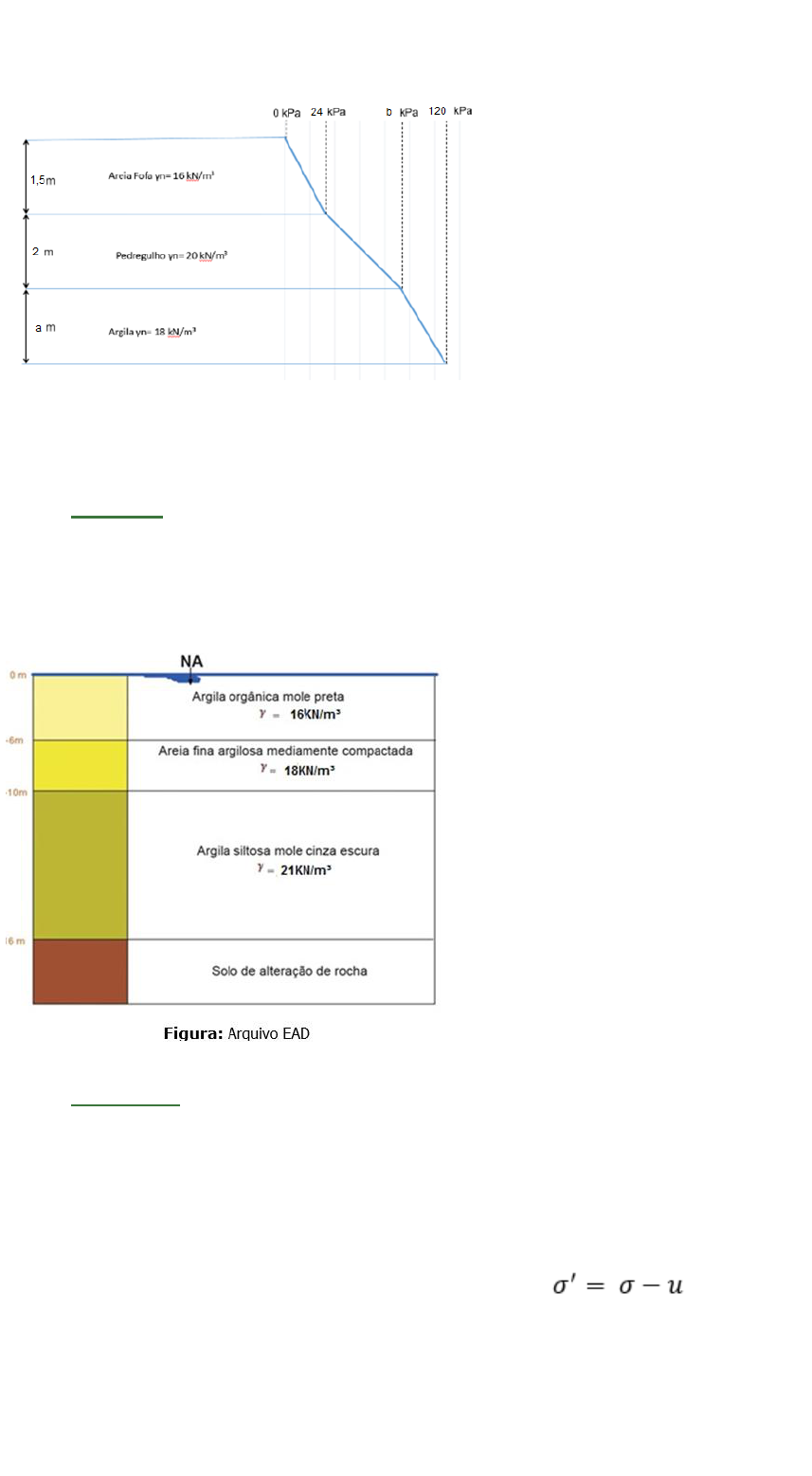 SEMANA 1 Para que a Figura esteja em concordância, os valores de a e b são respectivamente: 3,11 e 64. As tensões totais ao longo da profundidade onde a cota é -16 são, respectivamente: 294 KN/m³. Terzaghi (1943), observando tal efeito, estabeleceu o Princípio das Tensões Efetivas, que pode ser expresso em duas partes: a) A tensão efetiva, para solos saturados, pode ser expressa por: Sendo σ a tensão total e u a pressão neutra. b) Todos os efeitos mensuráveis resultantes de variações de tensões nos solos, como compressão, distorção e resistência ao cisalhamento são devidos a variações de tensões efetivas. Por meio do princípio de tensões efetivas podemos afirmar que na Figura: Quando se coloca um peso sobre a esponja (situação b), as tensões no interior da esponja aumentam e com o acréscimo de tensão, a esponja se deforma e expulsa água do seu interior para o meio, portanto o acréscimo de tensão foi efetivo. Já na situação (c), as tensões no interior da esponja seriam majoradas, mas neste caso a esponja não se deforma, a estrutura da esponja não se altera devido ao aumento de pressão causada pela água, portanto, o acréscimo de tensão foi neutro. Sobre a Figura acima e considerando os efeitos de capilaridade, podemos afirmar: 1) A cota Zw indica o início da pressão neutra. 2) A região onde a tensão total é igual a tensão efetiva é indicada por ZA. 3) O Solo saturado pertence a região (ZB – Zw). Está correto o que se afirma em: 2 e 3. Sobre capilaridade, podemos afirmar que: É a ascensão da água entre os interstícios de pequenas dimensões deixados pelas partículas sólidas, além do nível do lençol freático. A partir da figura a seguir: Marque a alternativa CORRETA: Os valores das tensões verticais atuantes nas camadas de solos, mostrando o efeito de somatório de ações atuantes nas camadas mais inferiores. Calcule a tensão efetiva total, no ponto D, dado que: H1= 5 m H2= 4 m H3= 3,7 m Yw = 10 Kpa 133,6 kPa. SEMANA 2 Considerando-se a ação da água no solo, na maioria dos casos em que se identifica a presença de nível d’água, pode-se subdividir o perfil em 3 zonas: Região não saturada; Zona capilar e Região saturada. Como se apresenta a poropressão nessas zonas, respectivamente? negativa, negativa, positiva Sobre a Figura acima e considerando as análises feitas no permeâmetro, podemos afirmar: Não há fluxo, pois na bureta que alimenta o permeâmetro a água se encontra na mesma cota (N.A.). Sendo k uma constante para cada solo, que recebe o nome de coeficiente de permeabilidade analisando a tabela juntamente com a Lei de Darcy, é correto afirmar que: 1) Um concreto bem dosado e vibrado sem fissuras tem coeficiente de permeabilidade da ordem de 10-12cm/segundo, o que seria próximo de uma Argila. 2) Quanto maior o valor de k menor a vazão. 3) K e a Área são diretamente proporcionais. Está correto o que se afirma em: Apenas 1. Sobre a Figura acima correlacionada com a Lei de Darcy aplicada a um permeâmetro de carga constante, podemos afirmar: Durante o ensaio mede-se o volume e o tempo t. O corpo de prova tem altura L e seção transversal de área A determinada anteriormente, e h é a altura constante do permeâmetro. Sobre fatores que influenciam na permeabilidade do solo, podemos afirmar que: 1) Considerando que os vazios do solo estão interligados entre si, podemos imaginá-los formando tubos capilares. Logo, a velocidade de percolação da água nos interstícios do solo será proporcional ao quadrado da dimensão dos mesmos, ou seja, a velocidade aumenta quando se aumenta a dimensão dos vazios. Por outro lado, é evidente que as dimensões dos vazios em um solo são proporcionais ao tamanho dos grãos que o formam. Logo, podemos concluir que a permeabilidade varia a grosso modo com o quadrado do tamanho dos grãos. 2) A disposição das partículas que formam a estrutura de um solo, tem influência sensível na permeabilidade dos solos. Nos solos estratificados, onde os grãos estão dispostos segundo uma direção preponderante, a permeabilidade no sentido horizontal é maior do que no sentido vertical. 3) O grau de saturação dos solos tem influência marcante na permeabilidade. Verifica-se que a presença de ar, mesmo em pequenas quantidades, dificulta a passagem da água pelos poros, resultando então maiores permeabilidades à medida que os solos tendem a tornar-se saturados. Está correto o que se afirma em: 1, 2 e 3. A água se desloca no interior do solo quando é submetida a diferenças de potencial, o estudo da condutividade hidráulica dos solos tem importância pois este estudo implica em um grande número de problemas práticos. Assinale a alternativa que lista alguns dos problemas citados: Nos estudos de estabilidade e no cálculo das vazões. Sobre a permeabilidade do solo, podemos afirmar que: 1) A permeabilidade pode influenciar a taxa de recalque de um solo saturado quando sob carga. 2) A estabilidade dos taludes e estruturas de retenção podem ser severamente afetadas pela permeabilidade de solos envolvidos. 3) É fundamental para avaliar a quantidade de percolação subterrânea para resolver problemas referentes ao bombeamento de água subterrânea das escavações da construção. Está correto o que se afirma em: 1, 2 e 3. A força de percolação ocorre nos solos onde existe um fluxo de água, desenvolve-se uma pressão efetiva chamada pressão de percolação. Sobre a força de percolação, podemos afirmar que: As forças de percolação são quase sempre as responsáveis pela instabilidade de maciços terrosos, tais como cortes, taludes de aterros e de barragens de terra. SEMANA 3 Diz-se que um fluxo é unidimensional quando este ocorre sempre na mesma direção. Quando as partículas de água se deslocam em qualquer direção através do solo, o fluxo é tridimensional. A migração de água para um poço, por exemplo, é tridimensional. Sobre a afirmação e a figur