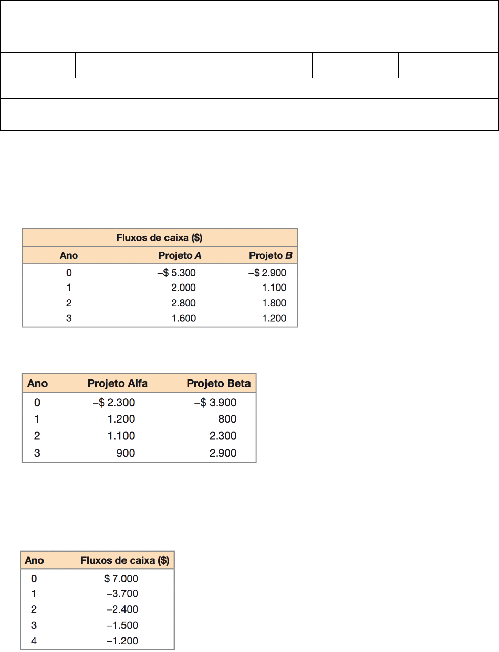 UNIVERSIDADE FEDERAL DO CEARÁ – UFC FACULDADE DE ECONOMIA, ADMINISTRAÇÃO, ATUÁRIA E CONTABILIDADE CURSO DE CIÊNCIAS ATUARIAIS DISCIPLINA ED139 - FINANÇAS CORPORATIVAS PROFESSOR SÉRGIO CARDOSO LISTA DE EXERCÍCIOS – REGRAS DE ANÁLISE DE INVESTIMENTO NOME 1) Cálculo do payback descontado Um projeto de investimento tem fluxos de caixa anuais de $ 5.000, $ 5.500, $ 6.000 e $ 7.000, e uma taxa de desconto de 14%. Qual é o período de payback descontado para esses fluxos de caixa se o custo inicial for $ 8.000? E se o custo inicial for $ 12.000? E se ele for $ 16.000? 2) Cálculo da TIR Calcule a taxa interna de retorno dos fluxos de caixa dos dois projetos a seguir: 3) Cálculo do índice de lucratividade Suponha que as duas oportunidades de investimentos independentes a seguir estejam disponíveis para a empresa Campo Verde. A taxa de desconto apropriada é 10%. a. Calcule o índice de lucratividade de cada um dos dois projetos. b. Qual(is) projeto(s) a Campo Verde deve aceitar com base na regra do índice de lucratividade? 4) Problemas com a TIR Suponha que lhe ofereçam $ 7.000 hoje, mas que você tenha que fazer os seguintes pagamentos: a. Qual é a TIR dessa oferta? b. Se a taxa de desconto apropriada for 10%, você deve aceitar essa oferta? c. Se a taxa de desconto apropriada for 20%, você deve aceitar essa oferta? d. Qual é o VPL da oferta se a taxa de desconto apropriada for 10%? E se for 20%? e. As decisões segundo a regra do VPL na parte (d) são consistentes com a regra da TIR? 5) VPL versus TIR Considere os fluxos de caixa a seguir em dois projetos mutuamente excludentes para a Férias em Noronha S/A (FNSA). Ambos os projetos exigem um retorno anual de 14%. Como analista financeiro da FNSA, perguntam-lhe o seguinte: a. Se sua regra de decisão é aceitar o projeto com a maior TIR, qual projeto você deve escolher? b. Como você está totalmente ciente do problema de escala da regra da TIR, calcula a TIR incremental dos fluxos de caixa. Baseado em seus cálculos, qual projeto você deve escolher? c. Para ser prudente, você calcula o VPL de ambos os projetos. Qual projeto você deve escolher? Ele é coerente com a regra da TIR incremental? 6) Avaliação do VPL A CêFoi S/A quer abrir um negócio de cemitérios particulares. De acordo com o diretor financeiro, Alberto Profundo, os negócios estão “melhorando”. Como resultado, o projeto do cemitério trará uma entrada de caixa liquida de $ 290.000 para a empresa durante o primeiro ano, e os fluxos de caixa têm projeção de crescimento a uma taxa de 5% ao ano para sempre. O projeto exige um investimento inicial de $ 3.900.000. a. Se a CêFoi exigir um retorno de 11% sobre tais empreendimentos, o negócio de cemitérios deve ser começado? b. A empresa está um pouco insegura a respeito da premissa de uma taxa de crescimento de 5% em seus fluxos de caixa. A qual taxa de crescimento constante a empresa atingiria o equilíbrio se ainda precisasse de um retorno de 11% sobre o investimento? 7) Cálculo da TIR A Aurífera Cia. Mineradora S/A está disposta a abrir uma mina de ouro perto de Ourolândia. De acordo com o tesoureiro, Auro Goldstein, “Essa é uma oportunidade de ouro”. A mina custará $ 2.400.000 para ser aberta e terá uma vida econômica de 11 anos. Ela irá gerar uma entrada de caixa de $ 345.000 no fim do primeiro ano, e os fluxos de caixa têm projeção de crescimento a 8% por ano pelos próximos 10 anos. Depois de 11 anos, a mina será abandonada. As despesas de abandono serão de $ 400.000 no fim do ano 11. a. Qual é a TIR da mina de ouro? b. b. A Aurífera Cia. Mineradora exige um retorno de 10% em tais empreendimentos. A mina deve ser aberta? 8) VPL e TIR A Maitre Internacional Ltda. está avaliando um projeto em Aquionde. O projeto irá gerar os seguintes fluxos de caixa: Todos os fluxos de caixa ocorrerão em Aquionde e são expressos em dólares. Em uma tentativa de melhorar sua economia, o governo de Aquionde declarou que todos os fluxos de caixa criados por uma empresa estrangeira estão “bloqueados” e devem ser reinvestidos com o governo por um ano. A taxa de reinvestimento desses fundos é de 4%. Se a Maitre usar um retorno exigido de 11% sobre esse projeto, quais serão o VPL e a TIR dele? A TIR que você calculou é a TIRM do projeto? Por quê? 9) Cálculo da TIR Considere duas séries de fluxos de caixa, A e B. O primeiro fluxo de caixa da Série A é de $ 8.900 e é recebido daqui a três anos. Os fluxos de caixa futuros na Série A aumentam a 4% em perpetuidade. O primeiro fluxo de caixa da Série B é de 2$ 10.000, recebido daqui a dois anos, e continuará em perpetuidade. Suponha que a taxa de desconto apropriada seja 12%. a. Qual é o valor presente de cada série? b. Suponha que as duas séries sejam combinadas em um projeto, chamado de C. Qual é a TIR do Projeto C? c. Qual é a regra da TIR correta para o Projeto C? 10) Comparação de critérios de analise de investimentos Considere os seguintes fluxos de caixa de dois projetos mutuamente excludentes para a Tokyo Cia. de Borrachas. Suponha que a taxa de desconto para a Tokyo seja 10%. a. Com base no período de payback, qual projeto deve ser escolhido? b. Com base no VPL, qual projeto deve ser escolhido? c. Com base na TIR, qual projeto deve ser escolhido? d. Com base nessa análise, a análise da TIR incremental é necessária? Se for, realize a análise. BIBLIOGRAFIA ROSS, Stephen A., Randolph WESTERFIELD, Jeffrey JAFFE, Roberto LAMB. Administração Financeira, 10th Edition. AMGH, 01/2015. VitalBook file.