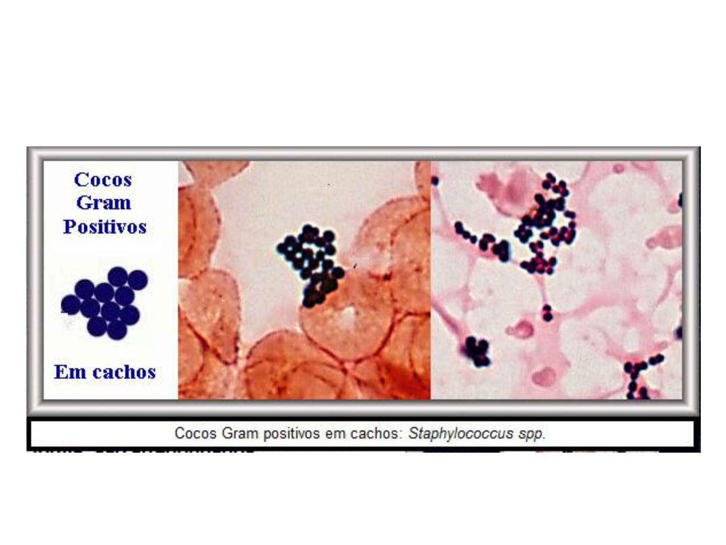 * Isolamento e identificação dos Estafilococos Profa. Paula Gonçalves * Importância Clínica dos Estafilococos Staphylococcus aureus (1º) Foliculite e hordéolo Furúnculos carbúnculo Impetigo não bolhoso e bolhoso Síndrome da pele escaldada Intoxicação alimentar (produção de enterotoxinas) Síndrome do choque tóxico (toxina) Infecções hospitalares Osteomielite Endocardite Bacteremia MRSA (Staphylococcus aureus resistente à meticilina) VRSA (Staphylococcus aureus resistente à vancomicina) VISA (Staphylococcus aureus com resistencia intermediária à vancomicina) * Staphylococcus epidermidis (2º) 90% da microbiota normal da pele patogênico quando a barreita da pele é rompida ou invadida por procedimentos médicos (inserção ou remoção de cateteres venosos, por exemplo. Staphylococcus saprophyticus (3º) Importância Clínica dos Estafilococos * Staphylococcus aureus Uma das espécies patogênicas mais comuns, sendo a mais virulenta espécie do seu gênero. Cresce bem em ambientes salinos. Cerca de 15% dos individuos são portadores de S.aureus, na pele ou nasofaringe. A infecção é frequentemente causada por pequenos cortes na pele. As toxinas são proteínas produzidas e secretadas ou expostas à superficie pela bactéria cuja atividade é destrutiva para as células humanas. * Enzimas estafilocócicas: Coagulase: Ligada a parede celular do S.aureus, converte o fibrinogênio em fibrina insolúvel. Catalase; transforma o peróxido de hidrogênio em oxigênio e água. Hialuronidade: hidrolisa o ac. hialurônico, os mucopolissacarídeos presentes no tecido conjuntivo, facilitando a disseminação do staphilo. Lipases: hidrolisam lipídeos para garantir a sobrevivência nas áreas sebáceas do corpo. Invadem o tecido cutâneo e subcutâneo * Staphylococcus aureus Leucocidinas: substância que potencialmente destrói os leucócitos. Estafiloquinases: substância que inibe a coagulação do sangue ativando o sistema fibrinolítico. Penicilase: (beta-lactamase): a disseminação dessa enzima foi garantida pela sua presença em plasmídeos transmissíveis. * Foliculite * Hordéolo * Furúnculo - abcesso * Abcessos * Carbúnculo * Impetigo * Impetigo Dermatose superficial, muito comum em crianças pequenas Pode afetar qualquer segmento da pele, sendo a face e as mãos os locais mais comuns. Um ferimento mal higienizado favorece o desenvolvimento de infeções bacterianas em geral, incluindo o impetigo. * Impetigo bolhoso * Pemphygus neonatorum – Impetigo do neonato * Síndrome da pele escaldada Toxina: Esfoliatina Síndrome da pele escaldada Doença epidermolítica, mediada por exotoxinas que se caracteriza por eritema, desprendimento generalizado das camadas superficiais da epiderme, envolvendo, principalmente, crianças até os 5 anos de idade * Síndrome do choque tóxico *fibras sintéticas e produtos químicos que ampliavam sua absorção; ** voltaram a utilizar fibras de algodão e cessaram com o acréscimo desses produtos químicos * ** Toxina: Toxina da Síndrome do Choque tóxico (TSCT-1) * Síndrome do Choque Tóxico está mais associada a cirurgias nasais e bandagens absorventes pós incisões cirúrgicas * Choque tóxico Intoxicação multissistêmica carcterizada por febre, hipotensão e erupção eritematosa e difusa Apresenta alta mortalidade quando não tratada. * Osteomielite * Intoxicação alimentar * Staphylococcus epidermidis Pertence a flora normal da pele e mucosas. Não produz toxinas. É considerado espécie de estafilococus coagulase negativo e catalase positiva de maior prevalência e persistência na pele humana. É identificado como agente de bacteremia de origem hospitalar e infecções associadas a implantações de próteses (válvulas) cardíacas, articulares e de catéteres intravenosos e peritonias. * Staphylococcus epidermidis Possui uma capacidade de formar biofilmes, dificultando a chegada de drogas antibacterianas e células fagocíticas no foco de infecção. Mais comum a ocorrência de infecção no local da sutura. Identificação da espécie pode ser feito após prova de Catalase e Coagulase com um antibiograma evidenciando a sua sensibilidade a Novobiocina. * Staphylococcus saprophyticus Causam infecções nas vias urinárias em mulheres jovens sexualmente ativas. As mulheres infectadas apresentam disúria (dor ao urinar), piúria (pus na urina) e numerosos microorganismos na urina. Respondem rapidamente a antibióticos e é rara a ocorrência de re-infecção. * Staphylococcus saprophyticus Disposta em cachos, tétrades ou duplas. Apresenta-se como coagulase negativa e catalase positiva. É resistente à novobiocina (ß-lactâmicos) sendo fator de pesquisa para identificação da espécie. * Isolamento dos Estafilococos * Identificação de Estafilococos 1) Prova da Catalase 2) Prova da Coagulase 3) Resistência à Novobiocina 4) Crescimento em ágar Manitol 5) Prova da DNAse * Prova da Catalase OBS: Cuidado para não coletar ágar sangue junto com a colônia usada no teste falso positivo porque o sangue do agar contém catalase. * Prova da Catalase Staphylococcus spp Streptococcus spp * Prova da Coagulase Inocular colônia de bactéria em plasma de coelho incubar 37 ºC por 1-4 horas e observar formação de fibrina * Prova da coagulase em tubo * Staphy test *o teste se baseia na capacidade do Staphylococcus aureus aglutinar hemácias de carneiro previamente sensibilizadas com hemolisina e fibrinogênio; * Fermentação em ágar manitol (7,5 de NaCl) O ágar manitol é um meio de cultura seletivo. Possui grande concentração de NaCl (6,5 a 7,5%) e indicador de pH vermelho de fenol - vermelho em pH alcalino e neutro; amarelo em pH ácido. A fermentação do manitol pelas bactérias, leva a produção de ácidos, o que determina a mudança de cor do vermelho para o amarelo. Positivo para Staphyloccus aureus. Algumas amostras podem positivar para S.saprophyticcus. * Ágar Manitol (7,5% NaCl) Manitol salgado Crescimento e ferme