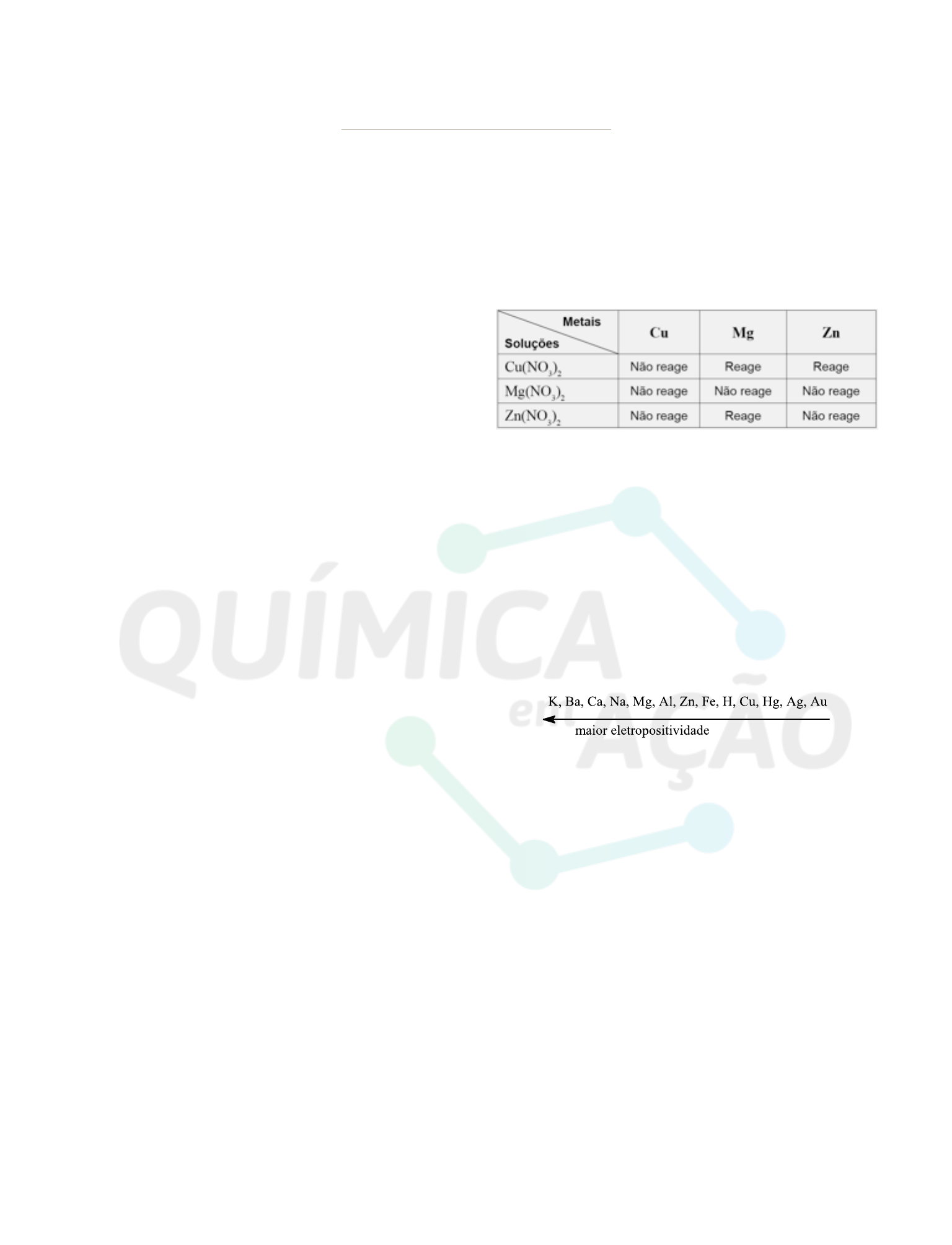 01 - (CEFET PR) O alumínio se dissolve em ácido clorídrico aquoso, mas não em ácido nítrico. O ácido nítrico é um poderoso oxidante e fonte de oxigênio, de modo que oxida rapidamente a superfície do alumínio, formando uma película que protege o metal contra ataque ácido. A proteção é tão eficiente que o ácido nítrico pode ser transportado em veículos com tanque de alumínio. Indique a alternativa que apresenta a equação equilibrada do alumínio com ácido clorídrico. a) 3 HCl(aq) + Al(s) → AlCl3(aq) + H2O(l) b) 3 HCl(aq) + Al(s) → AlCl3(aq) + 3 H2(g) c) 6 HCl(aq) + 2 Al(s) → 2 AlCl3(aq) + 3 H2(g) d) 6 HCl(aq) + 2 Al(s) → 2 AlCl3(aq) + H2O(l) e) 6 HCl(aq) + Al2O3(s) → 2 AlCl3(aq) + 3 H2O(l) 02 - (UFTM MG) Uma lâmina de zinco desgasta-se, com efervescência, se for mergulhada em uma solução aquosa 1,0 mol/L a 25ºC de a) NaCl. b) HCl. c) KNO3. d) CuSO4. e) NH4CH3COO. 03 - (UFMG) Num laboratório, foram feitos testes para avaliar a reatividade de três metais: cobre, Cu, magnésio, Mg, e zinco, Zn. Para tanto, cada um desses metais foi mergulhado em três soluções diferentes: uma de nitrato de cobre, Cu(NO3)2, uma de nitrato de magnésio, Mg(NO3)2, e uma de nitrato de zinco, Zn(NO3)2.Neste quadro, estão resumidas as observações feitas ao longo dos testes: Considerando-se essas informações, é CORRETO afirmar que a disposição dos três metais testados, segundo a ordem crescente de reatividade de cada um deles, é: a) Cu / Mg / Zn . b) Cu / Zn / Mg . c) Mg / Zn / Cu . d) Zn / Cu / Mg . 04 - (MACK SP) Analisando a fila de eletropositividade em ordem decrescente, verifica–se que a única reação que não ocorre é a) Hg + Al(NO3)3 → b) Fe + H2SO4 → c) Cu + AgNO3 → d) Mg + FeSO4 → e) Zn + HCl → 05 - (UFRJ) Reações de deslocamento ou simples troca são aquelas em que uma substância simples de um elemento mais reativo desloca outro de uma substância composta. Um exemplo de reação de deslocamento, em que o cálcio desloca o hidrogênio, é apresentado a seguir: Ca(s) + 2 HNO3(aq) →Ca(N03)2(aq) + H2(g) a) Qual o nome do sal formado nessa reação? b) Por analogia, apresente a equação da reação em que o alumínio desloca o hidrogênio do ácido clorídrico. L ISTA DE EXERCÍCIOS 25 17 QUÍMICA GERAL - MÓDULO 08 REAÇÃO DE DESLOCAMENTO OU SIMPLES TROCA 01 - (CEFET PR) Gab: C 02 - (UFTM MG) Gab: B 03 - (UFMG) Gab: B 04 - (MACK SP) Gab: A 05 - (UFRJ) Gab: a) Nitrato de Cálcio b) 2Al + 6HCl → 2AlCl3 + 3H2 GABARITO L ISTA 25 18 QUÍMICA GERAL - MÓDULO 08 01 - (PUC RS) Adicionou-se uma porção de magnésio a uma solução de ácido clorídrico em um frasco de erlenmeyer. Na boca do frasco adaptou-se um balão de borracha bastante flexível. Após algum tempo, o balão encheu-se de gás. O balão ascendeu após ter sua ponta amarrada e ser solto no ar. Ao se aproximar dele um palito de fósforo aceso, o balão explodiu.Com base nessas informações, é correto afirmar que a) o gás formado na primeira reação é o óxido de magnésio. b) o produto gasoso formado na reação de combustão é mais denso que o ar, em idênticas condições. c) a reação da combustão do gás é representada por H2(g) +1/2 O2(g) → H2O(g). d) na reação com o ácido, o metal sofre redução do seu estado de oxidação. e) a necessidade da chama indica que a reação de combustão não é espontânea. 02 - (UNIR RO) Considere o seguinte experimento: Em um tubo de ensaio contendo uma certa quantidade de zinco em pó, colocou-se uma quantidade suficiente de solução aquosa de sulfato de cobre II. Na sequência, o tubo foi agitado. Depois de certo tempo de repouso, o que é possível observar? a) O sistema libera gás e torna-se incolor. b) O sistema absorve energia deixando o tubo congelado. c) O zinco em pó volta a se depositar no fundo do tubo. d) Deposita-se cobre metálico no fundo do tubo e a solução torna-se incolor. e) Não ocorre qualquer reação química e o sistema permanece inalterado. 03 - (MACK SP) O escurecimento de uma corrente de prata, devido à formação de sulfeto de prata, decorre de sua exposição ao ar. Esse escurecimento pode ser eliminado, colocando-se a corrente, por certo tempo, em uma panela de alumínio contendo solução aquosa de bicarbonato de sódio (NaHCO3). Desse processo, equacionado abaixo, pode-se afirmar que a) o alumínio é menos eletropositivo que a prata, deslocando-a. b) após a retirada das manchas escuras, a massa de prata da corrente será bem menor que a massa de prata inicial. c) forma-se sulfato de alumínio. d) a prata é reduzida, voltando a depositar-se na corrente, de modo que a massa final de prata na corrente é igual à massa inicial. e) o bicarbonato de sódio em água torna o meio ácido, protegendo a panela. 04 - (UESPI) De acordo com a ordem de reatividade, assinale a alternativa na qual a reação não ocorre. a) Zn + 2 HCl → H2 + ZnCl2 b) Fe + 2 HCl → H2 + FeCl2 c) Mg + H2SO4 → H2 + MgSO4 d) Au + 3 HCl → H2 + AuCl3 e) Zn + 2 AgNO3 → 2 Ag + Zn(NO3)2 05 - (UFRN) Nas cinco equações químicas enumeradas abaixo, estão representadas reações de simples troca, também chamadas reações de deslocamento: 1. Fe(s) + 2AgNO3(aq) → Fe(NO3)2(aq) + 2Ag(s) 2. 3 Ni(s) + 2AlCl3(aq) → 3NiCl2(aq) + 2Al(s) 3. Zn(s) + 2HCl(aq) → ZnCl2(aq) + H2(g) 4. Sn(s) + 2Cu(NO3)2(aq) → Sn(NO3)4(aq) + 2Cu(s) 5. 2 Au(s) + MgCl2(aq) → 2AuCl(aq) + Mg(s) L ISTA COMPLEMENTAR 25 49 QUÍMICA GERAL - MÓDULO 08 REAÇÃO DE DESLOCAMENTO OU SIMPLES TROCA Analisando essas equações, com base na ordem decrescente de reatividades (eletropositividades) mostrada a seguir, Mg > Al > Zn > Fe > Ni > H > Sn > Cu > Ag > Au pode-se prever que devem ocorrer espontaneamente apenas as reações de número: a) 3, 4 e 5. b) 2, 3 e 5. c) 1, 2 e 3. d) 1, 3 e 4. 50 01 - (PUC RS) Gab: C 02 - (UNIR RO) Gab: D 03 - (MACK SP) Gab: D 04 - (UESPI) Gab: D 05 - (UFRN) Gab: D GABARITO L ISTA COMPLEMENTAR 25 51 QUÍMICA GERAL - M