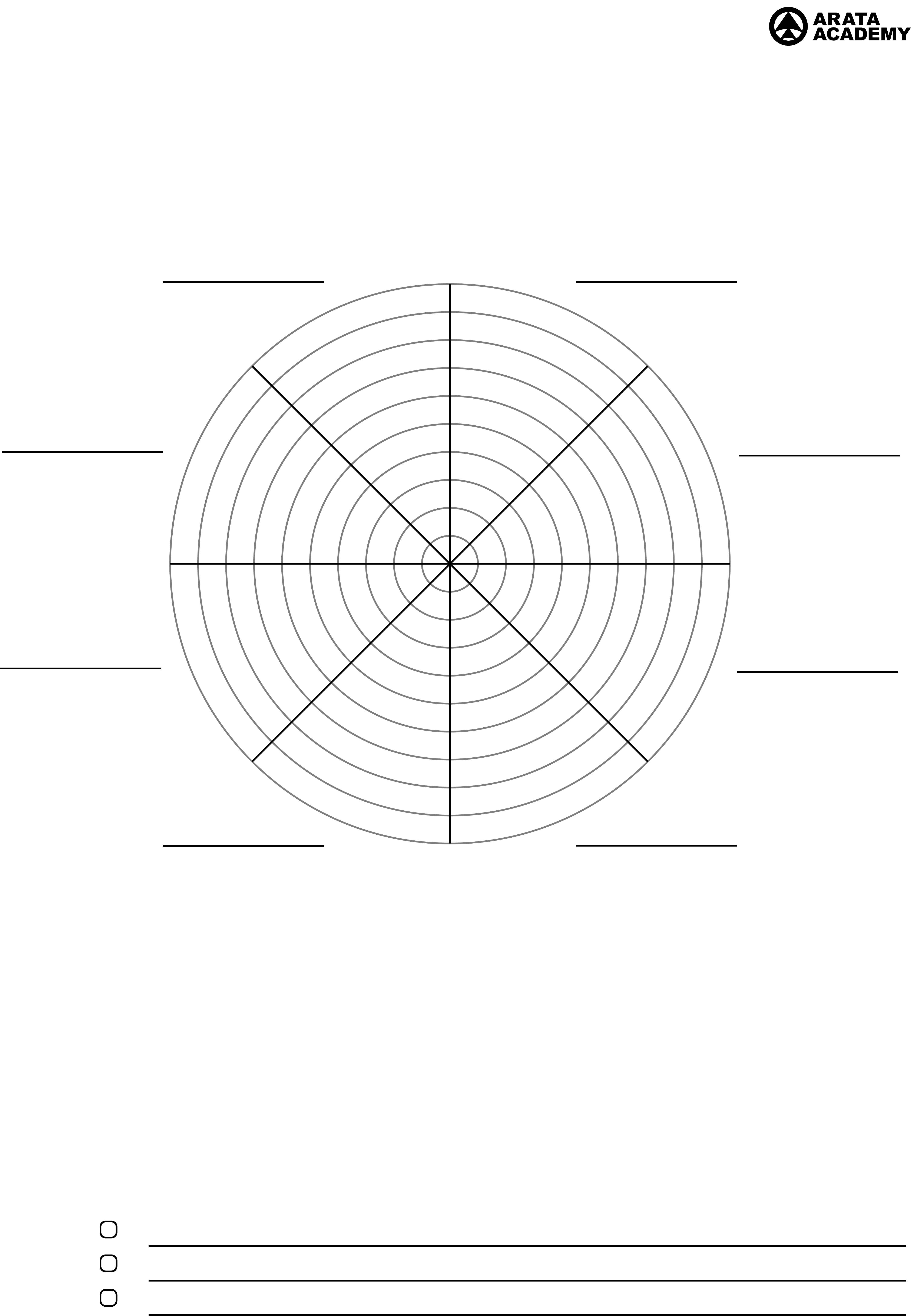 Exercício: Novo Ano Novo 1) Imprima esta folha para realizar o exercício 2) Veja atentamente o vídeo enviado por email para nossa lista (caso não tenha seu email cadastrado na nossa lista, inscreva-se em https://arata.se/exerciciooitodimensoes 3) Preencha o círculo conforme foi explicado no vídeo demonstrativo 4) Anote quais são as suas 3 próximas ações: Instruções: