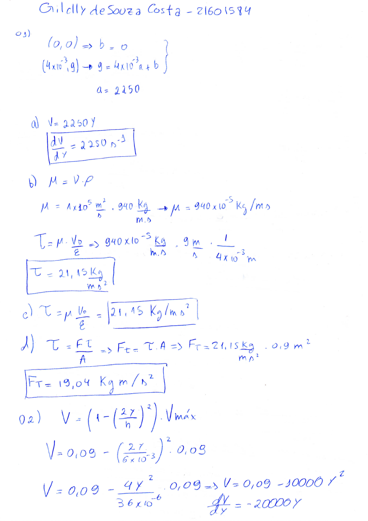 UNIVERSIDADE FEDERAL DO AMAZONAS FACULDADE DE TECNOLOGIA DEPARTAMENTO DE ENGENHARIA QUÍMICA FTQ021- FENÔMENOS DE TRANSPORTE 1 Professor Paulo Simonetti Discente: LISTA DE EXERCÍCIOS I 01. Considere o escoamento mostrado na figura abaixo onde o fluido é arrastado pelo movimento da placa superior, com velocidade 9 m/s, enquanto a placa inferior é imóvel. Se o espaço entre as duas placas for preenchido com óleo (ν = 0,1 St, ρ = 940 kg/m3). Determine: a) o gradiente de velocidade; b) a tensão de cisalhamento atuante no óleo; c) a tensão de cisalhamento na superfície da placa fixa em contato com o fluido; d) a força que deve ser vencida para puxar a placa superior com área de 0,9 m2. 02. O espaço entre duas placas paralelas fixas está preenchido com um fluido que escoa com viscosidade cinemática, ν = 6 x 10-2 cSt, e peso específico, γ = 8000 N/m3. A distribuição de velocidade para o escoamento laminar entre as placas é dada por: V Vmáx = 1 − ( 2y h ) 2 na qual h é a distância que separa as duas placas e a origem está situada na linha mediana entre as placas. Considere o escoamento de tal fluido com uma velocidade máxima Vmáx = 0,09 m/s. Se a distância entre as duas placas é h= 6 mm, qual deve ser a força atuante P sobre uma seção de 1 m2 da placa inferior? (Considerar g = 9,81 m/s2) 03. Um pistão, com 16 cm de diâmetro e 6 cm de comprimento, está dentro de um tubo cilíndrico estacionário com 18 cm de diâmetro interno, onde a sua superfície interna foi lubrificada com óleo de ν = 4 x 10-4 m/s2 e γ=10000 N/m3. O pistão é então colocado em movimento, cortando-se uma corda suporte. Tendo o conhecimento que a massa do pistão é 2,0 kg, estime a velocidade do pistão. Admita que o perfil de velocidade no filme de óleo é linear. (Usar g=9, 81 m/s2). UNIVERSIDADE FEDERAL DO AMAZONAS FACULDADE DE TECNOLOGIA DEPARTAMENTO DE ENGENHARIA QUÍMICA FTQ021- FENÔMENOS DE TRANSPORTE 1 04. A distribuição de velocidade para o escoamento laminar desenvolvido entre duas placas paralelas é dada por: V = 3Vmáx 2 [1 − ( 𝑦 ℎ ) 2 ] em que V é a velocidade, Vmáx é a velocidade máxima e y é a distância medida perpendicularmente às placas. Considerando que essas duas placas paralelas estão separadas por uma distância 2h e que o fluido apresenta viscosidade dinâmica igual a 2,50 N.s/m2 e admitindo Vmáx = 0,9 m/s e h = 8 mm, determine: a) a tensão de corte na parede inferior do desenho; b) a tensão de corte atuante no plano central entre as duas placas; c) o módulo da tensão de cisalhamento, também chamada de tensão de corte, a uma distância h/10 da placa superior. 05. A figura abaixo mostra um manômetro com tubo em U conectado a um tanque fechado que contém ar e água. A pressão de ar na extremidade fechada do manômetro é igual a 1.10 bar (abs). Determine a leitura no outro manômetro se a altura diferencial no manômetro com tubo em U é igual a 2439 mm. Obs: Admita que o valor da pressão atmosférica é o padrão e despreze o efeito do peso do ar nas colonas do manômetro. (Dados: γ = 16,25 kN/m3, para o fluido manométrico e γ = 10000 N/m3 para a água; Patm = 101325 Pa) 06. O tanque cúbico mostrado na figura contém três fluidos distintos (Ar, óleo e água) conectado a um manômetro em U. A massa específica da água é 1000 kg/m3. Sabendo que a pressão do ar contido no tanque é 13, 8 kPa, determine a leitura diferencial no manômetro, h. UNIVERSIDADE FEDERAL DO AMAZONAS FACULDADE DE TECNOLOGIA DEPARTAMENTO DE ENGENHARIA QUÍMICA FTQ021- FENÔMENOS DE TRANSPORTE 1 07. O fluido manométrico (Hg) do manômetro tipo U mostrado na figura abaixo apresenta densidade igual a 13,6 e os tubos A e B contém água, com ρ = 1000 kg/m3. Nestas condições, determine a diferença de pressão entre os tubos A e B que corresponde a condição mostrada na figura; 08. O tanque cilíndrico mostrado na figura abaixo é alimentado pelas seções (1) e (2) com as vazões indicadas na figura. Determine a velocidade média na seção de descarga do tanque, sabendo que o nível da água no tanque permanece constante ao longo do tempo. (Dados das vazões: Q1 = 8,8 litros/s; Q2 = 20,5 litros/s UNIVERSIDADE FEDERAL DO AMAZONAS FACULDADE DE TECNOLOGIA DEPARTAMENTO DE ENGENHARIA QUÍMICA FTQ021- FENÔMENOS DE TRANSPORTE 1 09. O tanque maior da figura abaixo permanece em nível constante. O escoamento na calha tem uma seção transversal quadrada e é bidimensional, obedecendo à equação v=3y2. Sabendo que o taque (B) tem 2 m3 e é totalmente preenchido em 10 segundos e que o conduto circular tem 40 cm de diâmetro, determinar: a) a velocidade média na calha quadrada; b) a vazão no conduto circular de 40 cm de diâmetro; c) a velocidade máxima na seção do conduto circular de 40 cm de diâmetro. 10. Uma calha com seção quadrada de 3 m x 3 m alimenta um reservatório de 3 m3 em 30 min. Considerando que o perfil de velocidade do escoamento na calha obedece a equação v=3y2 (m/s), onde y é expresso em metros. Sendo a viscosidade do fluido 1,89 x 10-7 Pa.s, determine: a) O gradiente de velocidade na forma diferencial; b) O nível do fluido na calha (H); c) A tensão de cisalhamento para y = 0; y = H/3; y = H/2; y = H; d) O esboço do perfil de velocidade; e) A velocidade média do escoamento; f) Explique por que não foi nula a tesão de cisalhamento em H.