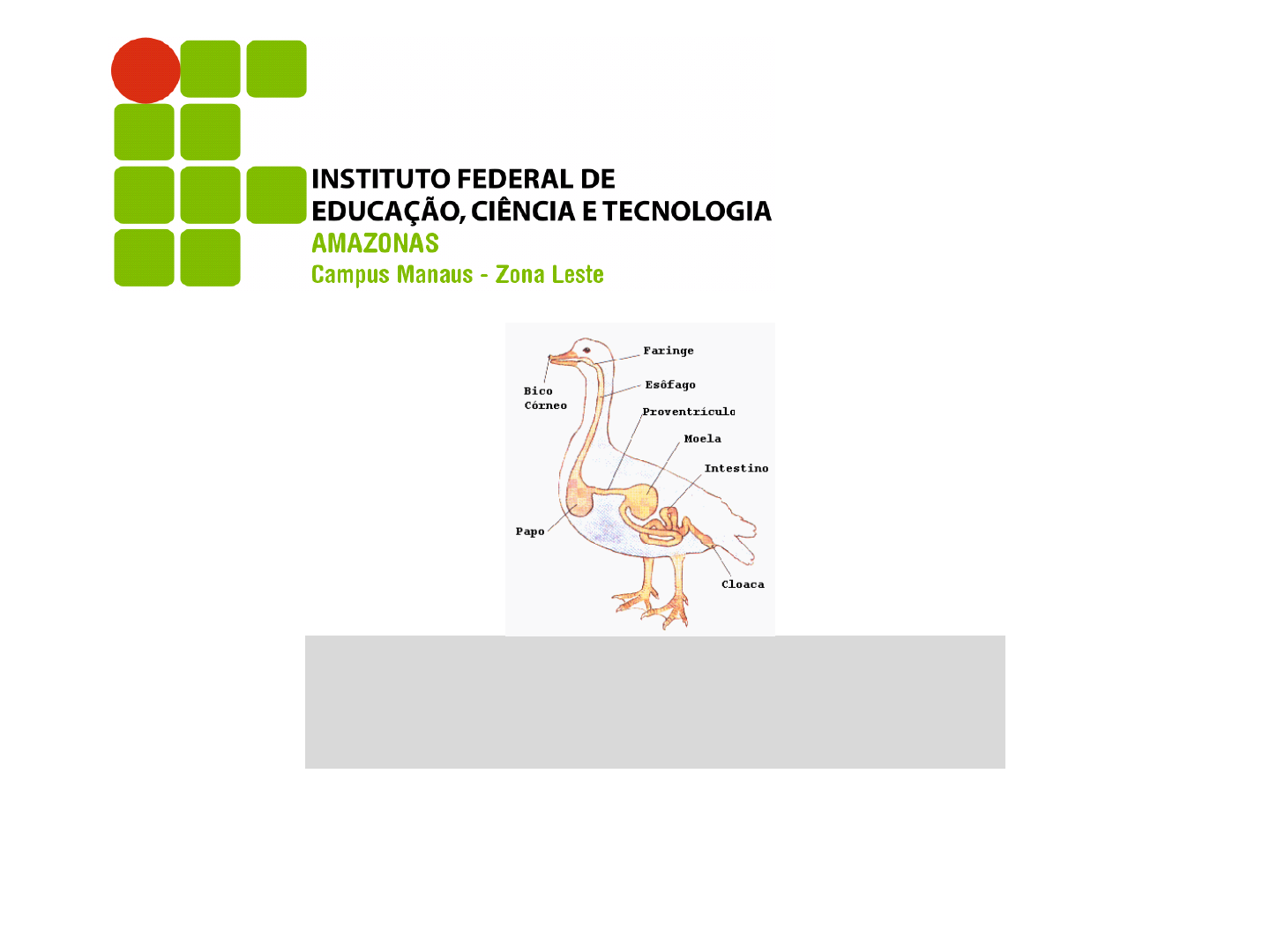 – DISCIPLINA: ANIMAIS DE PEQUENO PORTE ANATOMIA E FISIOLOGIA DAS AVES 2014 Manaus - AM Profa.: Anísia Karla de Lima Galvão A AVE - UMA MÁQUINA PERFEITA Animal vertebrado, de “sangue quente” (homeotérmicos ou endodérmicos ), coberto de plumas, ovíparo (põe ovos) e com alto ritmo metabólico. CONCEITO AVES HOMEM RESPIRAÇÃO 40 a 50 vezes por minuto. 16 a 24 vezes por minuto. BATIDAS DO CORAÇÃO 300 vezes por minuto. 60 a 85 vezes por minuto. HOMEOTERMIA - capacidade que alguns animais apresentam de manter, aproximadamente constante, a temperatura interna do corpo, embora a temperatura ambiental varie. São reconhecidas aproximadamente 9.000 espécies de aves no mundo. A AVE - UMA MÁQUINA PERFEITA penas; asas; bico córneo sem dentes; e ossos pneumáticos. PRINCIPAIS CARACTERÍSTICAS Penas Asas Bico Ossos pneumáticos - são ossos não-maciços e cheios de ar que facilitam o vôo. Membrana Nictitante de uma galinha Observação sobre a vacinação ocular!!! A AVE - UMA MÁQUINA PERFEITA CONCEITO - animal que apresenta um estômago simples (mono=1 e gástrico=digestão), com uma capacidade de armazenamento pequena. ANIMAL MONOGÁSTRICO OBS: Os animais monogástricos não possuem a capacidade enzimática de digerir fibra (celulose e hemicelulose). Exemplos de animais monogástricos: Homem Ave Suíno Cães e gatos Coelhos Cavalos SISTEMAS QUE COMPÕEM O ORGANISMO DAS AVES 1) Esqueleto; 2) Musculatura; 3) Aparelho digestivo; 4) Aparelho urinário; 5) Aparelho respiratório; 6) Aparelho reprodutor; 7) Sistema circulatório; 8) Sistema nervoso; 9) Sistema endócrino. O organismo das aves é composto por 9 sistemas interligados, que estão totalmente dependentes, direta ou indiretamente, um do outro. 1) Esqueleto Composto por cerca de 150 ossos. FUNÇÕES: 1. Serve de moldura e suporte do corpo, além de proteger os sistemas digestivo, reprodutivo e outros órgãos vitais; 2. Serve como depósito de cálcio e fósforo que são constantemente retirados pela corrente sanguínea para tomar parte em funções vitais e também na produção de ovos. OBS: O cálcio e o fósforo estão na proporção aproximada de 2:1 e correspondem a cerca de 1/3 do peso do esqueleto. SISTEMAS QUE COMPÕEM O ORGANISMO DAS AVES 1) Esqueleto SISTEMAS QUE COMPÕEM O ORGANISMO DAS AVES OBS: O esqueleto das aves é bem mais leve do que dos outros animais por possuir ossos esponjosos e outros cheios de ar. 1) Esqueleto SISTEMAS QUE COMPÕEM O ORGANISMO DAS AVES 1-Incisivo 2-Mandibular 3- Nasal 4- Frontal 5- Cavidade orbital 6- Ocipital 7- Quadrado 8- Atlas 9- Axis 10 - Vértebras torácicas 11- Ílio 12- Isquio 13- Pubis 14- Pigóstilo 15- Escápula 16- Coracóides 17- Clavícula 18- Úmero 19- Cúbito 20- Rádio 21, 22 - Carpo 23- Metacarpo 24, 25, 26, 27 - Falanges 28 - Costelas 29 - Apófise uncinada 30 - Esterno 31-Ligamento externo clavicular 32- Fêmur 33- Rótula 34- Tíbia 35- Perônio 36- Metatarso 37- Base do esporão 38 - Primeiro dedo 39, 40, 41- Falanges 1) Esqueleto SISTEMAS QUE COMPÕEM O ORGANISMO DAS AVES ENGLERT (1998) 2) Musculatura Forma a parte comestível da ave (carne); Constitui cerca de 75% do peso da ave; Constituído por 3 tipos de músculos: 1. voluntários ou estriados, 2. lisos ou involuntários, e 3. cardíaco. SISTEMAS QUE COMPÕEM O ORGANISMO DAS AVES 2) Musculatura Nas aves a musculatura é notavelmente desenvolvida na região peitoral - fortes massas musculares que movem as asas; 1. MÚSCULOS PEITORAIS – representam 1/12 do peso do corpo e são de cor branca. 2. MÚSCULOS LISOS OU INVOLUNTÁRIOS – paredes das artérias e veias, pele, traquéia, órgãos reprodutores, olhos e tubo digestivo. 3. MÚSCULO CARDÍACO – forma o coração, é uma combinação de musculatura lisa e estriada. SISTEMAS QUE COMPÕEM O ORGANISMO DAS AVES 3) Aparelho digestivo Permite uma passagem rápida do bolo intestinal; Comprimento curto Moagem do alimento na moela ÓRGÃOS DO APARELHO DIGESTIVO 1) Bico 2) Boca 3) Faringe 4) Esôfago 5) Papo 6) Proventrículo 7) Moela 8) Intestinos (delgado e grosso) 9) Cecos 10) Reto 11) Cloaca SISTEMAS QUE COMPÕEM O ORGANISMO DAS AVES 3) Aparelho digestivo Órgãos acessórios do aparelho digestivo 1) Pâncreas 2) Fígado SISTEMAS QUE COMPÕEM O ORGANISMO DAS AVES 3) Aparelho digestivo FUNÇÕES DOS ÓRGÃOS DO APARELHO DIGESTIVO Bico e boca: captura e preparo de alimentos e água. Esôfago: possuem várias glândulas que secretam muco para amolecer o alimento. Papo: armazena e amolece o alimento antes de ir para o estômago químico. Proventrículo: onde se inicia a digestão. Glândulas que secretam sucos digestivos (pepsina, ácido clorídrico). SISTEMAS QUE COMPÕEM O ORGANISMO DAS AVES 3) Aparelho digestivo FUNÇÕES DOS ÓRGÃOS DO APARELHO DIGESTIVO Moela: trituração dos alimentos pelas contrações musculares. Músculo mais forte da ave. Intestino delgado: absorção dos nutrientes. Cecos: depósito da matéria fecal. Cloaca: elimina as fezes e urina e está associada ao aparelho reprodutor. SISTEMAS QUE COMPÕEM O ORGANISMO DAS AVES 3) Aparelho digestivo FUNÇÕES DOS ÓRGÃOS ACESSÓRIOS DO APARELHO DIGESTIVO Fígado: secreta a bile (digestão das gorduras e óleos); serve de reservatório de amido e açúcar; forma anticorpos; e filtra o sangue de impurezas tóxicas. Pâncreas: secreta o suco pancreático. Importante na digestão. SISTEMAS QUE COMPÕEM O ORGANISMO DAS AVES SISTEMAS QUE COMPÕEM O ORGANISMO DAS AVES Língua Papo Fígado Cecos Intestino grosso Moela 3) Aparelho digestivo 4) Aparelho urinário Órgãos 2 rins 2 ureteres Por onde a urina é transportada até à cloaca. OBS: A ave não possui BEXIGA. rins SISTEMAS QUE COMPÕEM O ORGANISMO DAS AVES Ureteres 4) Aparelho urinário OBS: Ao passar pelos ureteres a maior parte da urina é reabsorvida pelo corpo e, por isso, a urina das aves é pastosa. OBS: Ao chegar na cloaca, a urina mistura-se com as fezes do intestino grosso e é eliminada junto com esta, sendo que a parte branca e pas