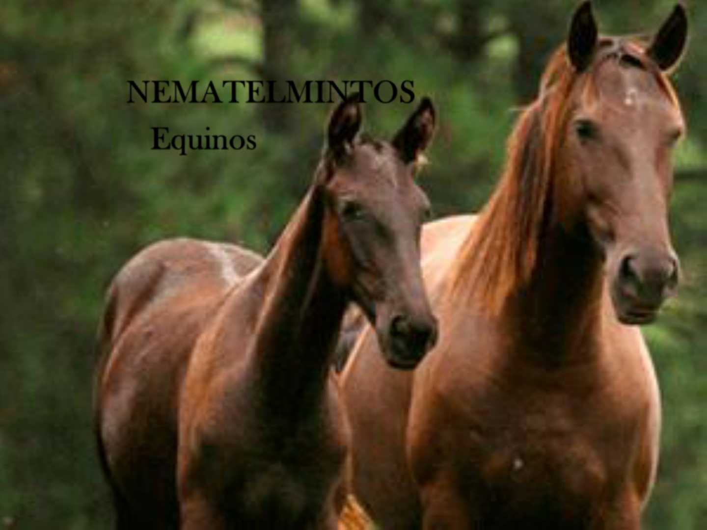 NEMATELMINTOS Equinos (Equus caballus) Asininos: Equus asininus Asininos jumento, jegue e asno diferentes nomes depende da região Muares: mula e o burro, híbridos estéreis, originados do cruzamento entre o jumento e a égua (mula é a fêmea, burro é o macho) ou Bardoto, é resultante do cruzamento da jumenta com o cavalo Animais de grande importância rural, devido sua resistência e docilidade. Se parecem com os cavalos, só que as orelhas são mais compridas INTRODUÇÃO IMPORTÂNCIA- propósito de criação Parasitoses gastrointestinais Gastos com medicamentos, perdas econômicas Cavalos de salto, corrida, reprodução e trabalho (transporte) Lesões de pele: Habronemose Aneurisma e cólica: Strongylus vulgaris Helmintos mais comuns de equinos • Strongyloidea- pequenos estrongilos e grandes estrongilos • Ascarida- Parascaris equorum • Oxyurida- Oxiurideos • Trichostrongyloidea- Trichostrongylus axei, T. westeri • Spirurida- Habronema sp, Draschia, Thelazia • Vermes Pulmonares Helmintos de equinos INTRODUÇÃO Manifestações clínicas variam de acordo com: Número de parasitas Idade Potencial patogênico da espécie infectante Imunidade Estado nutricional e condições de higiene Estrongilídeos Grandes estrôngilos Strongylus vulgaris, Strongylus edentatus Strongylus equinus Pequenos estrôngilos (ciatostomíneos) Cyathostomum spp- mais de 40 espécies Strongyloidea Strongylus Intestino grosso Conhecidos como grandes estrôngilos Femeas 3-4 cm, machos 2- 2,8 cm Hospedeiros – eqüinos e asininos Localização: ceco e cólon Espécies- diferenciação tamanho, presença ou ausencia e forma dos dentes Strongylus vulgaris Strongylus edentatus Strongylus equinus Strongylus vulgaris Estrongilídeo mais patogênico ciclo evolutivo direto – L3 infectante L4 e L5: migração por artérias (inflamação e espessamento (aneurisma e trombos) da artéria mesentérica cranial)- necrose Período pré patente: 7-8 meses Intestino grosso Strongylus vulgaris Intestino grosso Strongylus vulgaris Manifestações clínicas Arterite, trombose, embolia e aneurisma (larvas) Redução do fluxo sangüíneo – ceco e cólon Cólica (↓ fluxo sg + presença de adultos – hemorragia) Anemia (parasitas adultos, danos a mucosa, não são hematófagos!) Intestino grosso Strongylus edentatus Migração larval pelo parênquima hepático Atingem peritônio e ligamentos hepáticos Penetração no IG – formam nódulos se rompem e liberam adultos Manifestações clínicas Necrose, hemorragia e fibrose hepática Hemorragia peritoneal Intestino grosso Strongylus equinus Incidência menor e menor patogenicidade em comparação aos outros grandes estrongilídeos Migração larval em fígado e pâncreas Cistos na parede do IG – liberação de adultos Manifestações clínicas Diarreia, anorexia, perda de peso, edema Intestino grosso Larvas– causam formação de nódulos onde migram Adultos– causam úlceras intestinais por causa dos seus dentes Cyathostomum spp “pequenos estrôngilos” 5- 12 mm Ciclo evolutivo direto L3 (infectante) – invadem a mucosa do IG Hipobiose prolongada (L4) Súbito início de diarréia, periódicas, Rápida perda de peso, cólicas recorrentes moderadas, edema periférico Intestino grosso Cyathostomum spp Manifestações clínicas Hiperplasia da mucosa do IG Hemorragia devido a hematofagia Diarréia, anorexia, edema e anemia Primavera – maior número de L4 saindo da hipobiose Enterite catarro-hemorrágica / linfonodos aumentados L4 com coloração vermelha na luz intestinal Intestino grosso Diagnóstico Presença de ovos nas fezes (flutuação) Presença de larvas nas fezes (Baermann) Cyathostomum spp Parasitas de estômago dos equinos Trichostrongylus axei Habronema muscae Draschia megastoma Estômago Trichostrongylus axei Localização: estômago Hospedeiro: eqüinos e ruminantes Acomete eqüinos que pastejam áreas comuns com ruminantes Ciclo evolutivo direto L3 e ovos embrionados Alta capacidade de sobrevivência em condições adversas Existe evidência de hipobiose estômago Trichostrongylus axei PATOGENIA Mucosa gástrica espessada e hiperplásica Irritação nas vilosidades intestinais Danos aos capilares no lúmen intestinal estômago Trichostrongylus axei Manifestações clínicas Anorexia, perda de peso e pelos arrepiados Diarréia escura (ruptura de capilares – sangue) odor desagradável Perda de peso, inapetência Redução no crescimento estômago Trichostrongylus axei Presença das larvas nas glândulas gástricas, gastrite catarral com úlceras Estômago Habronema muscae e Draschia megastoma "ferida de verão" INTRODUÇÃO Habronemose gástrica e cutânea são morfologicamente semelhantes Hospedeiros definitivos: equinos e asininos Hospedeiros intermediários: Muscídeos (Muscae domestica e Stomox calcitrans, mosca dos estábulos) Distribuição mundial Estômago/ cutâneo Habronema muscae e Draschia megastoma "ferida de verão" Identificação morfológica: Brancos, delgados com 1 a 2,5 cm de comprimento Adultos eliminam ovos larvados ou larvas (L1) nas fezes Período pré patente 2 meses Estômago/ cutâneo Habronema Ciclo evolutivo indireto - forma cutânea - granulomas HI: mosca Deposição de larvas - só chega forma adulta se ingerida (estômago)- Estômago/ cutâneo Habronema muscae e Draschia megastoma "ferida de verão" Fêmeas adultas no estômago - postura de ovos > fezes. Nas fezes há também larvas de muscideos (HI). Larvas das moscas nas fezes ingerem os ovos de Draschia e da Habronema. Dentro das larvas da mosca - ovos eclodem - desenvolvimento das larvas da mosca e do parasito. A larva da mosca passa a adulta e a larva de Habronema/Draschia é L3. Ingestão HI pelo equino - digestão da mosca e a L3 é liberada no estômago - penetra nas glândulas estomacais sofrendo a muda para L4 e depois voltam à luz, onde fazem a muda para L5 e atingem a maturidade, ocasionando a habronemose gástrica Habronema muscae e Draschia megastoma "