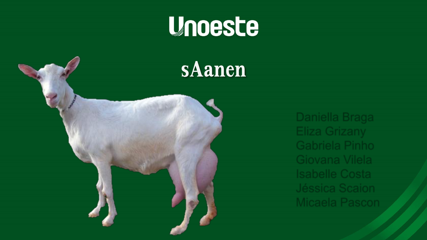 Daniella Braga Eliza Grizany Gabriela Pinho Giovana Vilela Isabelle Costa Jéssica Scaion Micaela Pascon sAanen Origem da Raça 1890 - Vale do Saanen, Suíça; 1910 – chegou ao Brasil; Reconhecida pelo leite de excelente qualidade. Origem da Raça Está entre as raças com os maiores rebanhos pelo mundo; No Brasil, está concentrada no centro-sul; O Sudeste tem a maior produção de leite. Características dos animais Cabeça Cônica e alongada; Olhos grandes e claros; Orelhas eretas; Com chifres ou mochas; No macho, barba longa; e na fêmea, curta Características dos animais Corpo Pelagem branca; Pele flexível; Mucosa rósea; Pescoço; Peito saliente; Costelas arqueadas; Ancas bem separadas; Membros fortes e alongados; Cascos amarelo claro; Úbere globoso, com pouco pelo e simétrico. Características dos animais Cabrito Cabra Bode Aptidões Alto valor leiteiro; Maior produção de leite do mundo; No Brasil, são de excelente qualidade; São as mais importantes no cenário de torneio leiteiro. Características do Produto Produz 3kg leite/dia; Período de lactação de 8 a 10 meses; 3% de gordura – leite magro Curiosidades Não é permitido na criação da raça: Perfil da cabeça convexo ou côncavo; Orelhas grandes, mal implantadas e dobradas; Chifres em ''V'' e torcidos; Membros pretos; Outras pelagens; Pêlos compridos; Garupa curta ou muito inclinada. Curiosidades Lucratividade R$300,00 reais a R$3.000,00 reais. Criação mínima de25 cabras em lactação. Em média, raças com boa lactação produzem de 2 a 5 litros de leite por dia durante 9 meses. Retorno do investimento de 3 a 5 anos. Obrigada!!!