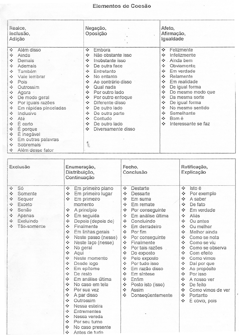 Realce, Inclusão, Adição .;. Além disso .:- Ainda -:- Demais .:. Ademais .:. Também .:. Vale lembrar .:. Pois -:- Outrossim -;- Agora .:- De modogeral .:- Por iguais razões o:. Em rápidaspinceladas .:. Inclusive .:. Até .:. É certo .:. É porque .:. É inegável .;. Em outraspalavras .:. Sobremais .:- Além desse fator Elementos de Coesão Negação, Oposição Afeto, Afirmação, Igualdade .:. Embora .:. Nãoobstanteisso .:. Inobstanteisso .:. Deoutraface .:. Entretanto .:. Noentanto .:. Aocontráriodisso .;. Qualnada' .:. Poroutrolado .:. Poroutroenfoque o:. Diferentedisso .:. Deoutrolado .:. Deoutraparte .:. Contudo .;. Deoutrolado .:. Diversamentedisso .:. Felizmente .:. Infelizmente .:.. Aindabem .:- Obviamente .:. Emverdade .:. Relamente .:. Emrealidade .:. Deigualforma o:. Domesmomodoque .:. Damesmasorte .:- Deigualforma .:. Nomesmosentido .:. Semelhante .:. Bomé .:. Interessantese faz . ) I Exclusão Enumeração, Fecho, Retificação,I Distribuição, Conclusão Explicação I Continuação -.- Só .:- Emprimeiroplano .:. Destarte '.' Istoé. Somente .:. Emprimeirolugar .:. Dessarte .:- Porexemplo--- .:. Sequer O:' Emprimeiro O:' Emsuma O:' A saber I .:. Exceto momento O:' Emremate .:. Defato 1-:- Senão .:. A pnncípio .:. Porconseguinte .:. Emverdade .:. Apenas .:. Emseguida .:. Emanáliseúltima .:. Aliás .:- Excluindo .:. Depois(depoisde) .:. Concluindo .:. Ouantes .:. Tão-somente .:. Finalmente .:. Emderradeiro .:. Ou melhor -.- Emlinhasgerais' .:. Porfim .:. Melhorainda I .:. Nestepasso(nesse) .:. Porconseguinte .:. Comose nota .:. Nestelaço(nesse) .:. Finalmente .:- Comoseviu I .:. Nogeral .:. Portaisrazões .:. ComoseobservaI I .:. Aqui .:. Doexposto .:. Comefeito .:. Nestemomento -:- Peloexposto .:. Comovimos .:. Desdelogo .:. Portudoisso .:. Daiporque O:' Emepítome .:. Emrazãodisso .:. Ao propósito -.- De resto .:. Emsintese .:. Por isso .:. Emanáliseúltima .:. Enfim .:. A nossover .:- No casoemtela .'. Postoisto(isso) .:. Defeito...:. Porsuavez .:. Assim .:- Comovimosdever .:- A pardisso .:. Conseqüentemente .:. Portanto. Outrossim .:- É obvio,pOIS-.- O:' Nessa esteira .:. Entrementes - .:. Nessa vereda .:. Por seu turno .:- No caso presente - .:. Antes de tudo Expressões de Transição .:. É deverificar-se... .:- Nãoháolvidar... .:. Nãose podeolvidar... .:. Comose háverificar... -:- Comosepodenotar... o:. É deserrelevado... .:. É bemverdadeque... .:- Nãoháfalar-se... i .:. Valeratificar(cumpre)... o:. Indubitávelé... O:. Nãosepodeperderdevista... .:. Convémressaltar... .:- Postaassima questão,édese dizer... °:° Registre-se,ainda... -:° Bomédizerque... .:- Cumpre-nosassinalarque... .:. OportÜnosetornadizer... o:. Mistersefaz ressaltar... °:° Nestesentidodeve-sedizerque... .:. Tenha-sepresenteque... . °:° Inaáequaáoseriaesquecer,~ambém...' 1 °;' Assinale,ainda,que... . °:° É precisoinsistirtambémnofatodeque... . I-:° Nãoémansae pacíficaaquestão,conformese verá... O:. Édeopiniãounívoca... . .:. Cumpreobservar,preliminarmente,que... -:° Comosedepreende... °:° Convémnotar,outrossim,que... -:° Verdadeseja,estaé... °:° Emvirtudedessasconsiderações... -:- Empósas noçõespreliminaresembrevetrecho,podemos... .:° Cumpreexaminarmos,nestepasso... . -:° Consoantenoçõescediça... °:° Nãoqueristodizer,entretanto,que... -:- Ao ensejodaconclusãodesteitem... °:° Impendeobservarque... O:. É sobremodoimportanteassinalarque... o:. Àguisadeexemplopodemoscitar... °:' À maisdasvezes,convémassinalar... . -:0 Nodizersempreexpressivode... 1°:0Emconsonânciacomo acatado... °:° A nossopensar... PETRI, M.A. Enunciaçãoe discursojurídico.SãoPaulo:Cortez.1979.