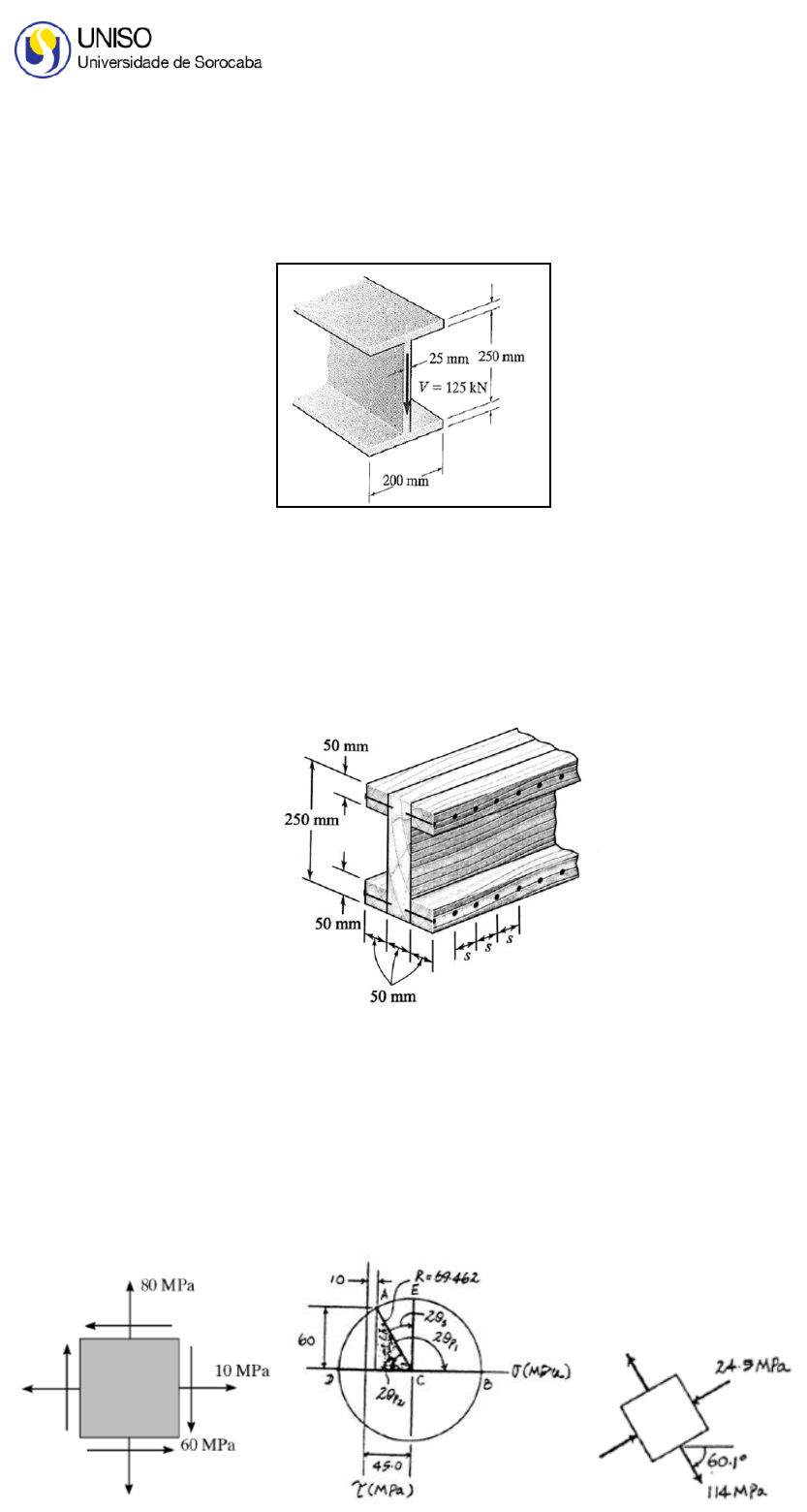 LISTA I – RESISTÊNCIA DOS MATERIAIS 2 01) Dado a viga I de uma de edificação residencial, calcular a máxima tensão cisalhante que sua seção transversal (figura ao lado) poderá suportar. 02) A viga de madeira mostrada na figura está submetida a uma força cortante vertical de 5,4KN. Sabendo que a força cortante em cada prego é de 338N, determine o espaçamento (s) entre os pregos. Resposta: 4,186x10-2m 03) O estado de tensão em um ponto é mostrado no elemento. Determine através do Círculo de Mohr (a) as tensões principais e (b) a tensão de cisalhamento máxima no plano e a tensão normal média no ponto. Especifique a orientação do elemento. Respostas: (𝑎)𝜎máx = 114𝑀𝑃𝑎,𝜎mín = −24,5𝑀𝑃𝑎 𝑒 𝜃𝑝 = 29,87° (𝑏)𝜏𝑚𝑎𝑥 = −69,5𝑀𝑃𝑎,𝜎𝑚é𝑑 = 45𝑀𝑃𝑎 mm25 mm20 04) Para o estado de tensões indicado abaixo, determinar: a) Círculo de Mohr triaxial COMPLETO; b) A tensão de cisalhamento máxima. Unidades, Gráficos e Fórmulas: 1 𝑁 𝑚2 = 1 𝑃𝑎 𝜏 = 𝑉𝑄 𝐼𝑡 𝑞 = 𝑉𝑄 𝐼 𝐹 = 𝑠 𝑞 𝑄 = 𝐴 ȳ 𝐼 = 𝑏ℎ3 12 + 𝑏 ℎ 𝑟2 ȳ = ∑ȳ𝐴 ∑𝐴 𝑥 = ∑𝑥𝐴 ∑𝐴 𝐻𝑖𝑝𝑜𝑡𝑒𝑛𝑢𝑠𝑎2 = √𝐶𝑎𝑡𝑒𝑡𝑜2 + 𝐶𝑎𝑡𝑒𝑡𝑜2 yx xy ptg 2 2 raiomédmín raiomédmáx 2 YX méd raiomáx ADJACENTECAT OPOSTOCAT pTG . . 2 2 2 2 xy yx R