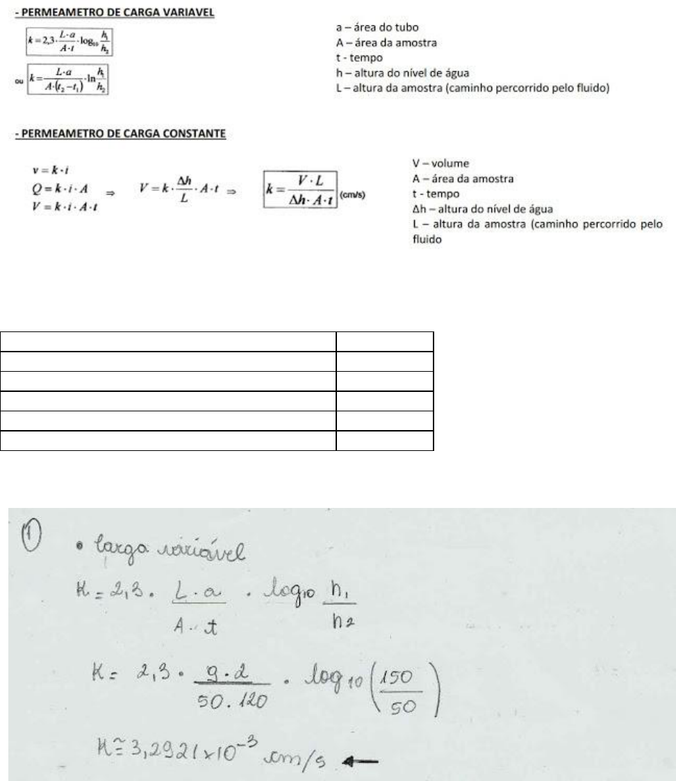 Constante de permeabilidade - Exercícios resolvidos Fórmulas para constante de permeabilidade dos solos (k) 1 - Realizou-se um ensaio de permeabilidade numa amostra de areia em que obtiveram os seguintes resultados: Altura d’água inicial 150 cm Altura d’água final 50 cm Tempo decorrido 2 min Área da seção transversal do tubo de carga 2 cm² Área da seção transversal do corpo de prova 50 cm² Altura do corpo de prova 9 cm Determine a Constante de Permeabilidade da areia em questão: 2- A figura seguinte representa um permeâmetro de carga constante utilizado para determinação do coeficiente de permeabilidade dos solos. Determine o valor do coeficiente de permeabilidade determinado para as condições mostradas na figura, sabendo-se que a vazão percolada pelo solo vale e que a área da amostra é igual a 706 3- Em um permeâmetro de nível constante, de água percorre através de uma amostra cilíndrica de 0,13 m de altura e 0,07 m de diâmetro, durante um período de 1,5 minutos, com um nível efetivo de 0,30 m. Qual é o coeficiente de permeabilidade da amostra, em cm/s, na temperatura do ensaio? 4- O permeâmetro da figura possui seção transversal de 530 cm². Determine a permeabilidade do solo cujo peso específico é Em 18 s, o volume de água que passou pelo permeâmetro foi de 100 . *Obs: desenho obviamente fora de escala, porém, as cotas estão indicadas.