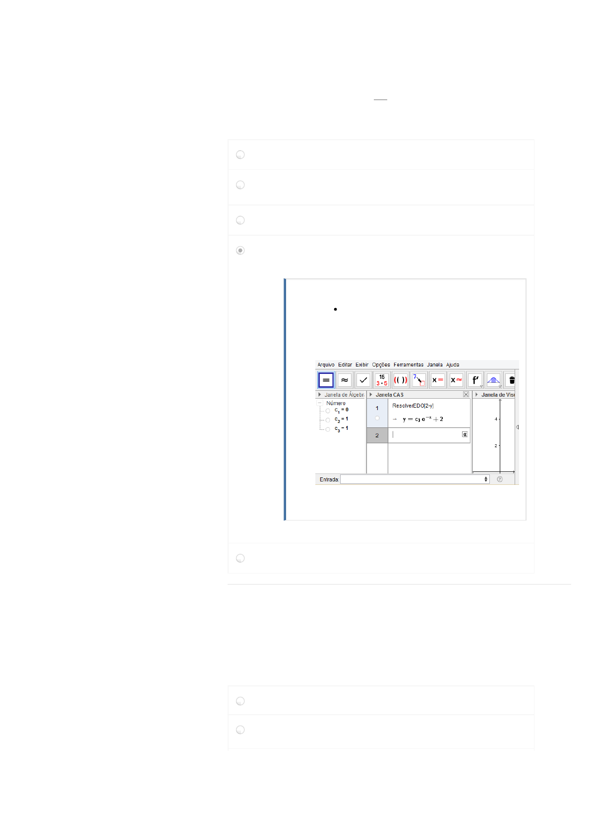 28/05/2018 AVA UNIVIRTUS http://univirtus.uninter.com/ava/web/#/ava/AvaliacaoUsuarioHistorico/244700/novo/1/37787 1/6 Questão 1/5 - Ferramentas Matemáticas Aplicadas Utilizando o Geogebra, determine a solução da seguinte equação diferencial linear: Nota: 20.0 A B C D E Questão 2/5 - Ferramentas Matemáticas Aplicadas Dadas as funções: e calcule a área limitada por estas curvas utilizando o Geogebra e selecione a opção correta abaixo. Nota: 20.0 A 2,564 B 1,876 = 2 − ydydx y = c3ex + 2 y = c3e−x − 2 y = c3ex − 2 y = c3e−x + 2 Você acertou! Abra o geogebra no modo “CAS” clicando em Exibir -> Janela CAS: Na sequência, digite a equação diferencial na forma dy/dx = f(x,y): - ResolverEDO[2-y]; y = c3ec3x − 2 f(x) = −x2 + 1 g(x) = −x 28/05/2018 AVA UNIVIRTUS http://univirtus.uninter.com/ava/web/#/ava/AvaliacaoUsuarioHistorico/244700/novo/1/37787 2/6 C 2,225 D 1,118 E 1,863 Questão 3/5 - Ferramentas Matemáticas Aplicadas Dada a função: ?, utilizando o Geogebra, encontre seu valor máximo no intervalo Nota: 20.0 A 2,12 B 2,18 C 1,18 D 1,19 Você acertou! f(x) = -x² + 1Digite os seguintes comandos no Geogebra: f(x) = -x² + 1 e g(x) = -x Por fim: Interseção[f, g] e IntegralEntre[f, g, -0.61803, 1.61803] f(x) = −x3 − x2 + x + 1 [0, 3] Você acertou! f(x) = -x³ - x² + x + 1No Geogebra digite os seguintes comandos: f(x) = -x³ - x² + x + 1 e Máximo[f(x), 0, 2] 28/05/2018 AVA UNIVIRTUS http://univirtus.uninter.com/ava/web/#/ava/AvaliacaoUsuarioHistorico/244700/novo/1/37787 3/6 E 1,16 Questão 4/5 - Ferramentas Matemáticas Aplicadas Para determinar a área sob uma curva, precisamos encontrar a equação da curva, os pontos que limitam a área desejada e, em seguida, calcular a integral desta equação entre estes dois pontos. Sabendo disso, considere a função: e calcule a área sobre o eixo sabendo que esta curva corta o eixo nos pontos e Nota: 20.0 A 10,67 f(x) = 3 + 2x − x2 x x x = −1 x = 3 Você acertou! f(x) = 3 + 2x - x²Digite os seguintes comandos no Geogebra: f(x) = 3 + 2x - x² e Integral[f, -1, 3] 28/05/2018 AVA UNIVIRTUS http://univirtus.uninter.com/ava/web/#/ava/AvaliacaoUsuarioHistorico/244700/novo/1/37787 4/6 B 12,34 C 12 D 10 E 23,87 Questão 5/5 - Ferramentas Matemáticas Aplicadas Utilizando o software Geogebra para a solução de problemas de equações diferenciais podemos achar a solução da equação: Considerando a afirmativa acima marque a alternativa correta. Nota: 20.0 A B = cos(x) − ydydx y = c4ex + cos(x) + sen(x)12 1 2 y = c4e−x + cos(x) + sen(x)12 1 2 Você acertou! Abra o geogebra no modo “CAS” clicando em Exibir -> Janela CAS: Na sequência, digite a equação diferencial na forma dy/dx = f(x,y): - ResolverEDO[cos(x)-y]; 28/05/2018 AVA UNIVIRTUS http://univirtus.uninter.com/ava/web/#/ava/AvaliacaoUsuarioHistorico/244700/novo/1/37787 5/6 C D E y = c4ex − cos(x) + sen(x)12 1 2 y = c4e−x + cos(x) − sen(x)12 1 2 y = c4e−2x + cos(x) + sen(x)12 1 2