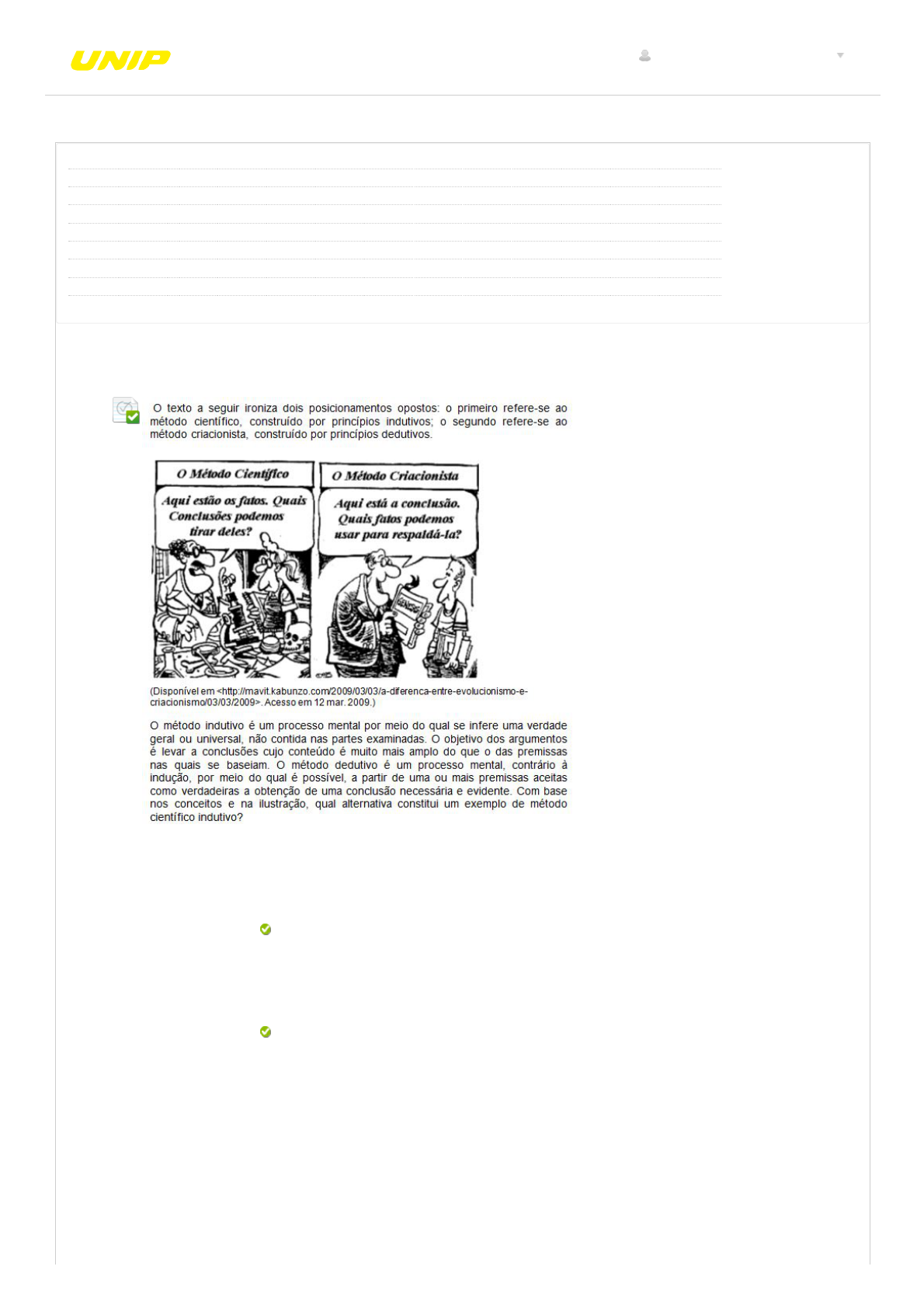 28/05/2018 Revisar envio do teste: QUESTIONÁRIO UNIDADE II – 6553-... https://ava.ead.unip.br/webapps/assessment/review/review.jsp?attempt_id=_5217135_1&course_id=_15490_1&content_id=_238121_1&return_content=1&step= Revisar envio do teste: QUESTIONÁRIO UNIDADE IIEstudos Disciplinares II 6553-15_SEI_GF_0118_R_20181 CONTEÚDO Usuário eloiza.soares @unipinterativa.edu.br Curso Estudos Disciplinares II Teste QUESTIONÁRIO UNIDADE II Iniciado 28/05/18 18:38 Enviado 28/05/18 19:35 Status Completada Resultado da tentativa 3 em 5 pontos Tempo decorrido 57 minutos Resultados exibidos Todas as respostas, Respostas enviadas, Respostas corretas, Comentários, Perguntas respondidas incorretamente Pergunta 1 Resposta Selecionada: a. Respostas: a. b. O corvo 1 é negro. O corvo 2 é negro. O corvo 3 é negro. O corvo "n" é negro. ------------------------- (Todo) corvo é negro. O corvo 1 é negro. O corvo 2 é negro. O corvo 3 é negro. O corvo "n" é negro. ------------------------- (Todo) corvo é negro. José e Antônio são homens. Todos os homens morrem. Logo, José e Antônio morrerão. CONTEÚDOS ACADÊMICOS BIBLIOTECAS MURAL DO ALUNO TUTORIAIS eloiza.soares @unipinterativa.edu.br 1UNIP EAD 0,5 em 0,5 pontos 28/05/2018 Revisar envio do teste: QUESTIONÁRIO UNIDADE II – 6553-... https://ava.ead.unip.br/webapps/assessment/review/review.jsp?attempt_id=_5217135_1&course_id=_15490_1&content_id=_238121_1&return_content=1&step= c. d. e. Feedback da resposta: As uvas caem, então a raposa as come. A raposa come somente uvas maduras. As uvas estão verdes ou caem. Logo, a raposa come unicamente uvas que caem. Todos os homens são mortais. Sócrates é homem. Portanto, Sócrates é mortal. 100% dos calouros universitários são capazes de ler livros do sexto período. Fábio é calouro universitário. Fábio é capaz de ler livros do sexto período. Resposta: a Na alternativa “a”, utiliza-se de raciocínio indutivo, pois parte-se de proposições particulares (“corvo 1, corvo 2...”) para fazer uma conclusão geral (“todo corvo”). Pergunta 2 Resposta Selecionada: d. Respostas: a. b. c. d. e. Feedback da resposta: "Todos os números racionais podem ser expressos como quociente de dois inteiros. Contudo, π não pode ser expresso como quociente de dois inteiros. Portanto, π não é um número racional. Evidentemente, π é um número. Logo, existe pelo menos um número não racional. Forma padrão desse argumento, exceto: π não é um número. Todos os números racionais podem ser expressos como quociente de dois inteiros. π não pode ser expresso como quociente de dois inteiros. π não é um número racional. π não é um número. Existe pelo menos um número não racional. Resposta: d A assertiva é falsa, pois π é, na verdade, um número. 0,5 em 0,5 pontos 28/05/2018 Revisar envio do teste: QUESTIONÁRIO UNIDADE II – 6553-... https://ava.ead.unip.br/webapps/assessment/review/review.jsp?attempt_id=_5217135_1&course_id=_15490_1&content_id=_238121_1&return_content=1&step= Pergunta 3 Resposta Selecionada: a. Respostas: a. b. c. d. e. Feedback da resposta: (ESAF) Se Beto briga com Glória, então Glória vai ao cinema. Se Glória vai ao cinema, então Carla fica em casa. Se Carla fica em casa, então Raul briga com Carla. Ora, Raul não briga com Carla. Logo: Carla não fica em casa e Beto não briga com Glória. Carla não fica em casa e Beto não briga com Glória. Carla fica em casa e Glória vai ao cinema. Carla não fica em casa e Glória vai ao cinema. Glória vai ao cinema e Beto briga com Glória. Glória não vai ao cinema e Beto briga com Glória. Resposta: a Lembramos que a contrapositiva de p → q é equivalente a q →p. Daí, teremos se Raul não briga com Carla, então Carla não fica em casa. Pergunta 4 Resposta Selecionada: Dados os argumentos a seguir, identifique os dedutivos e os indutivos: I. Todo homem é mortal. Sócrates é um homem. Sócrates é mortal. II. Frequentemente quando chove fica nublado. Está chovendo. Está nublado. III. Se chove molha a rua. Está chovendo. A rua está molhada. 0,5 em 0,5 pontos 0 em 0,5 pontos 28/05/2018 Revisar envio do teste: QUESTIONÁRIO UNIDADE II – 6553-... https://ava.ead.unip.br/webapps/assessment/review/review.jsp?attempt_id=_5217135_1&course_id=_15490_1&content_id=_238121_1&return_content=1&step= e. Respostas: a. b. c. d. e. I – indutivo; II – indutivo; III - dedutivo I – dedutivo; II – dedutivo; III - dedutivo I – indutivo; II – indutivo; III - indutivo I – dedutivo; II – indutivo; III - dedutivo I – dedutivo; II – dedutivo; III - indutivo I – indutivo; II – indutivo; III - dedutivo Pergunta 5 Resposta Selecionada: b. Respostas: a. b. c. d. e. Feedback da Esta sequência de palavras segue uma lógica: - Pá - Xale - Japeri Uma quarta palavra que daria continuidade lógica à sequência poderia ser: Anseio. Casa. Anseio. Urubu. Café. Murada. Resposta: b 0,5 em 0,5 pontos 28/05/2018 Revisar envio do teste: QUESTIONÁRIO UNIDADE II – 6553-... https://ava.ead.unip.br/webapps/assessment/review/review.jsp?attempt_id=_5217135_1&course_id=_15490_1&content_id=_238121_1&return_content=1&step= resposta: A ordem de apresentação das palavras deve-se à ordem alfabética das vogais. Em “pá” aparece a vogal “a”, em “xale”, aparecem as vogais “a” e “e”, em “japeri” são dispostas em ordem alfabética as vogais “a”, “e” e “i”. Assim, das alternativas, a única palavra que apresenta as vogais já dadas (a/e/i/) e a posterior “o” é “anseio”. Pergunta 6 Resposta Selecionada: b. Respostas: a. b. c. d. e. Leia os argumentos a seguir e assinale a alternativa correta. I. "Todos os X são Y; todos os Y são Z; logo, todos os X são Z." II. "Na escola A, 5/6 dos professores são doutores; X leciona em A; logo, X é doutor." O primeiro é um exemplo canônico de um argumento indutivo. O segundo é um típico argumento dedutivo. Ambos são argumentos dedutivos. O pr