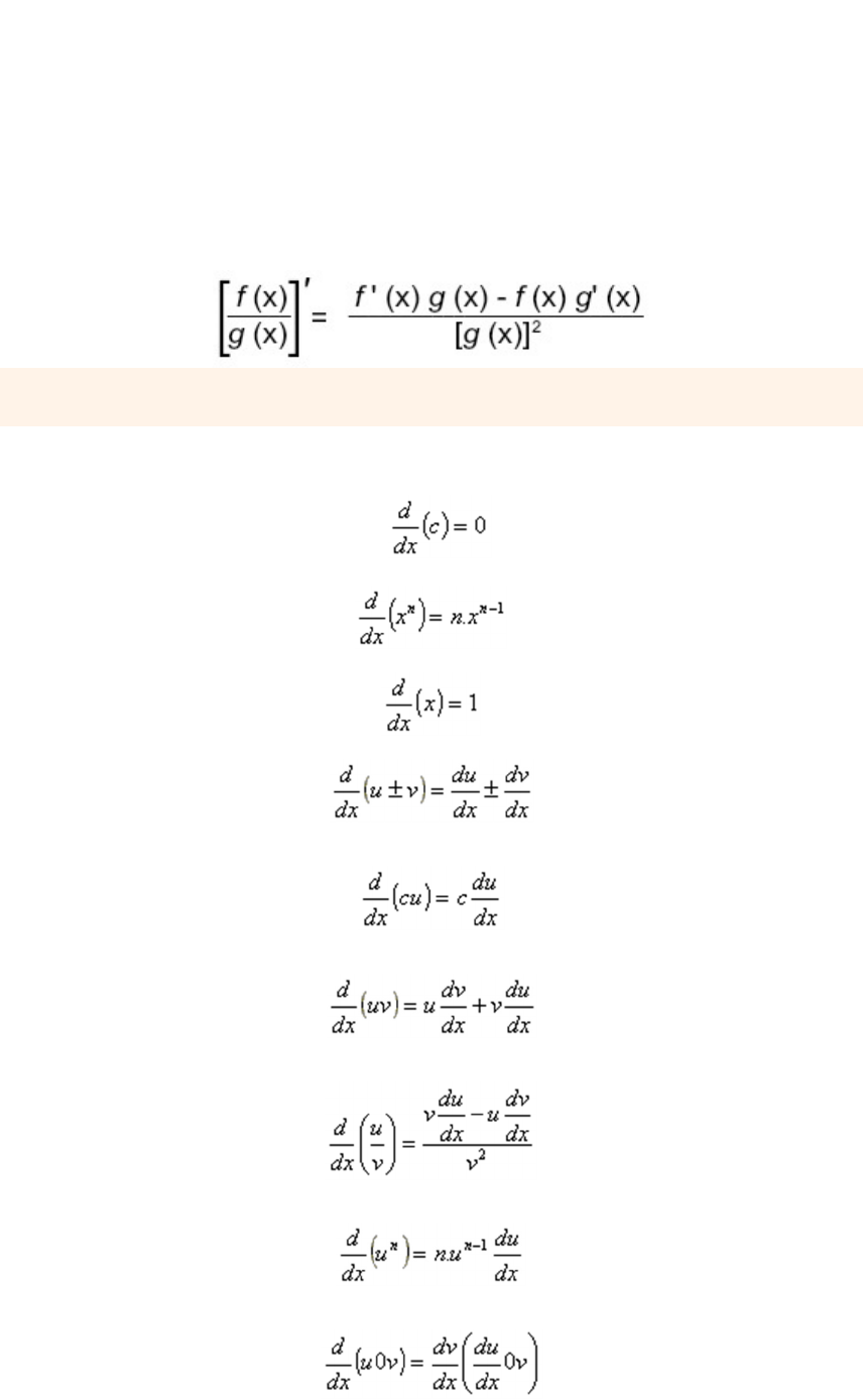 Regras de derivação Sejam f (x) e g (x) funções deriváveis e seja a um número real qualquer. Então, valem as propriedades: i) Se f (x) = a, então f ' (x) = 0. ii) Se f (x) = ax, então f ' (x) = a. iii) (Regra do tombo) Se f (x) = xa, então f ' (x) = a·xa – 1. iv) (Derivada da soma) [f (x) + g (x)]' = f ' (x) + g' (x). v) [af (x)]' = a·f ' (x). vi) (Regra do produto) [f (x) g (x)]' = f ' (x) g (x) + f (x) g' (x). vii) (regra do quociente): Algumas derivadas básicas Nas fórmulas abaixo, u e v são funções da variável x. a, b, c e n são constantes. Derivada de uma constante Derivada da potência Portanto: Soma / Subtração Produto por uma constante Derivada do produto Derivada da divisão Potência de uma função Derivada de uma função composta Derivadas Regra da cadeia A fórmula: é conhecida como regra da cadeia. Ela pode ser escrita como: Outra fórmula similar é a seguinte: Derivada da função inversa A inversa da função y(x) é a função x(y):