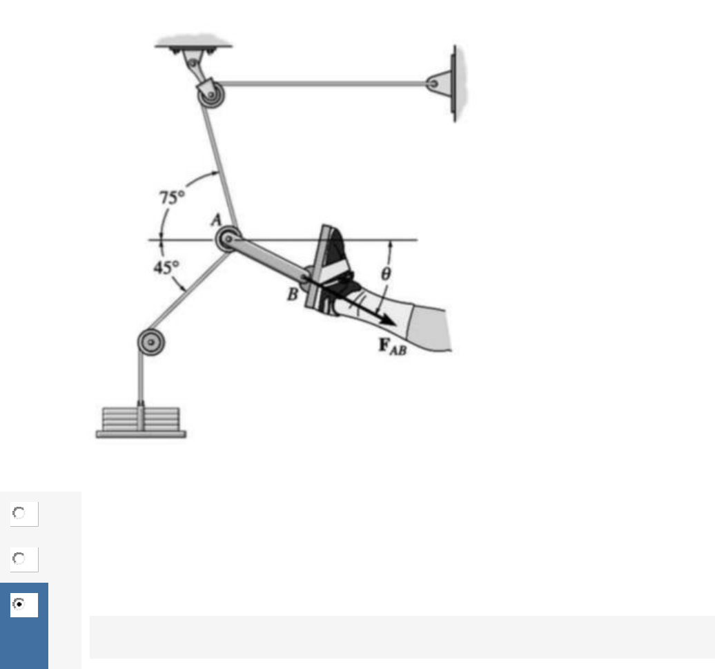 Questão 1/5 Determine a intensidade e o sentido da força de equilíbrio FABFAB exercida ao longo do elo ABAB pelo dispositivo de tração mostrado. A massa suspensa é de 10 kg. Despreze as dimensões da polia em AA. ΣFx=0ΣFx=0 ΣFy=0ΣFy=0 A FAB=109,26NFAB=109,26N e θ=19,3°θ=19,3° B FAB=87,12NFAB=87,12N e θ=22,12°θ=22,12° C FAB=98,10NFAB=98,10N e θ=15°θ=15° Você acertou! aula 1, tema 3 D FAB=91,80NFAB=91,80N e θ=10°θ=10° Questão 2/5 A caminhonete deve ser rebocada usando-se duas cordas. Determine a intensidade das forças FAFA e FBFB que atuam em cada corda a fim de produzir uma força resultante de 950N, orientada ao longo do eixo x positivo. Considere que θ=50°θ=50°. (Hibbeler, Estática, 10ª ed, 2005) Fr=√A2+B2−2ABcosγFr=A2+B2−2ABcosγ Asinα=Bsinβ=CsinγAsinα=Bsinβ=Csinγ A FA=774,45NFA=774,45N e FB=345,77NFB=345,77N Você acertou! aula 1, tema 1 e 2 B FA=789,96NFA=789,96N e FB=425,92NFB=425,92N C FA=645,32NFA=645,32N e FB=480,65NFB=480,65N D FA=712,43NFA=712,43N e FB=355,16NFB=355,16N Questão 3/5 O comprimento sem deformação da mola AB é de 2m. Com o bloco mantido na posição de equilíbrio mostrada, determine a massa dele em D. (Hibbeler, Estática, 10ª ed, 2005) F=kδF=kδ δ=Lf−Liδ=Lf−Li A M=14,6 kg B M=11,3 kg C M=12,8 kg Você acertou! aula 1, tema 3 D M=15,8 kg Questão 4/5 Determine a intensidade da força resultante Fr=F1+F2Fr=F1+F2 e sua direção, medida no sentido anti-horário, a partir do eixo x positivo. (Hibbeler, Estática, 10ª ed, 2005) Fr=√A2+B2−2ACcosγFr=A2+B2−2ACcosγ Asinα=Bsinβ=CsinγAsinα=Bsinβ=Csinγ A Fr=405,23lbFr=405,23lb e α=−12,16α=−12,16 B Fr=393,19lbFr=393,19lb e α=−7,11°α=−7,11° Você acertou! aula 1, tema 1 e 2 C Fr=509,54lbFr=509,54lb e α=−15,62°α=−15,62° D Fr=356,95lbFr=356,95lb e α=−8,65°α=−8,65° Questão 5/5 Treliças são comumente utilizadas na construção civil e em estruturas. Seus membros são conectados a placas de ligação, como a da figura a seguir: A B C D Você acertou! aula1, tema 3