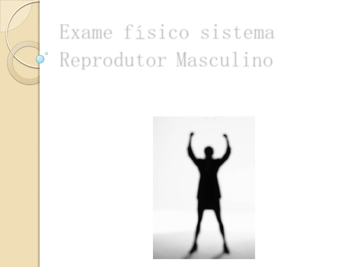 Exame físico sistema Reprodutor Masculino Sistema Reprodutor Masculino No homem, a uretra também faz parte do sistema reprodutivo, conduzindo o sêmen e a urina. É constituído de Pênis, escroto, testículos, epidídimo, canais deferentes, vesículas seminais e próstata. Sistema Reprodutor Masculino Pênis – formado de corpo, glande, meato uretral, coroa e prepúcio. Contém três colunas de tecido erétil vascularizado. Sistema Reprodutor Masculino Escroto – localizado na base do pênis, é uma bolsa frouxa, enrugada e intensamente pigmentada. Cada um de seus compartimentos contém um testículo, um epidídimo e parte do cordão espermático. Sistema Reprodutor Masculino Testículos – estruturas ovais, inclinadas um pouco para frente dentro do escroto. Produzem Testosterona e esperma. Testosterona – alterações da puberdade Na puberdade, há o crescimento dos testículos, desenvolvimento dos pêlos pubianos e aumento do pênis. Sistema Reprodutor Masculino Epidídimo – funciona como reservatório para a maturação do esperma. Produz um abaulamento visível na superfície de cada testículo. Sistema Reprodutor Masculino Canais deferentes – armazenam e conduzem o esperma. Vesículas Seminais – ajudam a formar o líquido seminal. Próstata – Produz líquido que se mistura ao líquido seminal, que durante o ato sexual, aumenta o volume do sêmen, mobilizando os espermatozóides. Sistema Reprodutor Masculino Estruturas inguinais – cordão espermático começa no testículo, passa pelo canal inguinal e sai do escroto pelo anel inguinal externo. O cordão espermático entra na cavidade abdominal pelo anel inguinal interno. Histórico de saúde Ocupação; Atividade física; Idade; Uso de preservativos; Medicamentos; História sexual; Doenças crônicas. Inspeção O aspecto da genitália externa indica a adequação ao desenvolvimento sexual à idade cronológica. O índice de maturidade sexual (IMS), no sexo masculino, é dividido em estágios de desenvolvimento – tabela de Tunner. Tabela de tunner Estágio Pêlos Pubianos Pênis Testículos Período Do desenvolvimento 1, 2 e 3 Passam de penugem apelos escuros e crespos Aumento gradativo Aumento gradativo Infância e pré - adolescência 4 Escuros, longos, ásperos e crespos, sobre toda área pubiana Aumenta de comprimentoe diâmetro, com desenvolvimento da glande Cresce quasecompletamente, escroto escurece. Adolescência 5 Espalham-se pelas coxas. Tamanho e formato adulto Crescimento completo Final daadolescência Inspeção e palpação: Pênis – pele normal é enrugada e a veia dorsal pode ser evidente. Palpar glande com polegar e indicador, a borda do meato deve aparecer rosada, lisa e sem secreção. Meato urinário – Epispádia, Hipospádia. Escroto – simetria Inspeção e palpação: Testículos- comprima-os entre o indicador e o polegar, quanto ao tamanho, forma, consistência e simetria. Avaliar presença de hérnias no canal e anel inguinal. Mamas – idem mulher. Reto e ânus – introduzir indicador lubrificado em direção a cicatriz umbilical do paciente Achados Anormais: Pênis e escroto: Lesões; Hiperemia; Hidrocele; Varicocele; Dificuldade para urinar. Idosos- diminuição do tamanho do pênis e quantidade dos pêlos. Reto e ânus: Tônus esfincteriano relaxado; Presença de fissuras; Sangramento; Hemorroidas; Fecalomas. Achados Anormais: Hidrocele Achados Anormais: Hidrocele Achados Anormais: Criptoquirdia Achados Anormais: Torsão de testículo Pênis Torto Congênito Achados Anormais: Fratura de pênis Achados Anormais: Ginecomastia Hermafroditismo Achados Anormais: Epididimite Fimose Achados Anormais: Hernia inguinal + gangrena Fournier Molusco Contagioso Achados Anormais: Clamídia Candidíase Achados Anormais: Herpes Achados Anormais: Cancro Condiloma Achados Anormais: Sífilis Achados Anormais: HPV Achados Anormais: Gangrena de Fournier Achados Anormais: Câncer Achados Anormais: Implante de pele Tumor peniano + metástase inguinal Achados Anormais: Amputação Necrose Terminologia: Azoospermia; Esmegma; Hemospermia; Hidrocele; Oligospermia Priapismo Varicocele