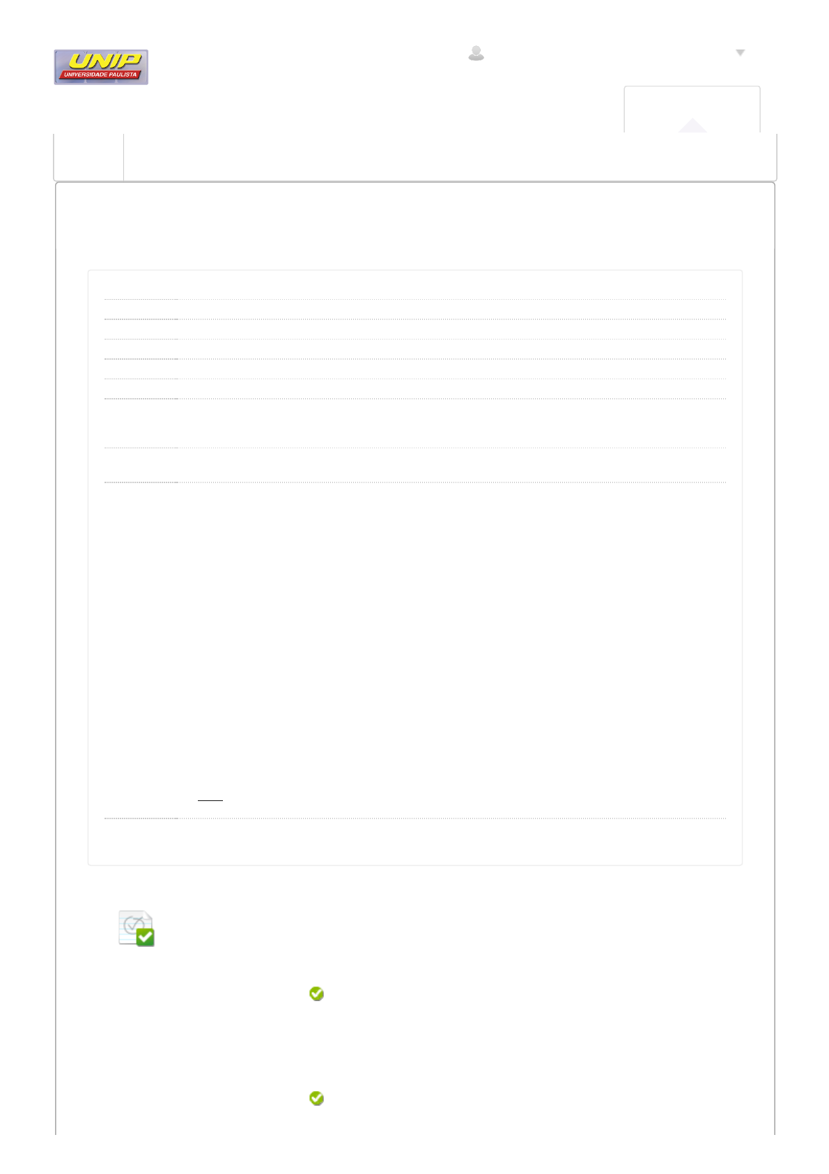 10/08/2017 Revisar envio do teste: Questionário Unidade I (2017/2) &ndash... https://ava.ead.unip.br/webapps/assessment/review/review.jsp?attempt_id=_54378418_1&course_id=_35484_1&content_id=_1651548_1&return… 1/6 Unidade I Revisar envio do teste: Questionário Unidade I (2017/2)H Revisar envio do teste: Questionário Unidade I (2017/2) Usuário cleziler.ferreira @unipinterativa.edu.br Curso Contabilidade Teste Questionário Unidade I (2017/2) Iniciado 10/08/17 19:25 Enviado 10/08/17 19:25 Status Completada Resultado da tentativa 2,5 em 2,5 pontos Tempo decorrido 8 minutos Instruções ATENÇÃO: a avaliação a seguir possui as seguintes configurações: - Possui número de tentativas limitadas a 3 (três); - Valida a sua nota e/ou frequência na disciplina em questão – a não realização pode prejudicar sua nota de participação AVA, bem como gerar uma reprovação por frequência; - Apresenta as justificativas das questões para auxílio em seus estudos – porém, aconselhamos que as consulte como último recurso; - Não considera “tentativa em andamento” (tentativas iniciadas e não concluídas/enviadas) – porém, uma vez acessada, é considerada como uma de suas 3 (três) tentativas permitidas e precisa ser editada e enviada para ser devidamente considerada; - Possui um prazo limite para envio (acompanhe seu calendário acadêmico), sendo impossível o seu acesso após esse prazo, então sugerimos o armazenamento e/ou impressão para futuros estudos; - A não realização prevê nota 0 (zero). Resultados exibidos Todas as respostas, Respostas enviadas, Respostas corretas, Feedback, Perguntas respondidas incorretamente Pergunta 1 Como são considerados os valores que a empresa tem a receber de terceiros, representados por duplicatas a receber ou aplicações financeiras? Resposta Selecionada: c. Direitos. Respostas: a. Obrigações. b. Bens. c. Direitos. Unip Interativa 0,25 em 0,25 pontos cleziler.ferreira @unipinterativa.edu.br 10/08/2017 Revisar envio do teste: Questionário Unidade I (2017/2) &ndash... https://ava.ead.unip.br/webapps/assessment/review/review.jsp?attempt_id=_54378418_1&course_id=_35484_1&content_id=_1651548_1&return… 2/6 d. Patrimônio líquido. e. Nenhuma das anteriores. Feedback da resposta: Resposta: Alternativa C. Comentário: Direitos são valores que a empresa tem a receber, como duplicatas emitidas contra seus clientes ou mesmo aplicações financeiras (CDB). Pergunta 2 Conforme o Congresso Brasileiro de Contabilidade, de 1924, a Contabilidade é a ciência que: Resposta Selecionada: a. estuda e pratica as funções de orientação, controle e registro relativas à administração econômica; Respostas: a. estuda e pratica as funções de orientação, controle e registro relativas à administração econômica; b. estuda e pratica as funções patrimoniais do Conselho Federal de Contabilidade; c. estuda e pratica as funções equacionais e matemáticas de todas as empresas brasileiras; d. estuda e pratica as funções sazonais das empresas de todas as regiões brasileiras; e. nenhuma das anteriores. Feedback da resposta: Resposta: Alternativa A. Comentário: Conforme conceito inicial visto em apostila (página 9), a Contabilidade é a ciência que estuda e pratica as funções de orientação, controle e registro relativas à administração econômica (Congresso Brasileiro de Contabilidade, 1924). Pergunta 3 Na Contabilidade, como é chamado tudo o que possa ser avaliado em dinheiro, que tenha alguma utilidade e satisfaça a uma necessidade? Resposta Selecionada: d. Bens. Respostas: a. Direito. b. Obrigação. 0,25 em 0,25 pontos 0,25 em 0,25 pontos 10/08/2017 Revisar envio do teste: Questionário Unidade I (2017/2) &ndash... https://ava.ead.unip.br/webapps/assessment/review/review.jsp?attempt_id=_54378418_1&course_id=_35484_1&content_id=_1651548_1&return… 3/6 c. Prestações. d. Bens. e. Patrimônio. Feedback da resposta: Resposta: Alternativa D. Comentário: Devemos entender como bem tudo o que possa ser avaliado em dinheiro, que tenha alguma utilidade e satisfaça a uma necessidade. Pergunta 4 Na Contabilidade, o conjunto de bens, diretos e obrigações de uma entidade, ou seja, o conjunto de meios necessários à existência e à realização de suas finalidades é conhecido como? Resposta Selecionada: b. Patrimônio. Respostas: a. Ativo. b. Patrimônio. c. Passivo. d. Débito. e. Crédito. Feedback da resposta: Resposta: Alternativa B. Comentário: O patrimônio deve ser entendido como o conjunto de bens, direitos e obrigações de uma entidade, ou seja, o conjunto de meios necessários à sua existência e à realização de suas finalidades. Pergunta 5 O que a contabilidade controla e registra? Resposta Selecionada: e. As alternativas B e C estão corretas. Respostas: a. Apenas as máquinas e veículos que as empresas possuem, em virtude destes serem os principais focos de retorno para a empresa. b. O patrimônio das entidades, sejam elas pessoas físicas ou jurídicas com fins lucrativos. c. O patrimônio das entidades, sejam elas pessoas físicas ou jurídicas sem fins lucrativos. d. 0,25 em 0,25 pontos 0,25 em 0,25 pontos 10/08/2017 Revisar envio do teste: Questionário Unidade I (2017/2) &ndash... https://ava.ead.unip.br/webapps/assessment/review/review.jsp?attempt_id=_54378418_1&course_id=_35484_1&content_id=_1651548_1&return… 4/6 O balanço patrimonial, que é a base para saber se a empresa teve lucro ou prejuízo. e. As alternativas B e C estão corretas. Feedback da resposta: Resposta: Alternativa E. Comentário: A contabilidade controla e registra o patrimônio das entidades, sejam elas pessoas físicas ou jurídicas, com ou sem fins lucrativos. Pergunta 6 Qual tipo de controle e registro é feito pela Contabilidade? Resposta Selecionada: e. As alternativas A, B, C e D estão corretas. Respostas: a. O do patrimônio das entidades, quando são elas pessoas físicas. b. O do patrimônio das entidades, quando são elas pe