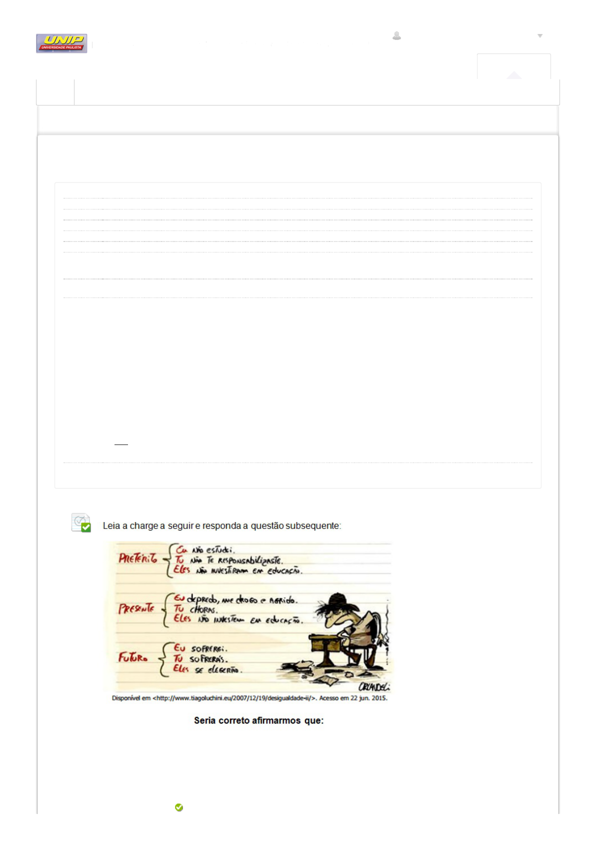 13/11/2017 Revisar envio do teste: Questionário Unidade II (2017/2) &... https://ava.ead.unip.br/webapps/assessment/review/review.jsp?attempt_id=_58641115_1&course_id=_223951_1&content_id=_1796210_1&retur… 1/9 Unidade II Revisar envio do teste: Questionário Unidade II (2017/2)H Você saiu recentemente do teste "Questionário Unidade II (2017/2)" sem enviá-lo. Volte para o teste e clique em Salvar e Enviar ou, para obter ajuda, entre em contato com o seu instrutor. X Revisar envio do teste: Questionário Unidade II (2017/2) Usuário cleziler.ferreira @unipinterativa.edu.br Curso Estudos Disciplinares IV Teste Questionário Unidade II (2017/2) Iniciado 13/11/17 19:33 Enviado 13/11/17 20:07 Status Completada Resultado da tentativa 5 em 5 pontos Tempo decorrido 34 minutos Instruções ATENÇÃO: a avaliação a seguir possui as seguintes configurações: - Possui número de tentativas limitadas a 3 (três); - Valida a sua nota e/ou frequência na disciplina em questão – a não realização pode prejudicar sua nota de participação AVA, bem como gerar uma reprovação por frequência; - Apresenta as justificativas das questões para auxílio em seus estudos – porém, aconselhamos que as consulte como último recurso; - Não considera “tentativa em andamento” (tentativas iniciadas e não concluídas/enviadas) – porém, uma vez acessada, é considerada como uma de suas 3 (três) tentativas permitidas e precisa ser editada e enviada para ser devidamente considerada; - Possui um prazo limite para envio (acompanhe seu calendário acadêmico), sendo impossível o seu acesso após esse prazo, então sugerimos o armazenamento e/ou impressão para futuros estudos; - A não realização prevê nota 0 (zero). Resultados exibidos Todas as respostas, Respostas enviadas, Respostas corretas, Feedback, Perguntas respondidas incorretamente Pergunta 1 .. I. Aos políticos, não interessa existirem pessoas informadas com capacidade crítica para avaliar seus mandatos. II. O pronome “eu” refere-se aos alunos corretos, o pronome “tu” refere-se aos alunos displicentes e o pronome “eles” refere-se à sociedade. III. O fato de não investirmos em educação nos transforma em um país destituído de senso crítico. Resposta Selecionada: c. Somente as afirmativas I e III estão corretas. Unip Interativa 0,5 em 0,5 pontos cleziler.ferreira @unipinterativa.edu.br 13/11/2017 Revisar envio do teste: Questionário Unidade II (2017/2) &... https://ava.ead.unip.br/webapps/assessment/review/review.jsp?attempt_id=_58641115_1&course_id=_223951_1&content_id=_1796210_1&retur… 2/9 Respostas: a. Somente as afirmativas I e II estão corretas. b. Somente as afirmativas II e III estão corretas. c. Somente as afirmativas I e III estão corretas. d. Somente a afirmativa I encontra-se correta. e. Somente a afirmativa III encontra-se correta. Feedback da resposta: Resposta: C Comentário: Na verdade, o pronome “eu” refere-se aos alunos displicentes, o pronome “tu” refere-se à sociedade e, por fim, o pronome “eles” refere-se aos políticos brasileiros que se elegem em função de uma massa desprovida de capacidade crítica e de análise. Pergunta 2 .. I. O progresso contínuo nos leva sempre para frente e para mais conquistas. II. A charge relaciona positivamente o desenvolvimento tecnológico e o bem-estar dos cidadãos. III. A charge indica que o caminho para o progresso exige perseverança. Resposta Selecionada: e. Nenhuma das afirmativas está correta. Respostas: a. Somente a afirmativa I está correta. b. Somente a afirmativa II está correta. c. Somente a afirmativa III está correta. d. Somente as afirmativas II e III estão corretas. e. Nenhuma das afirmativas está correta. Feedback da resposta: Resposta: E Comentário: Nenhuma das afirmativas se encontra correta, porque a charge mostra o quanto o progresso paralisa, atravanca, deixa o dia a dia enfadonho. Além disso, ela mostra não o bem-estar, mas o aprisionamento das pessoas. 0,5 em 0,5 pontos 13/11/2017 Revisar envio do teste: Questionário Unidade II (2017/2) &... https://ava.ead.unip.br/webapps/assessment/review/review.jsp?attempt_id=_58641115_1&course_id=_223951_1&content_id=_1796210_1&retur… 3/9 Pergunta 3 .. Por uma outra globalização Milton Santos Vivemos num mundo confuso e confusamente percebido. Haveria nisto um paradoxo pedindo uma explicação? De um lado, é abusivamente mencionado o extraordinário progresso das ciências e das técnicas, das quais um dos frutos são os novos materiais artificiais que autorizam a precisão e a intencionalidade. De outro lado, há, também, referência obrigatória à aceleração contemporânea e todas as vertigens que cria, a começar pela própria velocidade. Todos esses, porém, são dados de um mundo físico fabricado pelo homem, cuja utilização, aliás, permite que o mundo se torne esse mundo confuso e confusamente percebido. Explicações mecanicistas são, todavia, insuficientes. É a maneira como, sobre essa base material, se produz a história humana que é a verdadeira responsável pela criação da torre de babel em que vive a nossa era globalizada. Quando tudo permite imaginar que se tornou possível a criação de um mundo veraz, o que é imposto aos espíritos é um mundo de fabulações, que se aproveita do alargamento de todos os contextos (...) para consagrar um discurso único. Seus fundamentos são a informação e o seu império, que encontram alicerce na produção de imagens e do imaginário, e se põem ao serviço do império do dinheiro, fundado este na economização e na monetarização da vida social e da vida pessoal. Podemos afirmar que: O homem se encontra monetarizado, porque participa do império do dinheiro através das imagens e Isso se dá, porque Vivemos em um mundo confuso e confusamente percebido. Resposta Selecionada: a. As asserções I e II são verdadeiras e a segunda justifica a primeira. Respostas: a. As asserções I e II são verdade