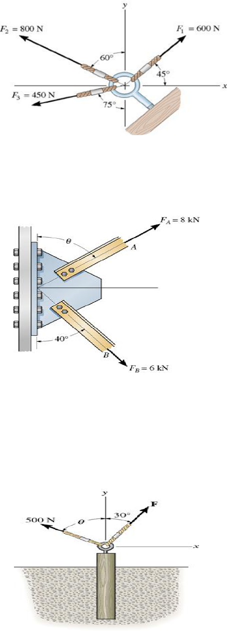 DISCIPLINA: Mecânica I 2016-2 Professor: Angela Marquez 1 Exercícios: 1- Determine a intensidade da força resultante FR e sua direção, medida no sentido horário, a partir do eixo x positivo. Resp: Fr = 867N 2- A chapa está submetida a duas forças em A e B, como mostrado na figura. Se θ = 60 0 , determine a intensidade da resultante das duas forças e sua direção a partir da horizontal. Resp: Fr = 10,8 kN , direção = 3,16 0 3- Usando a mesma figura determine o ângulo θ necessário para acoplar o elemento A a chapa de modo que a força resultante Fa e Fb seja orientada horizontalmente para a direita. Além disso informe qual é a intensidade da força resultante. Resp: Fr = 10,4 kN , direção = 54,9 0 4- Duas forças são aplicadas na extremidade de um olhal a fim de remover a estaca. Determine o ângulo θ (deve ser menor que 90 0 ) e a intensidade da força F, de modo que a força resultante que atua sobre a estaca seja orientada verticalmente para cima e tenha intensidade de 750N. Resp: θ = 18,6 0 F= 319 N DISCIPLINA: Mecânica I 2016-2 Professor: Angela Marquez 2 5- A caminhonete deve ser rebocada usando-se as corda. Determine a intensidade das forças Fa e Fb que atuam em cada corda a fim de produzir uma força resultante de 950N, orientada ao longo do eixo x positivo. Considere θ = 50 0 . Resp: Fa = 774N , Fb = 346N 6- A tora deve ser rebocada por dois tratores A e B. Determine as intensidades das duas forças de arrasto Fa e Fb se for necessário que a força resultante tenha intensidade de 10 kN e seja orientada ao longo do eixo x. Considerar θ = 15 0 Resp Fa = 3,66 kN, Fb = 7,07 kN 7- Duas forças são aplicadas à cabeça de um parafuso preso em uma viga. Determine a intensidade a direção e o sentido de uma resultante. Resp: Fr= 8,4 kN, direção = 19,0 0 DISCIPLINA: Mecânica I 2016-2 Professor: Angela Marquez 3 8- Três forças atuam sobre o suporte da figura. Determine a intensidade e a direção θ da F1, de modo que a força resultante seja orientada ao longo do eixo x´positivo e tenha intensidade de 1 kN. Resp: θ = 37,0 0 , F1= 889 N 9- Usando a mesma figura e considerando F1=300N e θ = 20 0 , determine a intensidade e a direção, medida no sentido anti-horário, a partir do eixo x´, da força resultante das três forças que atuam sobre o suporte. Resp: θ = 57,1 0 , Fr= 717 N 10- Dois cabos estão ligados em C e são carregados tal como mostrado. Determine a tração no cabo AC e no cabo BC. Resp: AC = 1983N, BC= 2191N