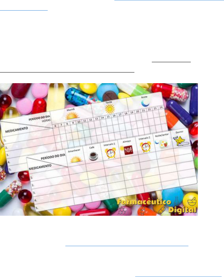 10 Orientações Importantes Sobre Uso Correto dos Medicamentos Um dos artigos mais acessados do blog é o » Como Escolher os Horários para Tomar os Medicamentos, no final deste artigo haviam várias orientações sobre o uso correto dos medicamentos. Porém, sempre achei que estas orientações tão importantes ficaram ofuscadas pela informação principal do artigo, cujo foco são os horários corretos para tomar os medicamentos. Então resolvi dividi-lo e escrever um artigo exclusivo com 10 Orientações Importantes sobre o Uso Correto dos Medicamentos. Você já sabe quais são os hábitos errados na hora de tomar o remédio e vai aprender agora algumas dicas muito legais para tomar o seu remédio da forma mais correta, com isso estará proporcionando a melhora ou o controle do seu problema de saúde da melhor forma. Esse é um dos princípios do Uso Racional de Medicamentos. 10 Orientações Importantes Sobre Uso Correto dos Medicamentos: 1º Organização – Se você precisa tomar mais de um medicamento é importante que se organize: 1. Evite usar aqueles organizadores de comprimidos em que você precise tirar o comprimido da embalagem original para colocar dentro. – “Porque? Esses organizadores são ótimos deixam tudo organizadinho para mim.” – Ok! Vou explicar os porquês enumerando algumas situações que podem até fazer o seu comprimido perder o efeito: 1º Ao tirar o comprimido da embalagem original você está contaminando o comprimido com micróbios externos e da sua mão, por mais que sua mão esteja limpinha. 2º Alguns comprimidos não podem entrar em contato com a luz (aqueles com cartelas foscas ou prateadas – que não são transparentes) ou até com o ar, quando você tira o comprimido da cartela original para colocar no seu organizador, ele entrará em contato com a luz ou o ar, o que poderá fazer com que seu princípio ativo seja degradado com facilidade e possa vir a perder ou diminuir o seu efeito. Ao manter o medicamento em sua embalagem original você garante a sua qualidade. Mas você precisa sair de casa e tem que levar o seu medicamento para tomar onde estiver. → Nesse caso você até pode tirar o comprimido da cartela e colocar no seu porta-comprimido no dia em que vai tomar o comprimido, somente no dia. O que não pode é deixar seus comprimidos a semana inteira dentro do organizador e ir tomando aos poucos. Outra sugestão é que retire a cartela da caixa e coloque em uma necessaire ou bolsinha na sua bolsa ou mochila. Ou também você pode recortar o comprimido da cartela e levá-lo na embalagem original ocupando o menor espaço possível até precisar tomá-lo. – Se eu não utilizar o meu organizador de comprimidos não vou conseguir lembrar de tomar os meus medicamentos. – Engano seu. 2. Utilize uma tabela ou uma agenda com os horários dos seus medicamentos e fixe na porta da geladeira com um imã. Montei dois modelos de tabelas para você baixar no seu computador e imprimir. Assim que baixar você irá preencher a tabela que preferir com os Nomes dos Medicamentos que faz uso contínuo ou de algum tratamento por tempo limitado. Como preencher as Tabelas com os Horários dos Medicamentos O esquema posológico é o mesmo para ambas Medicamento 1 → tomar de 6 /6 horas Medicamento 2 → tomar 1 x ao dia pela manhã Medicamento 3 → tomar de 12/12 horas Para a Tabela 1 » Marque com um X ou preencha o quadradinho dos horários que precisa tomar o medicamento na linha correspondente. Tabela 1 Para a Tabela 2 » Anote o horário que precisa tomar o medicamento na linha correspondente. Tabela 2 2º Na hora de Tomar os Medicamentos ♦ Lave as mãos antes de tomar o medicamento. ♦ Não utilize medicamentos com embalagem amassada, rasgada, sem rótulo, ou que tenha alguma informação apagada, riscada ou raspada. ♦ Quando for tomar seu medicamento, verifique sempre na embalagem: Sempre Verifique esses 3 Itens Nome do Medicamento Dose do Medicamento Data de Validade ♦ Procure tomar as cápsulas e comprimidos com água. Cerca de 200 ml de água (um copo), é uma boa quantidade, pois nesse volume, a água evita que o medicamento fique entalado ao ser deglutido. Além disso, essa quantidade faz com que o estômago se esvazie mais rápido e o princípio ativo do medicamento chegue mais mais rápido ao intestino, onde a maioria é realmente absorvida. ♦ O uso do leite ou suco de frutas não é recomendável, pois contém proteínas em sua composição. Essas proteínas podem se combinar com as moléculas do remédio e dificultar sua absorção; podem competir com o princípio ativo na absorção e acabar por dificultar e/ou atrasar a absorção. O leite ainda pode alcalinizar o estômago (diminuir sua acidez) e impedir a absorção de princípios ativos que dependem dessa acidez. 3 º Como Medir a Quantidade de Medicamento Líquido na Hora de Tomar » Quando é necessário tomar ou administrar medicamentos líquidos que precisam ser medidos em frascos externos, são utilizados alguns recursos como: 1- Copo-Medida Imagem: Bula Propan® / Reprodução Utilizado para medir medicamentos líquidos, em geral xaropes e soluções orais. Lave e seque o copo-medida antes e depois do uso. Encher o copo-medida com o medicamento até atingir a dose prescrita. 2- Seringa Dosadora Foto: Reci Embalagens / Adaptação Utilizada para medir medicamentos líquidos, em geral soluções orais. Lave e seque a seringa dosadora antes e depois do uso. Duas situações para utilizar a seringa: 1ª Situação: Quando possui o batoque → a pecinha que funciona como uma tampa interna do frasco do medicamento para encaixar a seringa dosadora. » Coloque o batoque na tampa do frasco do medicamento. Imagem: Bula Allegra®Pediátrico / Reprodução » Utilize a tampa externa do frasco do medicamento para fechar novamente e agite bem se houver a informação na bula ou no frasco para agitar antes do uso (Geralmente Precisa Agitar). »»[Leia a Bula do seu Medicamento] 