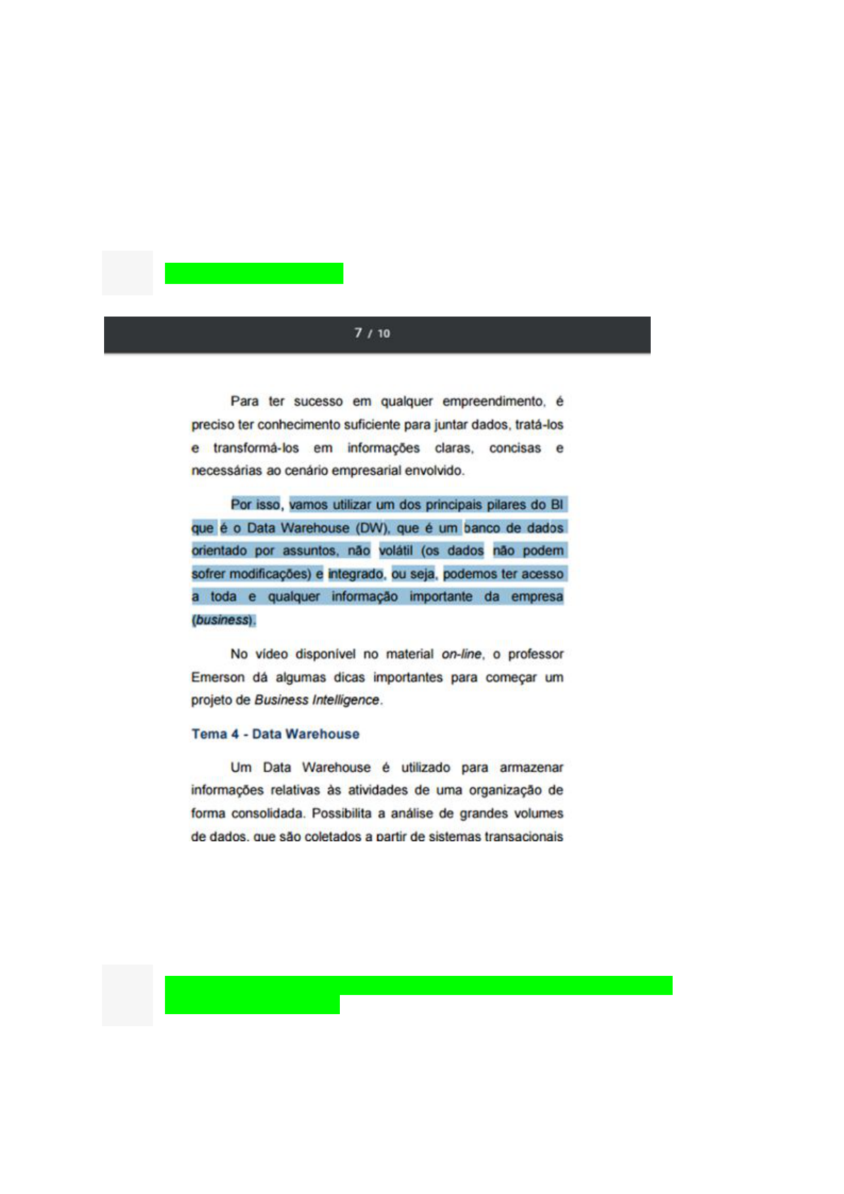 APOL 1 Questão 1/5 - Tópicos Avançados em Gestão Para sucesso de um empreendimento de BI, é necessário termos conhecimento suficiente para juntarmos dados, tratá-los e transformá-los em informações claras, concisas e necessárias ao cenário empresarial. Para isso, podemos utilizar vários pilares do BI. Qual item representa um destes pilares? A Data Warehouse (DW) Questão 2/5 - Tópicos Avançados em Gestão Um Data Warehouse é utilizado para armazenar informações relativas às atividades de uma organização de forma consolidada. Possibilita a análise de grandes volumes de dados, que são coletados a partir de sistemas transacionais (OLTP – On-line Transaction Processing). De acordo com este enunciado, como podemos definir um Data Warehouse? A É um banco de dados organizado para dar suporte à tomada de decisões estratégicas da empresa. Questão 3/5 - Tópicos Avançados em Gestão A demanda de automatização que o mundo corporativo vem sofrendo não é suficiente para torná-lo mais competitivo. É preciso muito mais. A necessidade de saber transformar os dados, analisá-los, armazená-los e ter de forma rápida e segura acesso a eles deu origem a uma nova ideia. De qual ideia estamos falando? A Business Intelligence Questão 4/5 - Tópicos Avançados em Gestão Um Data Warehouse é utilizado para identificação de tendências de mercado, perspectivas dos clientes e geração de ações que serão tomadas para que uma determinada organização esteja sempre competitiva diante do mercado. Não somente observando a ideia da utilização de um DW, mas dentro de uma perspectiva de informações e dados, qual é o bem mais precioso para uma organização? A A informação é o bem mais valioso para uma empresa. Questão 5/5 - Tópicos Avançados em Gestão Com a necessidade de respostas rápidas e acertadas às solicitações do mundo dos negócios, um Business Intelligence deve contar com instrumentos que ajudem na identificação e resultados como quais? A Identificação de tendências de mercado e hábitos de consumidores. Geração de previsões e planos de ação. APOL 2 Questão 1/5 - Tópicos Avançados em Gestão As arquiteturas de DW são constituídas por um conjunto de ferramentas que respondem, desde a carga, até o processamento de consultas. Além disto, contamos com alguns componentes importantes. Pensando sobre tais componentes, quais afirmativas estão corretas? i.Ferramentas de OCP. ii.Mecanismos para imagens. iii.Mecanismos para acessar e transformar dados. iv.Ferramentas para análise de dados. v.Ferramentas de gerência. C Itens iii, iv e v estão corretos. Questão 2/5 - Tópicos Avançados em Gestão As arquiteturas de DW são constituídas por um conjunto de ferramentas que respondem, desde a carga, até o processamento de consultas. Além disto, contamos com algumas tarefas essenciais para tomada de decisão. Pensando sobre tais tarefas para tomada de decisão, quais afirmativas estão corretas? i.Obter dados dos Bancos de Dados operacionais e externos ii.Armazenar os dados. iii.Fornecer informações para a tomada de decisão. iv.Fornecer processamento paralelo. v.Armazenar resultado das análises. A Itens i, ii e iii estão corretos. Questão 3/5 - Tópicos Avançados em Gestão As arquiteturas de DW são constituídas por um conjunto de ferramentas que respondem, desde a carga, até o processamento de consultas. Pensando sobre as ferramentas apropriadas para o desenvolvimento de um Data Warehouse, quais afirmativas estão corretas? i.Ferramentas de armazenamento de dados são responsáveis pelos relatórios. ii.Ferramentas de extração de dados são responsáveis pela filtragem, limpeza, sumarização e concentração dos dados. iii.Ferramentas de limpeza são responsáveis pela análise dos dados. iv.Ferramentas para pesquisa e relatórios permitem avaliar o que ocorreu. v.Ferramentas de OLAP permitem a análise do porquê dos resultados obtidos. D Itens ii, iv e v estão corretos. Questão 4/5 - Tópicos Avançados em Gestão Um Data Warehouse armazena as informações agrupadas por assuntos de interesse da empresa que são mais importantes. Os assuntos são os processos principais de uma organização. Quando falamos em processos, estamos focando naqueles processos de negócio que são atividades desenvolvidas na organização como transformação de entrada e saída com agregação de valor. São processos que mostram desempenho e que possuem indicadores de sua evolução. Pensando de tal forma, quais das alternativas abaixo representam algumas características de um Data Warehouse? i.Baseado em Assuntos. ii.Variável com o Tempo. iii.Extração de dados de fontes homogêneas. iv.Visualização dos dados em diferentes níveis. v.Volátil. C Itens i, ii e iv estão corretos. Questão 5/5 - Tópicos Avançados em Gestão As arquiteturas de DW são constituídas por um conjunto de ferramentas que respondem, desde a carga, até o processamento de consultas. Como se dá o armazenamento dos dados? B Como um repositório grande conjunto de todos os dados. APOL 3 Questão 1/5 - Tópicos Avançados em Gestão Relacione a coluna da esquerda com a coluna da direita: 1 - SGBD ( ) Não-volátil 2- DataWarehouse ( ) Armazenamento de dados históricos ( ) Baixa granularidade ( ) Menor necessidade de integração B 2, 2, 1 e 1 Rota de Aprendizagem, Tópicos Especiais GTI, Aula 04, Pag. 1-4. Questão 2/5 - Tópicos Avançados em Gestão Qual das alternativas abaixo apresenta uma das vantagens da Implementação Top Down? A Durante a construção dos Data Marts incrementais, é necessário que se mantenha um rígido controle do negócio como um todo. B Todos os negócios da empresa estão concentrados no Data Warehouse. Rota de Aprendizagem, Tópicos Especiais GTI, Aula 03, Pag. 5-7. C A construção dos Data Marts é altamente direcionada, permitindo um rápido desenvolvimento. D É a garantia da consistência dos dados, pois o modelo de dados para os