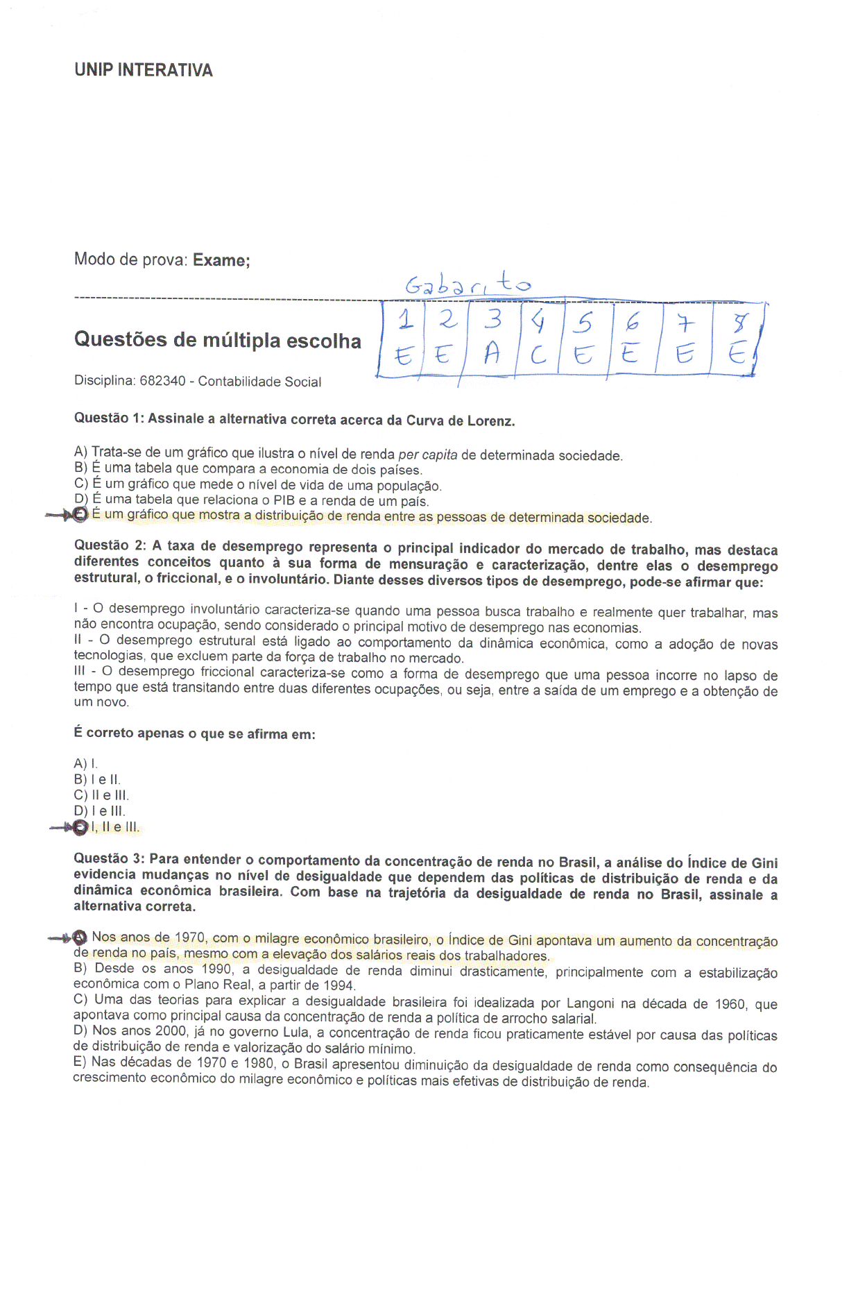 UNIP INTERATIVA Modo de prova: Exame; .“_'r ! " t" d 'It'l lh “23 <I/*6IIÉ II?Quesoes emu ipaesco a €€€ H,:CíiÉICÍÉIÉDisciplina: 682340—ContabilidadeSociaI ' ! " 'I Questão 1: Assinale a alternativa correta acerca da Curva de Lorenz. A) Trata-se de um gráfico que ilustra o nível de renda per capita de determinada sociedade. B) É uma tabela que compara a economia de dois países. C) É um gráfico que mede o nível de vida de uma população. D É uma tabela que relaciona o PIB e a renda de um país. —+ó É um gráfico que mostra a distribuição de renda entre as pessoas de determinada sociedade. Questão 2: A taxa de desemprego representa o principal indicador do mercado de trabalho, mas destaca diferentes conceitos quanto à sua forma de mensuração e caracterização, dentre elas o desemprego estrutural, o friccional, e o involuntário. Diante desses diversos tipos de desemprego, pode-se afirmar que: I - O desemprego involuntário caracteriza-se quando uma pessoa busca trabalho e realmente quer trabalhar, mas não encontra ocupação, sendo considerado o principal motivo de desemprego nas economias. ll - O desemprego estrutural está ligado ao comportamento da dinâmica econômica, como a adoção de novas tecnologias, que excluem parte da força de trabalho no mercado. Ill - O desemprego friccional caracteriza—se como a forma de desemprego que uma pessoa incorre no lapso de tempo que esta transitando entre duas diferentes ocupações, ou seja, entre a saida de um emprego e a obtenção de um novo. É correto apenas o que se afirma em: A) |. B) | e II. C) li e iii. D) | e lll. Aºi, II e iii. Questão 3: Para entender o comportamento da concentração de renda no Brasil, a análise do Índice de Gini evidencia mudanças no nível de desigualdade que dependem das políticas de distribuição de renda e da dinâmica econômica brasileira. Com base na trajetória da desigualdade de renda no Brasil, assinale a alternativa correta. 49 Nos anos de 1970, com o milagre econômico brasileiro, o Índice de Gini apontava um aumento da concentração de renda no pais, mesmo com a elevação dos salários reais dos trabalhadores. B) Desde os anos 1990, a desigualdade de renda diminui drasticamente, principalmente com a estabilização econômica com o Plano Real, a partir de 1994. C) Uma das teorias para explicar a desigualdade brasileira foi idealizada por Langoni na década de 1960, que apontava como principal causa da concentração de renda a política de arrocho salarial. D) Nos anos 2000, já no governo Lula, a concentração de renda ficou praticamente estável por causa das politicas de distribuição de renda e valorização do salário mínimo. E) Nas décadas de 1970 e 1980, o Brasil apresentou diminuição da desigualdade de renda como consequência do crescimento econômico do milagre econômico e politicas mais efetivas de distribuição de renda. Questão 4: Considerando a estrutura da Tabela de Recursos e Usos (TRU), leia as afirmativas a seguir: I — As tabelas de recursos e usos são constituídas por três matrizes. ll - As matrizes que formam a TRU são: A - Oferta, A1 - Produção, A2 - Importação, B1 - Consumo Intermediário (insumos), B2 — Despesa final e C - Componentes do valor adicionado. llI - Para a obtenção dos resultados de cada matriz, deve-se realizar as seguintes operações: A = A1 + A2, A = B1 +BZ e C = A1 - Bl. É correto apenas o que se afirma em: A) I e II. B) I e Ill. % II e iii. D) III. E) I, II e III. Questão 5: A metodologia sobre a mensuração e a valoração de tudo que é produzido e consumido num país em dado período de tempo, isto é, um ano, cuja estrutura é conhecida como contas nacionais, segue os princípios contábeis e as diretrizes da Organização das Nações Unidas - ONU, Fundo Monetário internacional - FMI, Organização para Cooperação e Desenvolvimento Econômico - OCDE e do Banco Mundial. No Brasil, a contabilidade social é realizada pelo Instituto Brasileiro de Geografia e Estatística - IBGE, que segue essas mesmas diretrizes, bem como faz as adaptações necessárias às especificidades da economia brasileira. Quanto à metodologia das contas nacionais, analise as seguintes afirmativas: I - A metodologia das contas nacionais tem evoluído no tempo. Objetivando se manter atualizada, acompanha a sofisticação dos mercados financeiros e as complexidades econômicas. Tem flexibilidade, pois possibilita a adaptação de economias de diferentes níveis: político, econômico e social. Também é harmônica, na medida em queé compativel com outras estatísticas internacionais. II - As mudanças das séries de dados do Sistema de Contas Nacionais ocorrem anualmente desde a atualização do Sistema de Contas Nacionais do Brasil, publicada em 1997, com a adoção das recomendações internacionais, com base no manual System of NationalAccounts (SNA) 1993. III — A metodologia das contas nacionais tem que ser atualizada, flexível e harmônica. É correto apenas o que se afirma em: A) | e ii. B) | e iii. C) li e iii. D) Ill. _pe I, II e lll. Questão 6: Uma medida de desigualdade de renda muito importante é o Índice de Gini: “Sua popularidade deriva da relativa facilidade de entendimento de seu significado e por sua aderência a uma série de propriedades entendidas como interessantes nos estudos de distribuição.” (JANNUZZl, P. M. Indicadores sociais no Brasil, 2001, p. 97). Sobre esse índice, assinale a alternativa incorreta. A) No Brasil, o Índice de Gini atinge um valor próximo a 0,5, que, na prática, representa um grau de desigualdade extrema na distribuição da renda. B) A medida assume valor mínimo de zero, situação de igualdade perfeita da distribuição de rendimentos, e valor máximo de um, situação de extrema desigualdade, em que uma família ou pessoa se apropria de toda a rendadisponível em determinada sociedade. O) Algumas ressalvas são feitas em relação ao Índice