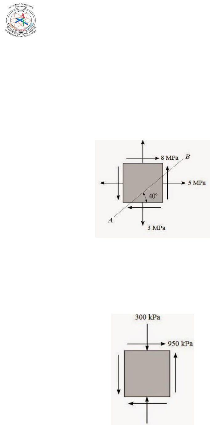 Fundação Presidente Antônio Carlos Faculdade Presidente Antônio Carlos de Teófilo Otoni LISTA DE EXERCÍCIOS 1 Disciplina: Resistência dos Materiais II Curso: Engenharia Civil Professor: Matheus da Silva Lages Data para entrega da lista: 13/03/2018 1) O estado de tensão em um ponto em um elemento estrutural é mostrado no elemento abaixo. Determine as componentes de tensões que agem no plano AB no plano inclinado. Use as equações de transformação de tensão Resposta: σx’ = - 4,0520 MPa ; τx’y’ = - 0,4043 MPa 2) Determine o estado de tensão equivalente em um elemento se ele estiver orientado a 30º em sentido anti- horário em relação ao elemento mostrado. Represente o novo estado de tensão. Use as equações de transformação de tensão. Resposta: σx’ = 747,72 kPa ; σy’ = -1047,72 kPa ; τx’y’ = 345,09 MPa 3) O estado de tensão em um ponto é mostrado no elemento abaixo. Determine: a. As tensões principais b. A tensão de cisalhamento máxima no plano e a tensão normal média no ponto Obs.: Especifique a orientação do elemento em cada caso. Resposta (a): σ1 = 4,2093 MPa ; σ2 = - 34,2093 MPa (b): τ máx = 19,2093 MPa ; σ méd = - 15 MPa 4) Uma parede de uma construção de concreto reforçado está submetida a uma carga vertical uniforme de intensidade q e a uma força horizontal H (que representa os efeitos de carregamentos de vento), como ilustrado na primeira parte da figura. Como consequência dessas cargas, as tensões no ponto A na superfície da parede têm os valores: tensão de cisalhamento igual a - 3,3 MPa e tensão de compressão de 7,6 MPa. Determine: a. As tensões principais b. A tensão de cisalhamento máxima no plano e a tensão normal média no ponto
