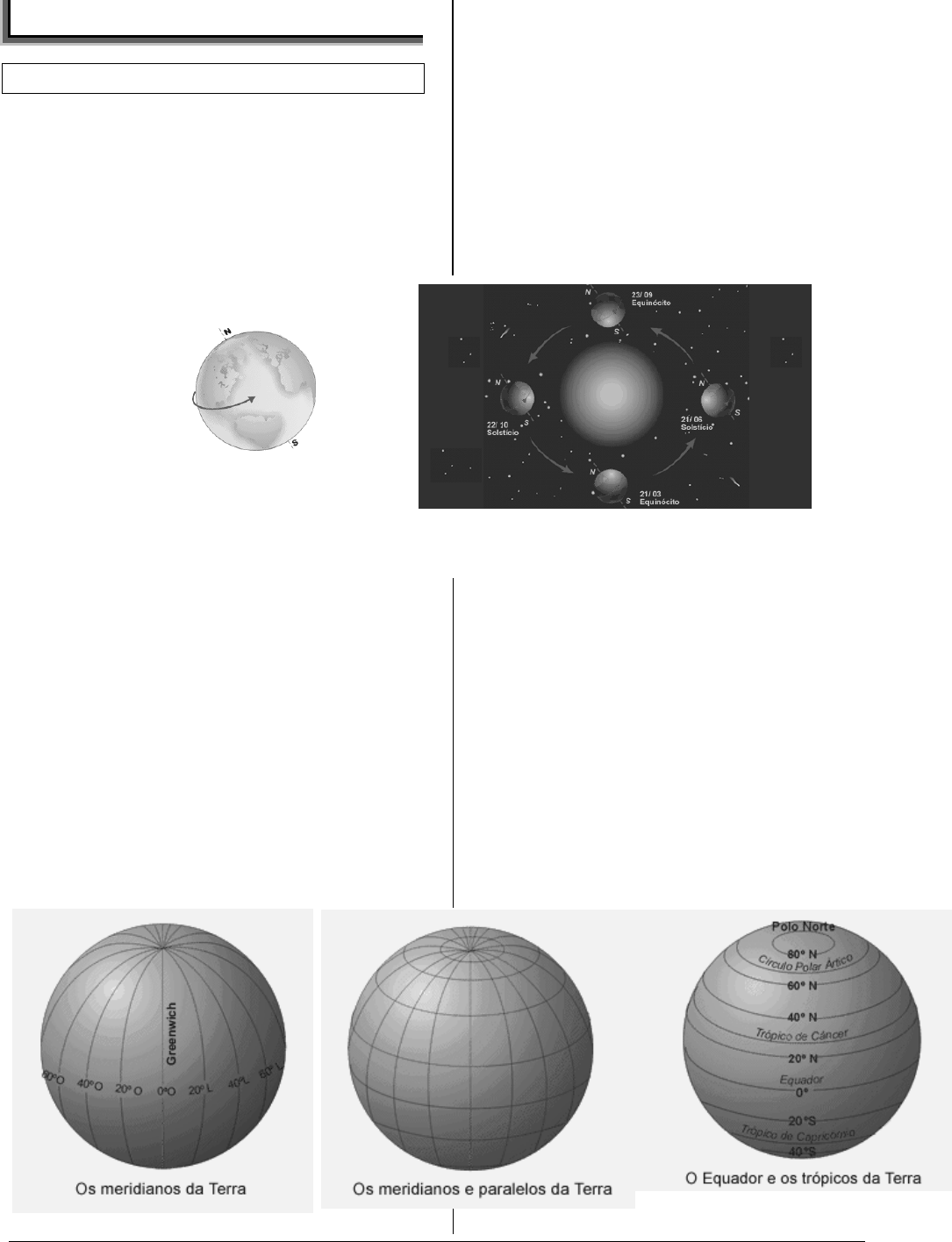 Inclusão para a Vida Geografia A Pré-Vestibular da UFSC 1 UNIDADE 1 A Terra realiza diversos movimentos. Os principais são a ROTAÇÃO e a TRANSLAÇÃO. A rotação é o movimento que a Terra faz em torno de seu próprio eixo, sua duração é de 24 horas e a sua principal consequência é a sucessão das noites e dos dias. A rotação se dá no sentido de oeste à leste, sendo sua velocidade da ordem de 1660 km por hora nas proximidades do Equador. O movimento que a Terra faz ao redor do Sol, uma curva fechada de forma elíptica, é chamado de translação. A duração desse movimento é de 365 dias e 6 horas. O planeta encontra-se mais próximo do Sol (periélio) no início do ano e mais distante dele (afélio) no meio do ano. Como o ano convencional dura somente 365 dias e a translação é de 365 dias e 6 horas, essa diferença de 6 horas é compensada de 4 em 4 anos, acrescentando um dia a mais no mês de fevereiro. O ano de 366 dias, com 29 dias em fevereiro, é denominado de bissexto. A principal consequência do movimento de translação é a sucessão das estações do ano: primavera, verão, outono e inverno. ROTAÇÃO TRANSLAÇÃO COORDENADAS GEOGRÁFICAS E FUSOS HORÁRIOS O Planeta Terra é cortado por linhas imaginárias cuja função é localizar qualquer ponto em sua superfície. Com essa finalidade, determinam-se as coordenadas geográficas: a longitude e a latitude. Se você quiser localizar algum ponto no globo terrestre, saiba que o Equador é o maior círculo “perpendicular” ao eixo do planeta. O Equador divide a Terra em dois hemisférios: Sul e Norte. Acima e abaixo do Equador, podemos traçar infinitos círculos paralelos que, à medida que se afastam para o Sul ou para o Norte, diminui de tamanho. A distância dos paralelos é medida em graus. Portanto, chamamos de latitude a distancia, em graus, de qualquer lugar da superfície terrestre em relação ao Equador. Entretanto, jamais acharemos algum ponto na Terra se conhecermos somente sua latitude. Precisamos cruzar as duas coordenadas: latitude e longitude. Esta é a distancia, também medida em graus, de qualquer lugar da superfície terrestre em relação ao Meridiano de Greenwich – uma cidade próxima de Londres - que divide o planeta em dois hemisférios: ocidental e oriental. Os meridianos são círculos que vão de pólo a pólo, tendo por esta razão, o mesmo comprimento. A localização de áreas do planeta por meio das coordenadas geográficas é essencial para as viagens marítimas, a navegação aérea, sendo muito útil para planejar e efetuar operações militares. O comandante de um navio, o piloto de avião e os generais que coordenam ataques precisam saber seu ponto de destino e, no caso militar, as regiões que serão atingidas. OS MOVIMENTOS DA TERRA Geografia A Inclusão para a Vida Pré-Vestibular da UFSC 2 OS FUSOS HORÁRIOS Como você aprendeu anteriormente, a rotação da Terra é o movimento responsável pela sucessão de dias e noites. Mas também é a causa das diferenças de horário entre as diversas regiões do planeta. Em relação ao Meridiano de Greenwich, qualquer ponto sobre a superfície terrestre varia de 00 a 1800 para Oeste ou Leste. Assim, a longitude completa da Terra é de 3600 que, divididos pelas 24 horas de duração do dia, dão como resultado 150. Dessa maneira, a cada 150 que nosso planeta gira corresponde a 1 hora. Portanto, ao dividirmos o mundo em 24 partes (conforme a duração do dia), cada uma delas significa um fuso horário. Em 1895, quando da Conferência de Geografia realizada em Londres, foi estipulado que todas as regiões dentro de um mesmo fuso adotariam o mesmo horário. Na ocasião, também foi estabelecido que o Meridiano de Greenwich fosse o meridiano de referência, em função do qual todos os relógios do planeta são acertados. Exercícios de Sala � 1. (UFMS) A Terra possui uma inclinação de 23º 27’ em seu eixo, em relação ao plano da órbita. Tal inclinação, associada ao seu movimento de rotação e translação, propicia a incidência dos raios solares de maneira diferente sobre o globo terrestre. . Sobre o movimento de translação identificado no esboço acima, é correto afirmar que: 01. o movimento de translação é o movimento que a Terra realiza em torno de um eixo imaginário que a atravessa de pólo a pólo; 02. no dia 21 de março nós temos o equinócio de primavera para o hemisfério sul e o equinócio de outono para o hemisfério norte; 04. nos dias 21 de junho e 21 de dezembro ocorrem os dias de solstício, ou seja, quando há máxima desigualdade na distribuição de luz e calor entre os hemisférios; 08. os dias 21 de março e 23 de setembro, também conhecidos como equinócios, são os dias do ano em que os raios solares estão distribuindo de forma equitativa luz e calor para os dois hemisférios; 16. no dia 21 de junho temos o solstício de verão no hemisfério norte e o solstício de inverno no hemisfério sul; 32. no solstício de inverno, no hemisfério sul, ocorre o dia mais longo e a noite mais curta do ano. 2. (UEPG-PR) Com relação ao Sistema Solar, assinale o que for correto. 01 Acreditando que a Terra era o centro do Universo, Cláudio Ptolomeu criou um modelo geocêntrico para o Sistema Solar. Séculos mais tarde, Nicolau Copérnico apresentou o sistema heliocêntrico, com o Sol, e não mais a Terra, no centro do sistema planetário. 02. O Sistema Solar é constituído pelo Sol, planetas, satélites, asteroides, meteoroides, cometas e poeira. 04. Mercúrio é o planeta mais próximo do Sol e Plutão, o mais distante. 08. Quando se coloca entre o Sol e a Terra, em Inclusão para a Vida Geografia A Pré-Vestibular da UFSC 3 circunstâncias favoráveis, a Lua, que é o único satélite natural da Terra, pode provocar um eclipse do Sol. 16. No Sistema Solar, os maiores planetas se encontram mais próximos do Sol e os menores, mais afastados dele. UNIDADE 2 O CLIMA DA TERRA CLIMA • O clima é o c
