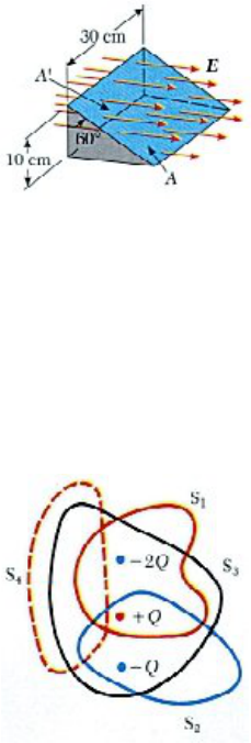 Lista de Exercícios - 2 Lei de Gauss – Campo Elétrico Auto-avaliação: Eletrostática Problemas 1. Um campo elétrico uniforme ai + bj intercepta uma superfície plana de área A. Qual o fluxo elétrico através dessa área se a superfície (i) estiver no plano yz? (ii) Estiver no plano xz? (iii) Estiver no plano xy? 2. Considere um prisma triangular num campo elétrico horizontal E = 7.8 X 104 N/C, como mostra a figura abaixo. A face inclinada faz um angulo de 60o com a face vertical. Calcular o fluxo elétrico através (i) da face vertical à esquerda, (ii) da face superior inclinada e (iii) de toda a superfície prismática. 3. Um anel circular, de 40 cm de diâmetro, gira num campo elétrico uniforme até que se encontre a posição de fluxo elétrico máximo através dele. 0 fluxo, nessa posição, é 5,2× 105 Nm2/C. Qual a intensidade do campo elétrico? 4. Na figura abaixo, estão desenhadas esquematicamente quatro superfícies fechadas S1, S2, S3 e S4. São também mostradas as cargas - 2Q, +Q e -Q. Achar o fluxo elétrico através de cada superfície. 5. Uma carga puntiforme de 12 μ C está colocada no centro de uma casca esférica de raio 22 cm. Qual o fluxo elétrico total através (i) de toda a superfície da casca e (ii) de um hemisfério da casca? (iii) Os resultados achados dependem do raio? Explique. 6. Uma carga de 12× 10-6 C está no centro geométrico de um cubo. Qual o fluxo elétrico através de uma das faces do cubo? 7. Uma carga puntiforme Q está localizada acima do centro da base de um hemisfério de raio R, como mostra a figura abaixo. Considere que a distância δ tende a zero. (i) Qual o fluxo elétrico através da superfície curva do hemisfério? (ii) Qual o fluxo elétrico através da base do hemisfério? 8. Num dia claro, de sol, sobre um terreno plano (condutor), há um campo elétrico vertical, dirigido para baixo, da ordem de 130 N/C. (Esse campo pode variar consideravelmente seu módulo e pode ser invertido pela presença de nuvens.) Qual a densidade de carga superficial no solo nessas condições? 9. Uma bola de borracha, cheia, com a forma de uma esfera de 12 cm de raio, tem carga total de 7 μ C, uniformemente distribuída sobre a sua superfície. Calcular a intensidade do campo elétrico nas seguintes distâncias ao centro da bola: (i) 10 cm, (ii) 12.5 cm e (iii) 30 cm. 10. Uma esfera isolante, de 8 cm de diâmetro, tem uma carga de +5,7 μ C uniformemente distribuída por todo o seu volume. Calcular a carga envolta por uma superfície esférica, concêntrica, com os seguintes raios: (i) r = 2 cm e (ii) r = 4 cm. 11. Uma casca esférica condutora, de raio 15 cm, tem um excesso de carga de -6,4 μ C, uniformemente distribuído sobre a sua superfície. Achar o campo elétrico nos pontos (i) que estejam no exterior da casca e (ii) no interior da casca. 12. Uma cilindro metálico, retilíneo e comprido, tem raio de 5 cm e carga por unidade de comprimento de 30 nC/m. Achar o campo elétrico nas seguintes distâncias em relação ao eixo do cilindro: (i) 3 cm, (ii) 10 cm, (iii) 100 cm. 13. Uma esfera condutora oca está dentro de uma casca esférica condutora, que lhe é concêntrica. A esfera interna tem um excesso de carga negativa - Q, e a esfera externa um excesso de carga positiva + 3 Q. As cargas estão em equilíbrio eletrostático. Usando a lei de Gauss, achar o campo elétrico em todo espaço. Qual a distribuição de cargas na casca esférica? Desenhe as linhas de campo em todo espaço. O que mudaria se a esfera fosse maciça.? 14. Um fio metálico, retilíneo, comprido, está envolto por uma superfície metálica oca cujo eixo coincide com o fio. 0 fio, maciço, tem uma carga por unidade de comprimento igual a + λ , e o cilindro oco uma carga líquida por unidade de comprimento de +2λ . Com essa informação, usar a lei de Gauss para achar (i) a carga por unidade de comprimento sobre as faces interna e externa do cilindro oco e (ii) o campo elétrico, no exterior do cilindro oco, a uma distância r do eixo. 15. Uma esfera não condutora sólida de raio a, tem uma densidade uniforme de carga ρ e uma carga total Q. Concêntrica a esta esfera está uma casca condutora que não está carregada com raio interno b e raio externo c. (i) Calcule o campo elétrico em todo espaço. (ii) Determine a carga induzida por unidade de área nas superfícies interna e externa da casca. Respostas 1. (i) aA, (ii) bA, (iii) 0. 2. (i) − 2340 Nm2/C, (ii) +2340 Nm2/C, (iii) 0. 3. 4.14× 106 N/C. 4. Φ (S1)= − Q/ε 0, Φ (S2)=0, Φ (S3)= − 2Q/ε 0, Φ (S4)=0. 5. 1.36× 106 Nm2/C, 6.78× 105 Nm2/C, não. 6. 2.26× 105 Nm2/C. 7. (i) Φ =Q/2ε 0, (ii) Φ =− Q/2ε 0 8. 1.15× 10-9 C/m2. 9. (i) 0, (ii) 4.03× 106 N/C, (iii) 7× 105 N/C. 10. (i) 7.14× 10-7 C, (ii) 5.7× 10-6 C. 11. (i) 2.56× 106 N/C (radial para dentro), (ii) zero. 12. (i) zero, (ii) 5400 N/C, (iii) 540 N/C. 13. Dentro da esfera E=0, entre as esfera e a casca E= kQ/r2, dentro da casca E=0, fora da casca E= k 2Q/r2. 14. (i) − λ , 3 λ (ii) E= 6 kλ /r. 15. (i) r<a E=ρ r/3ε 0, a<r<b E= kQ/r2, b<r<c E=0, r>c E= kQ/r2, (ii) δ i= − Q/4π b2, δ e= Q/4π c2.