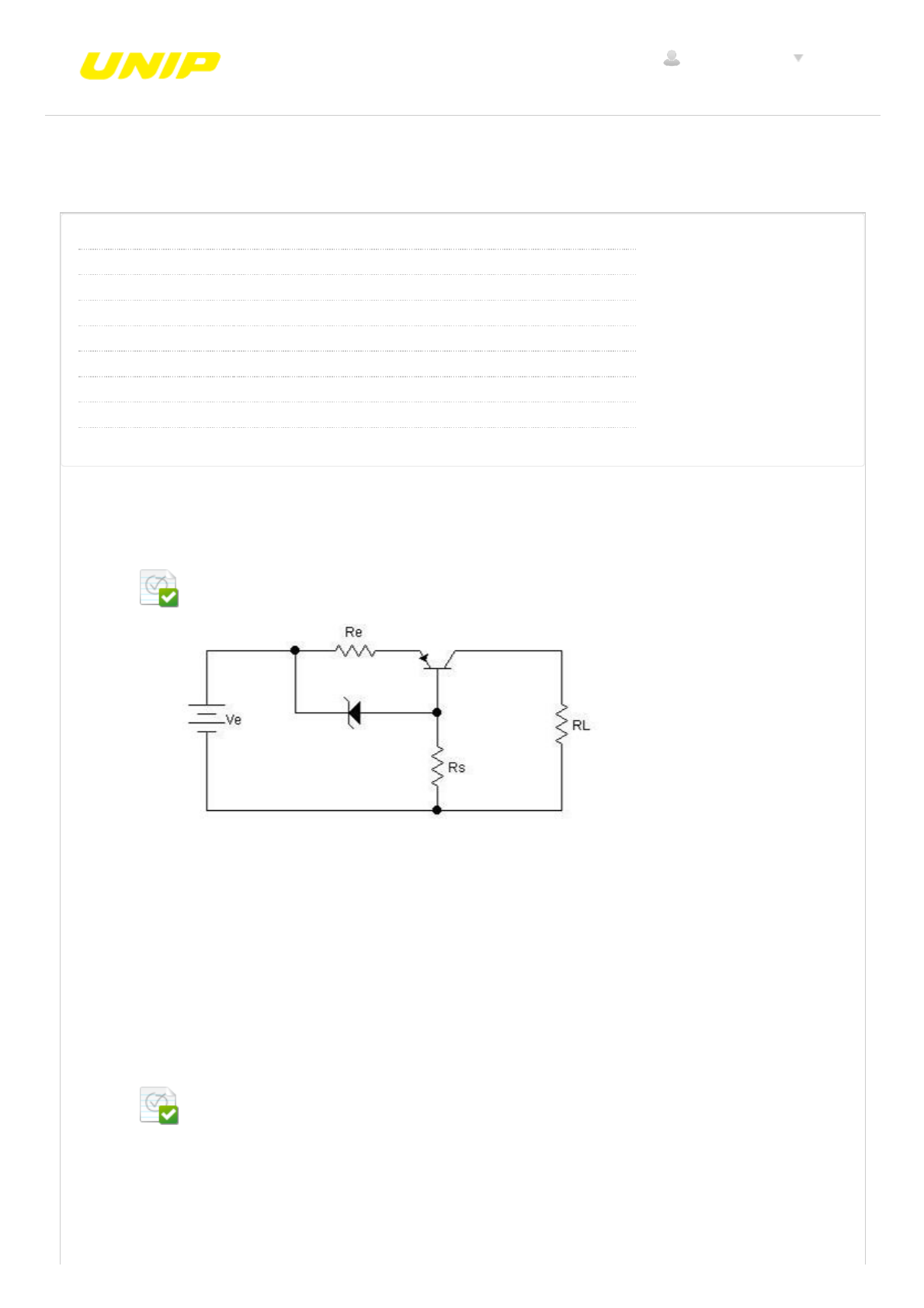 17/05/2018 Revisar envio do teste: QUESTIONÁRIO UNIDADE I – D688_... https://ava.ead.unip.br/webapps/assessment/review/review.jsp?attempt_id=_4545518_1&course_id=_10900_1&content_id=_174088_1&return_content=1&step= Revisar envio do teste: QUESTIONÁRIO UNIDADE I CIRCUITOS ELETRON PARA ELETROT D688_15306_A_R_20181 CONTEÚDO Usuário LUIZ FERNANDO SOBRINHO LOPES Curso CIRCUITOS ELETRON PARA ELETROT Teste QUESTIONÁRIO UNIDADE I Iniciado 17/05/18 18:15 Enviado 17/05/18 18:27 Status Completada Resultado da tentativa 3 em 3 pontos Tempo decorrido 11 minutos Resultados exibidos Respostas enviadas, Perguntas respondidas incorretamente Pergunta 1 Resposta Selecionada: No regulador de corrente, sabendo-se que a tensão Vz = 5,6V, a corrente de saída igual a 100 mA e a tensão Veb = 0,6V. O valor do resistor Re será: 50 Ohms. Pergunta 2 Para o ampli�cador a seguir, determinar os valores de: (IDq ,VGSq) e VDSq. São dados: IDSS = 4mA, VDD = 12 V, RD = 1K Ohms, RG = 1M Ohms e VP = -5V CONTEÚDOS ACADÊMICOS BIBLIOTECAS MURAL DO ALUNOASSOCIADA / COLIGADA 0,3 em 0,3 pontos 0,3 em 0,3 pontos LUIZ LOPES 1 17/05/2018 Revisar envio do teste: QUESTIONÁRIO UNIDADE I – D688_... https://ava.ead.unip.br/webapps/assessment/review/review.jsp?attempt_id=_4545518_1&course_id=_10900_1&content_id=_174088_1&return_content=1&step= Resposta Selecionada: d. IDq = 4 mA, VGSq = 0V e VDS = 8V. Pergunta 3 Resposta Selecionada: a. Calcular o valor de VE, sabendo-se que: Pz = 100 mW, VZ = 5V, RS = 100 Ohms e RL = 50 Ohms. VE = 17V. Pergunta 4 Resposta Selecionada: e. No circuito de autopolarização a JFET, pode-se a�rmar que: A tensão VGS = - Rs Id, em que Rs = resistor de fonte e Id a corrrente de dreno. Pergunta 5 No regulador de corrente, pode-se a�rmar que: 0,3 em 0,3 pontos 0,3 em 0,3 pontos 0,3 em 0,3 pontos 17/05/2018 Revisar envio do teste: QUESTIONÁRIO UNIDADE I – D688_... https://ava.ead.unip.br/webapps/assessment/review/review.jsp?attempt_id=_4545518_1&course_id=_10900_1&content_id=_174088_1&return_content=1&step= Resposta Selecionada: A corrente de saída é constante dentro de uma faixa de variação da tensão de entrada. Pergunta 6 Resposta Selecionada: c. Aproximadamente -2,6V. Pergunta 7 Resposta Selecionada: a. Para o ampli�cador de pequenos sinais a JFET, pode-se a�rmar que: No circuito ampli�cador de pequeno sinal de autopolarização, a tensão entre porta e fonte (Vgs) é igual em módulo a tensão sobre o resistor de fonte Rs. Pergunta 8 Para o regulador de tensão a seguir, Ve = 10V, Rs = 50 Ohms, Vz = 5,0V/200mW, se RL = aberto, o zener: 0,3 em 0,3 pontos 0,3 em 0,3 pontos 0,3 em 0,3 pontos 17/05/2018 Revisar envio do teste: QUESTIONÁRIO UNIDADE I – D688_... https://ava.ead.unip.br/webapps/assessment/review/review.jsp?attempt_id=_4545518_1&course_id=_10900_1&content_id=_174088_1&return_content=1&step= Quinta-feira, 17 de Maio de 2018 18h27min18s BRT Resposta Selecionada: e. A potência no zener será de 500mW. Pergunta 9 Resposta Selecionada: b. Para o JFET, sabendo-se que Id = Idss (1 - Vgs/Vp)² , pode-se a�rmar que: A corrente é máxima quando Vgs = 0. Pergunta 10 Resposta Selecionada: b. VGSq = -1,8V e IDq = 2,4 mA. ← OK 0,3 em 0,3 pontos 0,3 em 0,3 pontos