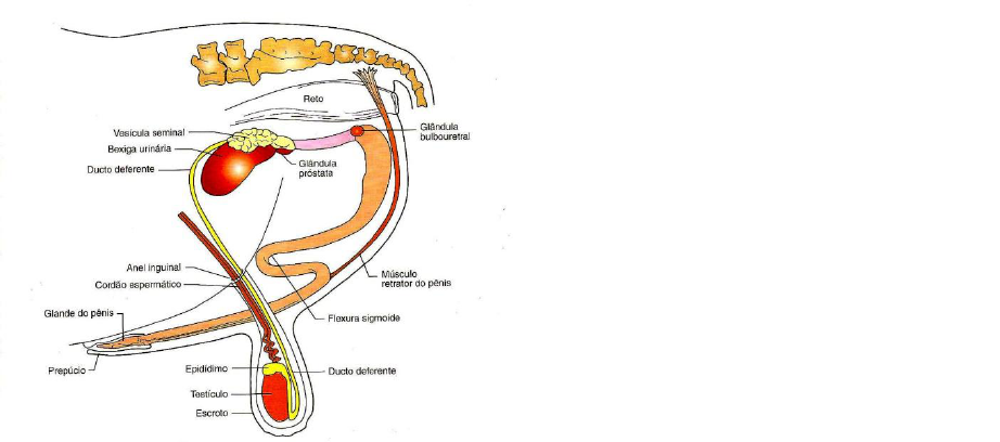 Anatomia do sistema reprodutor masculino Bolsa escrotal Túnica vaginal Testículos Epidídimo Glândulas acessórias Ampola Prostata Gl. Bulbouretral Gll. Vesiculares Pênis Prepúcio Vias de infecção Penetração por lesão direta: machucado, pancada, chute- traumas em geral que levem à abertura para bactérias. Ascendente: vinda do canal uretral. Pouco comum em machos pelo comprimento do canal uretral. Via hematógena: via importante para algumas bactérias, podendo causar um quadro de inflamação do trato urinário. Bolsa escrotal Trata-se de uma continuação da pele, com presença de folículo piloso e grande quantidade de glândulas sudoríparas. A bolsa escrotal recobre a gônada masculina e mantém a temperatura adequada ao orgão. Para que ocorra espermatogênese adequada, é necessário que a temperatura escrotal esteja cerca de 1ºC a menos que a temperatura corporal. O músculo cremáster tem a função de retrair ou relaxar de acordo com a temperatura do ambiente. Em dias mais frios, ele se contrai, trazendo a bolsa mais perto do corpo e assim aumentando a temperatura; em dias mais quentes, o músculo relaxa e permite a perda de calor pela gônada. Inflamação: O maior prejuízo em inflamações escrotais é que, pelo aumento da circulação sanguínea, haverá elevação da temperatura, dificuldade na termorregulação, e, consequentemente, a espermatogênese será prejudicada. Essas inflamações podem ser agudas ou crônicas, dependendo da causa. Dentre as causas: Hipospadia: ocorre quando há uma abertura ventral da uretra para a bolsa escrotal. Ao urinar, entra urina que é lesiva aos tecidos, causando lesão no escroto Frio em excesso: necrose por isquemia Dermatites generalizadas Traumas → Caso: cão da prof. Aline, no verão foi levado para tosar e foi passada a máquina de tosa na bolsa escrotal do cão. Criou-se várias lesões, causando desconforto e inflamação. Neoplasias de bolsa escrotal Mastocitoma Neoplasia (maligna) de maior ocorrência em bolsa escrotal. O prognóstico é bastante desfavorável por conta da grande concentração de vasos linfáticos na área, favorecendo metástases, além de ser muito invasivo. Mastocitoma causa úlcera estomacal por conta da elevada taxa de degranulação de histamina dos mastócitos, então é comum o animal apresentar hematêmese e hematoquesia. Hemangioma/ hemangiossarcoma Tumor maligno de vasos sanguíneos. Pit bulls são cães com maior predisposição. Carcinoma de células escamosas Bolsa escrotal e túnica vaginal A túnica vaginal é uma extensão da parede abdominal que se projeta para a bolsa escrotal. Portanto, qualquer alteração na cavidade abdominal, irá se refletir na bolsa. Cavidade abdominal Bolsa escrotal Conteúdo Ascite Hidrocele Translúcido Hematoperitônio Hematocele Sangue Linfa Quilocele Linfa Inflamação Orquite; epididimite; Peritonite Exsudato Testículos Os testículos têm em seu interstício as células de Leydig, que são produtoras de testosterona. A testosterona produzida por elas, será absorvida pelas células de Sertoli. Uma vez que a testosterona é absorvida, estimular a formação de espermatozoide: Após a produção, os espermatozoides irão sofrer maturação ao longo dos túbulos epididimários até que estejam prontos para serem eliminados pela ejaculação. Barreira hemato-testicular: é o tecido constituído basicamente por células de Sertoli, e faz a separação entre o interstício e o túbulo seminífero. É responsável pela seleção de todo o conteúdo que pretende passar para os testículos. O testículo é um órgão extremamente protegido pois sua integridade é que garante a procriação da espécie. Pela barreira, só passa substâncias de ordem vital, como os nutrientes. Quando a barreira é lesada, ocorre uma grande reação inflamatória, pois as células inflamatórias não reconhecem as células testiculares como própria. Anomalias do desenvolvimento Criptorquidismo Durante a fase inicial da vida dos machos, o testículo está retido no abdômen. Conforme os animais amadurecem sexualmente, testículo começa a descer, pelo canal inguinal, até chegar ao escroto, onde a temperatura é mais adequada para a espermatogênese, logo em seguida ocorre o fechamento do funículo espermático. Um animal criptorquida, possui a gônada retida na cavidade abdominal. Trata-se de uma alteração bastante comum e pode se apresentar uni ou bilateral, dependendo da quantidade de gônadas retidas na cavidade. Causas: Hipoplasia testicular: Animal nasce com o testículo menor e por isso tem facilidade de movimentar-se da bolsa escrotal para a cavidade abdominal. Exposição à estrógenos durante a prenhez: pois é umas das causas de hipoplasia testicular Partos com fetos de apresentação posterior: nesses fetos acredita-se que tenha uma maior abertura do funículo espermático, favorecendo a passagem da gônada para a cavidade Causas genéticas: Equinos possuem fator genético dominante para a anomalia, desta forma, todo macho criptorquida deve ser castrado e eliminado da reprodução (ética profissional). Animais com onfaloflebite: a inflamação leva a fragilidade da musculatura dificultando o fechamento do funículo Consequências: Diminuição da fertilidade do animal: gônada retida está em temperatura alta Predisposição a neoplasias: O testículo retido pode sofrer uma modificação tumoral, formando uma massa maligna, podendo culminar até mesmo com a morte do animal→ Teratomas (equinos) Sertolioma ou seminoma (cães mais velhos). São tumores malignos com prognósticos desfavoráveis. Hermafroditismo Para a patologia, só é considerado hermafroditismo verdadeiro quando o animal possui as duas gônadas (ovário e testículo), e neste contexto, os animais são estéreis. As duas gônadas fusionadas são chamadas de ovoteste ou ovarioteste pois as características teciduais se misturam Biangular unilateral: Tem ovoteste de um lado e uma gônada defin