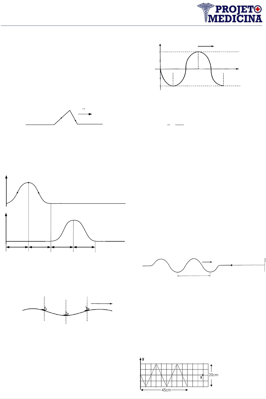 Prof. André Motta - mottabip@hotmail.com 1 | P r o j e t o M e d i c i n a – w w w . p r o j e t o m e d i c i n a . c o m . b r Exercícios de Física Ondulatória 1. UEM-A figura abaixo representa um pulso triangular, movimentando-se para a direita, com velocidade V ao longo de uma corda esticada. a) Para a situação indicada represente as velocidades vetoriais dos pontos A e B. b) Os pontos A e B movimentam-se com a velocidade de propagação V? Justifique. VBA 2. FUVEST- A figura representa, nos instantes t = 0 e t = 2,0s, configurações de uma corda sob tração constante, na qual se propaga um pulso cuja forma não varia. Qual a velocidade de propagação do pulso? Indique a direção e o sentido das velocidades nos pontos A, B e C da corda no instante t = 0. t 0 t 2,0s A BC 10cm10cm10cm10cm 3. UFRJ-A figura mostra, em certo instante, três pequenos barcos A, B e C em alto mar, submetidos à ação de uma onda suave, praticamente harmônica, que se propaga da esquerda para a direita; observe que o barco B está no ponto mais baixo da onda A Sentido de propagação C B da onda Considerando que os barcos têm apenas movimento vertical devido à passagem da onda, indique para cada barco se sua velocidade vertical é nula, se tem sentido para cima, ou se tem sentido para baixo, no instante considerado 4. UFJF-Uma onda estabelecida numa corda oscila com freqüência de 500 Hz, de acordo com a figura abaixo: a) Qual a amplitude dessa onda? b) Com que velocidade a onda se propaga? 5. UFRRJ - Uma função de onda é expressa por: t 2x y = 8cos2 ( ) 2 14,8 onde y e x são medidos em centímetros e t em segundos. Determine: a) a amplitude; b) a velocidade de propagação da onda. 6. UFU - Tem-se uma corda de massa 400 g e de comprimento 5 m. Sabendo-se que está tracionada de 288 N, determine: a) a velocidade de propagação de um pulso nessas condições; b) a intensidade da força de tração nessa corda, para que um pulso se propague com velocidade de 15 m/s. 7. UFU-A figura representa um trem de ondas periódicas propagando-se com velocidade de 10 m/s, em uma corda AC, de densidade linear 0,2 kg/m Essa corda está associada a uma outra, CB, na qual a velocidade de propagação do trem de ondas passa a ser de 20 m/s. Calcule: a)a intensidade da força que traciona a associação de cordas; b)a densidade linear da corda CB; c)a freqüência da onda; d)comprimento de onda na corda CB. 8. UFAM- A figura abaixo representa o perfil de uma onda transversal que se propaga. Os valores da amplitude, do comprimento e da velocidade da onda, sabendo que sua freqüência é 200Hz, respectivamente, são: y(cm) x(cm)10 20 30 40 50 –1 –2 0 1 2 Sentido de propagação A C B 1 m Prof. André Motta - mottabip@hotmail.com 2 | P r o j e t o M e d i c i n a – w w w . p r o j e t o m e d i c i n a . c o m . b r a) 10cm; 20cm e 30m/s. b) 20cm; 20cm e 40m/s. c) 20cm; 10cm e 60m/s. d) 0,10m; 20cm e 4000cm/s. e) 10cm; 20cm e 1500cm/s. 9. PUC-PR- Um vibrador com freqüência de 4,0Hz produz ondas planas que se propagam na superfície da água com velocidade de 6,0m/s. Quando as ondas atingem uma região da água com profundidade diferente, a velocidade de propagação é reduzida à metade. Nessa região, o comprimento de onda é igual, em cm, a A) 50 B) 75 C) 100 D) 125 E) 150 10. Duas fontes pontuais, F1 e F2, coerentes, e em fase, emitem ondas de freqüência 20 Hz que se propagam com velocidade de 2 m/s na superfície da água, conforme ilustra a figura. Se os pontos P e Q representam pequenos objetos flutuantes, verifique se os mesmos estão ou não em repouso. 11. UFPI-As figuras abaixo mostram duas configurações de uma onda progressiva se propagando para a direita com um intervalo de tempo igual a 0,5s entre elas. O período, em s, e a velocidade da onda, em m/s, são dados, respectivamente, por: A. ( ) 0,5; 2,0. B. ( ) 1,0; 2,0. C. ( ) 2,0; 2,0. D. ( ) 2,0; 8,0 E. ( ) 4,0; 10,0. 12. FUVEST-As curvas A e B representam duas fotografias sucessivas de uma corda na qual se propaga um pulso. O intervalo de tempo entre as fotografias é menor que o período da onda e vale 0,10s. Podemos afirmar que a velocidade de propagação da onda na corda e a velocidade média do ponto C da corda, nesse intervalo de tempo, valem, respectivamente: A. ( ) 0 m/s e 4 m/s. B. ( ) 0,2 m/s e 4m/s C. ( ) 4 m/s e 4 m/s. D. ( ) 4 m/s e 0,2 m/s. E. ( ) 0,2 m/s e 0,8 m/s. 13. UFMG-Numa aula no Laboratório de Física, o professor faz, para seus alunos, a experiência que se descreve a seguir. Inicialmente, ele enche de água um recipiente retangular, em que há duas regiões I e II, de profundidades diferentes. Esse recipiente, visto de cima, está representado na figura. No lado esquerdo da região I, o professor coloca uma régua a oscilar verticalmente, com freqüência constante, de modo a produzir um trem de ondas. As ondas atravessam a região I e propagam-se pela região II, até atingirem o lado direito do recipiente. Na figura, as linhas representam as cristas de onda dessas ondas. Dois dos alunos que assistem ao experimento fazem, então, estas observações: • Bernardo: “A freqüência das ondas na região I é menor que na região II.” • Rodrigo: “A velocidade das ondas na região I é maior que na região II.” Considerando-se essas informações, é CORRETO afirmar que A) apenas a observação do Bernardo está certa. B) apenas a observação do Rodrigo está certa. C) ambas as observações estão certas. D) nenhuma das duas observações está certa. P Q F1 F2 3,50 m 3,00 m2,00 m 2,75 m y(cm) x(cm) 1 m 1 m 0,5 m y(cm) x(cm) 0,5 m 0 –0,01 0 –0,02 –0,03 0,01 0,02 0,03 C 1 2 3 Curva A Curva B (m) (m) Prof. André Motta - mottabip@hotmail.com 3 | P r o j e t o M e d i c i n a – w w w . p r o j e t o m e d i c i n a . c o m . b r 14. UERJ-Numa corda de massa desprezível, esticada e fixa nas duas extremidades, são produzidos, a partir do ponto médio, dois pulsos que se propagam mantendo a forma