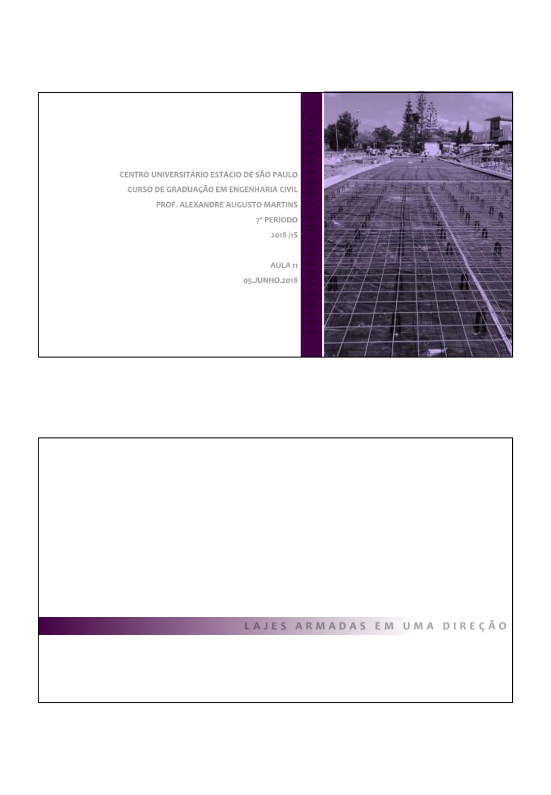 1 E S T R U T U R A S D E C O N C R E T O 1 CENTRO UNIVERSITÁRIO ESTÁCIO DE SÃO PAULO CURSO DE GRADUAÇÃO EM ENGENHARIA CIVIL PROF. ALEXANDRE AUGUSTO MARTINS 7º PERÍODO 2018 /1S AULA 11 05.JUNHO.2018 L A J E S A R M A D A S E M U M A D I R E Ç Ã O 2 E X E R C Í C I O EXERCÍCIO 3 (AULA PASSADA...) ▪ DIMENSIONAR ESTRUTURALMENTE UM TRECHO DE 7,5m DE COMPRIMENTO LONGITUDINAL, REFERENTE A UMA LAJE DE PISO SITUADA NO CORREDOR DE UMA ESCOLA. CONSIDERAR QUE A PAREDE DA SALA DE AULA À ESQUERDA ESTÁ DIRETAMENTE APOIADA SOBRE A REFERIDA LAJE 3 DADOS DO PROBLEMA: ▪ PÉ-DIREITO DO CORREDOR: 3,3m ▪ PARA O TRECHO DE LAJE CONSIDERADO NESTE CÁLCULO: ▪ ÁREA TOTAL = 26,25m² (3,5 X 7,5m) ▪ PISO: ▪ CONTRAPISO (OU CAMADA DE REGULARIZAÇÃO): 0,04m ▪ REVESTIMENTO DA FACE INFERIOR DA LAJE DE PISO: 0,02m ▪ REVESTIMENTO DA FACE SUPERIOR: LÂMINAS DE MADEIRA CABREÚVA ▪ PARA A PAREDE À ESQUERDA, DA SALA DE AULA, APOIADA DIRETAMENTE SOBRE A LAJE: ▪ BLOCOS DE TIJOLO MACIÇO, DE 10,0cm x 5,0cm x 21,0cm ▪ ESPESSURA FINAL DA PAREDE, ACABADA (E) = 0,15m ▪ COMPRIMENTO TOTAL (L) = 7,5m DADOS DO PROBLEMA: ▪ COMPOSIÇÃO ESTRUTURAL DA LAJE DE PISO: ▪ CONDIÇÕES DE BORDO (OU SITUAÇÃO ESTÁTICA): LAJE BI-ENGASTADA, CONSTRUÍDA SOBRE DUAS VIGAS LONGITUDINAIS PRINCIPAIS, DE BW = 0,2m (CADA) ▪ AÇO: CA.25 ▪ CIMENTO: CP IV ▪ fck = 50 MPa ▪ CLASSE DE AGRESSIVIDADE AMBIENTAL (CAA): ▪ AGRESSIVIDADE: FORTE ▪ RISCO DE DETERIORAÇÃO DA ESTRUTURA: GRANDE 4 1 . D E T E R M I N A Ç Ã O D O T I P O D E A R M A Ç Ã O D A L A J E L X = 3 ,5 m LY = 7,5m = LY LX 2,0 = 7,5 3,5 2,0 = 2,14 LAJE ARMADA EM UMA DIREÇÃO 5 LY = 7,5m M X X L X = 3 ,5 m q [kN / m] LX = 3,5m MMÁXDMF q . L2 12 q . L 2 q . L 2 DFC q . L2 12 FLECHA MÁXIMA: fmáx = 1 384 q . L4 E . I . MMÁX = q . L2 24,00 MOMENTO MÁXIMO NO VÃO: XMÁX = q . L2 12,00 MOMENTO MÁXIMO NOS APOIOS: 6 2 . E S P E S S U R A E A L T U R A Ú T I L D A L A J E ONDE: ▪ H = ESPESSURA DA LAJE [cm] = ▪ d = ALTURA ÚTIL INICIAL PARA A LAJE [cm] = ▪ L = DIÂMETRO DA BARRA LONGITUDINAL DA LAJE (VALOR INICIAL ADOTADO: 5,0mm) ▪ CNOM = COBRIMENTO NOMINAL DA ARMADURA (TABELAS 6.1 + 7.2 – NBR 6118) ▪ PARA LAJES RETANGULARES COM BORDAS APOIADAS OU ENGASTADAS, A ESPESSURA PODE SER ESTIMADA POR MEIO DA SEGUITE EXPRESSÃO: H = di + (L / 2) + CNOM [cm] 7 ONDE: ▪ di = ALTURA ÚTIL INICIAL PARA A LAJE [cm] ▪ LX = LEF = VÃO EFETIVO MENOR, CONSIDERANDO A DISTÂNCIA DE EIXO A EIXO ENTRE VIGAS DE APOIO DA LAJE ▪ ψ2 = VALOR QUE DEPENDE DAS CONDIÇÕES DE BORDO (OU DE APOIO DA LAJE) ▪ ψ3 = VALOR DERIVADO DO AÇO EMPREGADO a. PARA LAJES RETANGULARES COM BORDAS APOIADAS OU ENGASTADAS, A ALTURA ÚTIL INICIAL “di” PODE SER ESTIMADA POR MEIO DA SEGUITE EXPRESSÃO: di ψ2 . ψ3 LX [cm] VALORES DE “ψ2” PARA LAJES ARMADAS EM UMA DIREÇÃO CONDIÇÃO DE BORDO (SITUAÇÃO ESTÁTICA) VALOR DE ψ2 1,70 1,20 1,00 0,50 8 VALORES DE “ψ2” PARA LAJES ARMADAS EM UMA DIREÇÃO CONDIÇÃO DE BORDO (SITUAÇÃO ESTÁTICA) VALOR DE ψ2 1,70 1,20 1,00 0,50 VALORES DE “ψ3” PARA LAJES ARMADAS EM UMA DIREÇÃO AÇO UTILIZADO ψ3 LAJE MACIÇA LAJE NERVURADA CA-25 35,0 25,0 CA-32 33,0 22,0 CA-40 30,0 20,0 CA-50 25,0 17,0 CA-60 20,0 15,0 9 VALORES DE “ψ3” PARA LAJES ARMADAS EM UMA DIREÇÃO AÇO UTILIZADO ψ3 LAJE MACIÇA LAJE NERVURADA CA-25 35,0 25,0 CA-32 33,0 22,0 CA-40 30,0 20,0 CA-50 25,0 17,0 CA-60 20,0 15,0 LOGO, ONDE: ▪ di = ALTURA ÚTIL INICIAL PARA A LAJE [cm] ▪ LX = LEF = VÃO EFETIVO, CONSIDERANDO A DISTÂNCIA DE EIXO A EIXO ENTRE VIGAS DE APOIO DA LAJE = 3,5m (= 350,0cm) ▪ ψ2 = VALOR QUE DEPENDE DAS CONDIÇÕES DE BORDO = 1,7 ▪ ψ3 = VALOR DERIVADO DO AÇO EMPREGADO = 35,0 di ψ2 . ψ3 LX [cm] 10 ASSIM, PARA ESTE CASO, A ALTURA ÚTIL INICIAL ADOTADA DA LAJE SERÁ: di = 5,88cm di ψ2 . ψ3 LX di 1,7 . 35,0 350,0 NBR 6118, TABELA 6.1: CLASSES DE AGRESSIVIDADE AMBIENTAL (CAA) CLASSE DE AGRESSIVIDADE AMBIENTAL AGRESSIVIDADE CLASSIFICAÇÃO GERAL DO TIPO DE AMBIENTE PARA EFEITO DE PROJETO’ RISCO DE DETERIORAÇÃO DA ESTRUTURA I FRACA RURAL INSIGNIFICANTE SUBMERSA II MODERADA URBANA PEQUENO III FORTE MARINHA GRANDE INDUSTRIAL IV MUITO FORTE INDUSTRIAL ELEVADO RESPINGOS DE MARÉ b. COBRIMENTO NOMINAL [PASSO 1/2] 11 NBR 6118, TABELA 6.1: CLASSES DE AGRESSIVIDADE AMBIENTAL (CAA) CLASSE DE AGRESSIVIDADE AMBIENTAL AGRESSIVIDADE CLASSIFICAÇÃO GERAL DO TIPO DE AMBIENTE PARA EFEITO DE PROJETO RISCO DE DETERIORAÇÃO DA ESTRUTURA I FRACA RURAL INSIGNIFICANTE SUBMERSA II MODERADA URBANA PEQUENO III FORTE MARINHA GRANDE INDUSTRIAL IV MUITO FORTE INDUSTRIAL ELEVADO RESPINGOS DE MARÉ b. COBRIMENTO NOMINAL [PASSO 1/2] NBR 6118, TABELA 7.2: CORRESPONDÊNCIA ENTRE CLASSE DE AGRESSIVIDADE AMBIENTAL E COBRIMENTO NOMINAL PARA ΔC = 10,0mm TIPO DE ESTRUTURA COMPONENTE (OU ELEMENTO) CLASSE DE AGRESSIVIDADE AMBIENTAL (CAA) I II III IV(2) COBRIMENTO NOMINAL (mm) CONCRETO ARMADO LAJE 20,0 25,0 35,0 45,0 VIGA / PILAR 25,0 30,0 40,0 50,0 ELEMENTOS ESTRUTURAIS EM CONTATO COM O SOLO 30,0 40,0 50,0 b. COBRIMENTO NOMINAL [PASSO 2/2] 12 NBR 6118, TABELA 7.2: CORRESPONDÊNCIA ENTRE CLASSE DE AGRESSIVIDADE AMBIENTAL E COBRIMENTO NOMINAL PARA ΔC = 10,0mm TIPO DE ESTRUTURA COMPONENTE (OU ELEMENTO) CLASSE DE AGRESSIVIDADE AMBIENTAL (CAA) I II III IV(2) COBRIMENTO NOMINAL (mm) CONCRETO ARMADO LAJE 20,0 25,0 35,0 45,0 VIGA / PILAR 25,0 30,0 40,0 50,0 ELEMENTOS ESTRUTURAIS EM CONTATO COM O SOLO 30,0 40,0 50,0 b. COBRIMENTO NOMINAL [PASSO 2/2] H = di + (L / 2) + CNOM ONDE, PARA ESTE CASO: ▪ H = ESPESSURA DA LAJE [cm] ▪ d = ALTURA ÚTIL PARA A LAJE [cm] = 5,88cm ▪ L = DIÂMETRO DA BARRA LONGITUDINAL DA LAJE (VALOR ADOTADO: 5,0mm = 0,5cm) ▪ CNOM = COBRIMENTO NOMINAL DA ARMADURA = 3,5cm (TABELAS 6.1 + 7.2 – NBR 6118) c. CÁLCULO DA ESPESSURA DA LAJE, A PARTIR DA ALTURA ÚTIL INICIAL E DO COBRIMENTO NOMINAL 13 ASSIM, H = di + (L / 2) + CNOM H = 5,88 + (0,5 / 2) + 3,5 H = 9,63cm H = 10,0cm ▪ PORÉM, A NBR 6118/2004 (ITEM 13.2.4.1) ESTABELECE QUE A E