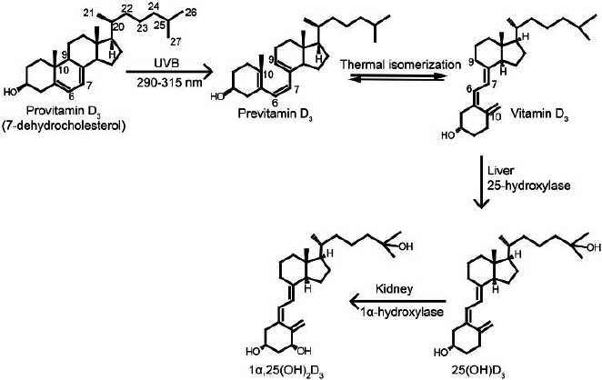 SÍNTESE DA VITAMINA D A vitamina D, é um hormônio esteróide e juntamente com o PTH é o segundo principal hormônio regulador do metabolismo do cálcio. Tem o papel de promover a mineralização do osso recentemente formado aumentando as concentrações plasmáticas de cálcio e fosfato, estimulando a reabsorção destes. A principal fonte da vitamina D é representada pela formação endógena nos tecidos cutâneos após a exposição à radiação ultravioleta. O percursor da vitamina D, o 7-dehidrocolesterol é consumido em nossa dieta a partir de alimentos de origem animal como peixes e ovos e ficará armazenado no tecido adiposo. Após isso, o 7-dehidrocolesterol sofrerá várias mudanças até chegar na vitamina D ativada. A luz solar se torna catalizador para a primeira reação química da síntese de vitamina D. Quando exposto à radiação ultravioleta, o 7-dehidrocolesterol, sofre uma clivagem fotoquímica originando a pré-vitamina D3. Essa molécula termolábil, em um período de 48 horas, sofre um rearranjo molecular dependente da temperatura, o que resulta na formação da vitamina D3 (colecalciferol). A vitamina D3 segue na corrente sanguínea até o fígado, onde sofre hidroxilação, mediada por uma enzima 25-hidroxilasa, e é convertida em 25-hidroxicolecalciferol. A enzima acrescenta uma hidroxila ao carbono 25 da cadeia. O 25-hidroxicolecalciferol representa a forma inativa da vitamina D. A etapa final da produção do hormônio da vitamina D é a hidroxilação adicional que acontece nas células do túbulo contorcido proximal no rim, onde o 25-hidroxicolecalciferol sofre ação da enzima 1α-hidroxilasa, colocando a hidroxila no carbono 1 e originando a 1,25 dihidroxicolecalciferol, a vitamina D na forma ativa. O paratormônio é muito importante nesta fase, pois é ele quem ativa a enzima 1α-hidroxilasa e também aumenta a absorção de cálcio e fosfato nos rins e diminuindo a excreção dos mesmos. Após a vitamina D ativada, ela irá estimular nos eritrócitos o retículo endoplasmático rugoso para a produção de calbindina que irá transportar o cálcio pela via transcelular no intestino delgado e estimular o claudin 16/19 que transporta o cálcio na via paracelular, dessa forma facilitanto a absorção de cálcio na via intestinal. REFERÊNCIAS https://www.researchgate.net/profile/Thiago_Fragoso/publication/49652200_The_importance_of_vitamin_D_levels_in_autoimmune_diseases/links/53cfa29f0cf25dc05cfb0b77/The-importance-of-vitamin-D-levels-in-autoimmune-diseases.pdf https://www.youtube.com/watch?v=43MC8Z2K_dc&t=990s https://www.youtube.com/watch?v=L3M7MHpCpcw&t=319s