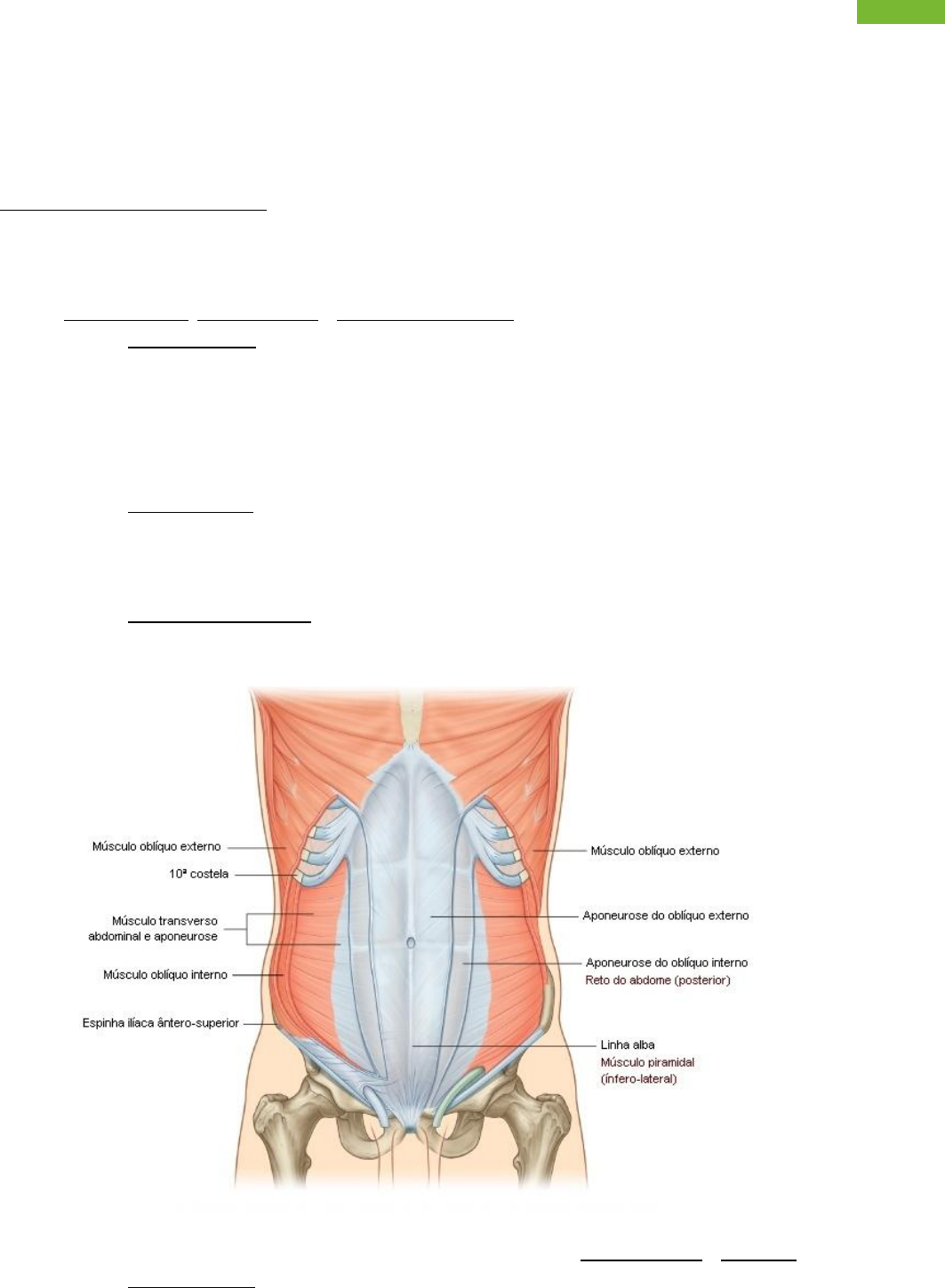 Parede e Cavidade Abdominal 1 50ª Turma - Luiz Felipe Pitzer RReessuummããoo AAnnaattoommiiaa IIII –– 22000099//11 Parede e cavidade abdominal Conhecer os músculos que formam a parede abdominal Parede abdominal ântero-lateral Existem cinco músculos no grupo ântero-lateral de músculos da parede abdominal: — Três músculos planos cujas fibras começam póstero-lateralmente, passam anteriormente e são substituídos por uma aponeurose quando o músculo continua em direção a linha mediana, são eles: oblíquo externo, oblíquo interno e transverso do abdome. — Oblíquo externo – É o mais superficial dos três músculos planos, é imediatamente profundo à fáscia superficial. Suas fibras musculares posicionadas lateralmente passam numa direção ínfero-medial, enquanto a sua aponeurose recobre a parede anterior da parede abdominal até a linha mediana. Ao se aproximar da linha mediana, as aponeuroses ficam entrelaçadas formando a linha alba que se estende a partir do processo xifóide até a sínfise pública. A ex- tremidade inferior de sua aponeurose forma os ligamentos inguinais. — Oblíquo interno – É o segundo dos três músculos planos, e é menor e mais delgado que o oblíquo externo, com a maioria de suas fibras musculares passando numa direção súpero- medial. Os seus componentes musculares laterais terminam anteriormente como uma apo- neurose que se funde na linha alba da linha mediana. — Transverso do abdome – É assim chamado devido a direção da maior parte de suas fibras musculares. Ele termina em uma aponeurose anterior a qual se funde com a linha alba na linha mediana. — Dois músculos verticais próximos à linha mediana, os quais estão confinados dentro da bainha ten- dínea formada pelas aponeuroses dos músculos planos, são eles: reto abdominal e piramidal. — Reto abdominal – É um longo músculo que se estende por todo o comprimento da parede abdominal anterior. Ele é um músculo par, separado na linha mediana pela linha alba, alar- ga-se e fica mais delgado na medida em que segue superiormente a partir da sínfise púbica user Realce user Realce user Realce user Realce linha alba user Realce user Realce user Realce user Realce user Realce tipo mão no bolso user Realce user Realce user Realce user Realce user Realce tipo mão no peito user Realce user Realce user Realce user Realce user Realce user Realce user Realce user Realce Parede e Cavidade Abdominal 2 50ª Turma - Luiz Felipe Pitzer até a margem costal. Ao longo deste trajeto, ele é intersectado por três ou quatro bandas fibrosas ou intersecções tendíneas. — Piramidal – É um pequeno músculo triangular, que pode ser ausente, é anterior ao reto do abdome, tem a sua base no púbis e seu ápice é fixado superiormente e medialmente à linha alba. Músculo Inervação Função Oblíquo externo Ramos anteriores dos seis últimos nervos torácicos espinhais (T7 a T12) Comprime e sustenta o conteúdo abdominal; flexiona e roda o tron- co Oblíquo interno Ramos anteriores dos seis últimos nervos torácicos espinhais (T7 a T12) e L1 Transverso do abdome Comprime e sustenta o conteúdo abdominal Reto do Abdome Ramos anteriores dos seis últimos nervos torácicos espinhais (T7 a T12) Comprime o conteúdo abdominal; flexiona a coluna vertebral; tensio- na a parede abdominal estabiliza- ndo e controlando a inclinação da pelve (antilordose) Piramidal Ramo anterior de T12 Tensiona a linha alba Cada um desses cinco músculos tem ações específicas, porém em conjunto são críticos para a manu- tenção de muitas funções fisiológicas normais. Devido ao seu posicionamento, eles formam uma firme, porém flexível, parede que mantém as vísceras abdominais dentro da cavidade abdominal, protege-as de lesões e ajuda na manutenção da posição das mesmas na postura ereta contra a ação da gravidade. Ainda, a contração destes músculos ajuda tanto na expiração normal quanto na forçada, empurrando as vísceras superiormente (o que ajuda a empurrar o diafragma relaxado para dentro da cavidade torácica) e ainda durante a tosse e vômitos. Todos estes músculos estão também envolvidos em qualquer ação que aumente a pressão intra- abdominal, incluindo o parto, a micção e defecção (expulsão de fezes pelo reto). Parede abdominal posterior Os músculos formam os limites medial, lateral, inferi- or e superior da região abdominal posterior preenchendo o esqueleto ósseo da parede abdominal posterior. Medi- almente existem os músculos psoas maior e menor, lateralmente o músculo quadrado do lombo, inferiormen- te o músculo ilíaco e superiormente o diafragma. — Psoas maior – Reveste, medialmente, a face ânte- ro-lateral dos corpos das vértebras lombares, preenchendo os espaços entre os corpos das vér- tebras e os processos transversos. Cada um desses músculos aparece dos corpos das vérte- bras TXII e de todas as vértebras lombares. Passando inferiormente ao longo da margem pél- vica, cada músculo continua para o interior da parte anterior da coxa, inferiormente ao ligamen- to inguinal, para se inserir no trocanter menor do fêmur. — Psoas menor – Está situado na superfície do mús- user Realce user Realce user Realce user Realce user Realce user Realce user Realce user Realce user Realce user Realce user Realce user Realce user Realce user Realce user Realce user Realce user Realce Parede e Cavidade Abdominal 3 50ª Turma - Luiz Felipe Pitzer culo psoas maior, quando presente, esse delgado músculo aparece das vértebras TXII a L1 e preen- che os discos intervertebrais. Seu longo tendão se insere na linha pectínea do osso do quadril e na eminência iliopúbica. — Quadrado do lombo – Preenche o espaço entre as costelas XII e a crista ilíaca em ambos os lados da coluna vertebral. É recoberto medialmente pelo músculo psoas maior. Ao longo de suas margens la- terais estão os músculos transversos do abdome. Ele aparece a partir dos pr