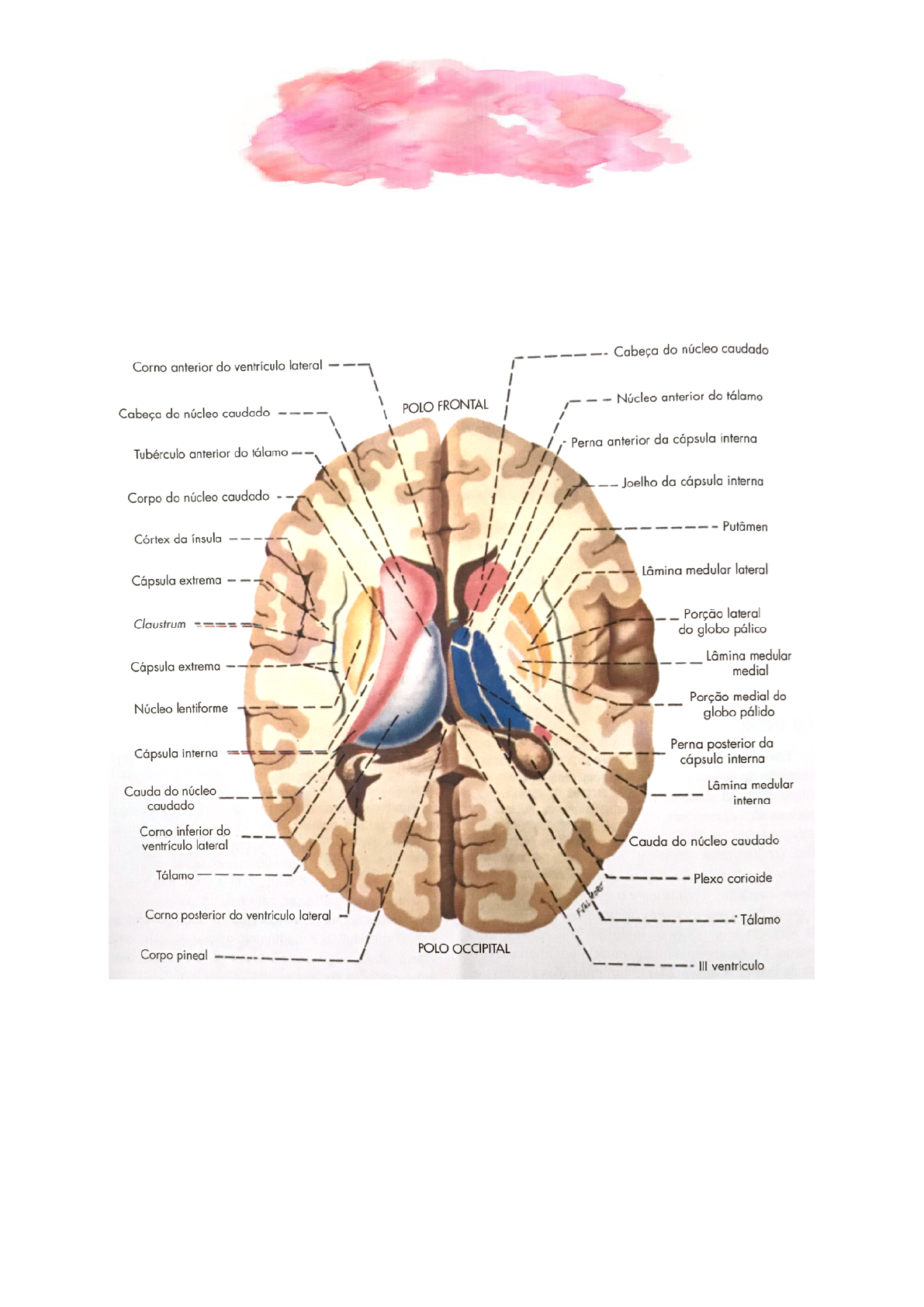 • Núcleos da base são massas de substância cinzenta situadas na base do telencéfalo. • Estes núcleos são: claustrum, amígdala (corpo amigdaloide), núcleo caudado, putâmen e globo pálido. • O núcleo caudado, putâmen e globo pálido integram o chamado corpo estriado dorsal. • O claustrum, situado entre o putâmen e o córtex da ínsula, tem conexões recíprocas com praticamente todas as áreas corticais. • O corpo amigdaloide (amígdala) é um importante componente do sistema límbico. • Os estudos sobre os núcleos da base foram, desde o início, motivados pela necessidade de se entender algumas doenças como o e o Hemibalismo, em que há grandes alterações de motricidade. Gabriela Reis Viol Núcleos da Base • Embora os núcleos da base, em especial o corpo estriado dorsal, continuem a ser estruturas predominantemente motoras, eles também estão envolvidos com várias funções não motoras, relacionadas a processos cognitivos, emocionais e motivacionais. CORPO ESTRIADO • Também chamado de corpo estriado dorsal, é constituído pelo núcleo caudado, putâmen e globo pálido. • O putâmen e o globo pálido constituem o núcleo lentiforme. • Pode-se dividir em uma parte recente: neoestriado, que compreende o putâmen e o globo pálido; e uma parte antiga: paleoestriado, constituída pelo globo pálido. • O globo pálido divide-se em uma parte medial e outra lateral: pálido medial e lateral. • Existem muitas fibras ligando o núcleo caudado e o putâmen ao globo pálido. Gabriela Reis Viol • O corpo estriado não tem conexões aferentes ou eferentes diretas com a medula, suas funções são exercidas por circuitos nos quais áreas corticais de funções diferentes projetam-se para áreas específicas do corpo estriado que, por sua vez, liga-se ao tálamo e, através deste, às áreas corticais de origem. Fecham-se, assim, os circuitos em alça corticoestriado-talamocorticais, dos quais foram identificados 5 tipos: 1. Circuito motor: participa da regulação da motricidade voluntária. Começa nas áreas motoras e somestésica do córtex e projeta-se para o putâmen (para cada região do córtex há uma região correspondente no putâmen). A partir do putâmen, o circuito motor pode seguir por duas vias: direta e indireta. Na via direta, a conexão do putâmen se faz diretamente com o pálido interno e deste para os núcleos ventral anterior (VA) e ventral lateral (VL) do tálamo onde se projetam para as mesmas áreas motoras de origem. Na via indireta, a conexão é com o pálido externo que, por sua vez, projeta-se para o núcleo subtalâmico e deste para o pálido interno. Do pálido interno, seguido do tálamo e córtex como na via direta. Ligado ao circuito motor há um circuito no qual o putâmen mantém conexões recíprocas com a substância negra, este circuito é importante porque as fibras nigroestriatais são dopaminérgicas e exercem ação modulatória sobre o circuito motor. Esta ação é excitatória na via direta e inibitória na via indireta. O fato do mesmo neurotransmissor, dopamina, ter ações diferentes explica-se pelo fato de que no putâmen existem dois tipos de receptores de dopamina. Em ambas as vias, o pálido interno mantém uma inibição permanente do dois núcleos talâmicos resultando em inibição das áreas motoras do córtex. Na via direta, o putâmen inibe o pálido interno, cessa a inibição deste sobre o tálamo resultando ativação do córtex e facilitando o movimento. Na via indireta, o oposto: a projeção excitatória do núcleo subtalâmico sobre o pálido interno aumenta a inibição deste sobre os núcleos talâmicos resultando em inibição do córtex e dos movimentos. 2. Circuito oculomotor: começa e termina no campo ocular motor e está relacionado aos movimentos oculares. 3. Circuito pré-frontal dorsolateral: começa na parte dorsolateral do área pré-frontal. Projeta-se para o núcleo caudado, daí para o globo pálido, núcleo dorsomedial do tálamo e volta ao córtex pré-frontal. Gabriela Reis Viol 4. Circuito pré-frontal orbitofrontal: começa e termina na parte orbitofrontal da área pré-frontal. Projeta-se para o núcleo caudado, daí para o globo pálido, núcleo dorsomedial do tálamo e volta ao córtex pré-frontal. 5. Circuito límbico: origina-se nas áreas neocorticais do sistema límbico, em especial a parte anterior do giro cíngulo, projeta-se para o estriado ventral em especial o núcleo accumbens, daí para o núcleo anterior do tálamo. Está relacionado com o processamento das emoções. CONSIDERAÇÕES FUNCIONAIS E CLÍNICAS • O papel do corpo estriado no controle motor pode ser inserido por meio do estudo de pacientes com lesões no circuito motor. • A atividade inibitória das eferências do globo pálido interno é um freio permanente para movimentos indesejados. • Logo, os núcleos da base têm um papel na preparação de programas motores e na execução automática de programas motores já aprendidos. • As aferências da via indireta podem frear ou suavizar o movimento, enquanto a direta o facilitaria e ambas participariam na gradação de amplitude e velocidade do movimento. O comportamento motor normal depende do equilíbrio entre a atividade das vias direta e indireta. • Diversas síndromes clínicas que acometem o corpo estriado são devidas a alterados do equilíbrio entre as vias. Os transtornos do corpo estriado são hipercinéticos, hipocinéticos ou comportamentais e emocionais. • HEMIBALISMO. Caracterizado por movimentos involuntários, de grande amplitude e forte intensidade, dos membros do lado da lesão, que se assemelham ao movimento de um indivíduo arremessando um objeto. Nos casos mais graves, esses movimentos não desaparecem com o sono, podendo levar o doente a exaustão. A causa mais comum são lesões do núcleo subtalâmico, resultantes de pequenos acidentes vasculares. Os sintomas devem-se à diminuição da atividade excitatória 