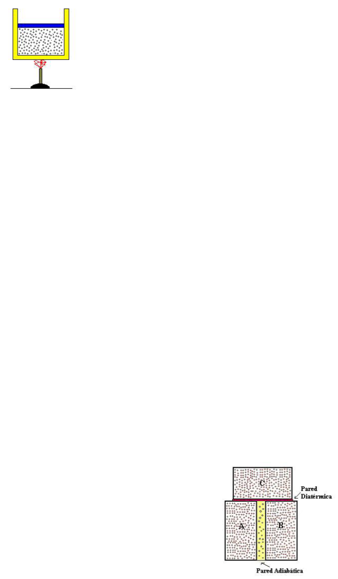 Calor y Termodinámica Hugo Medina Guzmán 1 CAPÍTULO 5. Termodinámica INTRODUCCION. Sistemas Termodinámicos Variables termodinámicas macroscópicas. Consideremos un gas encerrado en un tubo cilíndrico cerrado a uno de sus extremos y provisto de una tapa deslizante (pistón) en el otro. Como se muestra en la figura. El sistema descrito ocupa determinado volumen el cuál puede conocerse en determinado momento por la posición del pistón, otra cantidad indispensable para la descripción del sistema es la presión del gas en el cilindro, que también se puede conocer, mediante un manómetro. Finalmente, para tener una idea completa de lo que sucede en el cilindro hay que conocer la temperatura, la cual puede medirse en forma simple al igual que las otras dos cantidades. Estas cantidades obtenidas por medición directa, que describen al sistema, nos proporcionarán lo que se conoce como la Descripción microscópica del sistema. Otro punto de vista de describir el sistema es asumiendo que el gas esta formado por un gran número de partículas, moléculas o átomos, todos de igual masa y cada uno moviéndose con una velocidad independiente de las otras es imposible aplicar las leyes de Newton del movimiento a cada molécula por separado e incluso tabular las coordenadas de cada molécula, en este caso es necesario usar métodos estadísticos las cantidades que lo especifican no están directamente asociadas, con nuestro sentido de percepción, esta descripción es conocida como Descripción microscópica del Sistema. La descripción macroscópica o sea las propiedades apreciadas por nuestros sentidos son el punto de partida para todas las investigaciones y aplicaciones prácticas. Por ejemplo, en la mecánica do un cuerpo rígido, considerando los aspectos, externos, especificamos su centro de masa con referencia a un eje de coordenadas en un tiempo particular. La posición y e1 tiempo y la combinación de ambos, tal como la. Velocidad, constituyen algunas de las cantidades macroscópicas usadas en mecánica y son llamadas coordenadas mecánicas y estas sirven para determinar la energía potencial y cinética del cuerpo rígido. Estos dos tipos de energía, constituyen la energía mecánica o externa del cuerpo rígido. El propósito de la mecánica es encontrar relaciones entre las coordenadas de posición y el tiempo consistentes con las leyes de Newton del movimiento. En la termodinámica la atención se dirige al exterior del sistema. Se determinan experimentalmente: las cantidades macroscópicas que son necesarias y suficientes para describir el estado interno del sistema, estas son llamadas coordenadas termodinámicas. El propósito de la termodinámica es encontrar las relaciones entre las coordenadas termodinámicas consistentes con las leyes fundamentales de la termodinámica. Finalmente, puntualizaremos que dentro de la física, las leyes que relacionan las cantidades macroscópicas, se denomina termodinámica clásica o simplemente termodinámica y, las fórmulas matemáticas que relacionan las cantidades microscópicas, constituyen la Mecánica Estadística, o Teoría atómica del calor, o bien, cuando se usan técnicas simples estadístico-matemáticas se le llama teoría cinética. LEY CERO DE LA TERMODINÁMICA Y EQUILIBRIO TÉRMICO. Supongamos que tenemos dos sistemas A y B, separados cada uno y definidos por las coordenadas (presión y temperatura) p, T y p’, T’ respectivamente. El estado de un sistema en el cual las velocidades macroscópicas tienen valores que permanecen constantes mientras que las condiciones externas no se cambien, se conoce como estado de equilibrio térmico. Equilibrio térmico. Los experimentos demuestran que la existencia de un estado de equilibrio depende de la proximidad de otros sistemas y de la naturaleza de la pared que los separa. Si cuando un sistema está en un estado de equilibrio y este no cambia con cualquier cambio en el ambiente, el sistema se dice que está “Aislado” o rodeado por una pared “Pared Adiabática”. Cuando las variables macroscópicas de dos sistemas que se encuentran conectadas por una pared diatérmica no varían, se dice que se encuentran equilibrios térmicos entre ellas. Imaginemos a los sistemas A y B separados en contacto, o separados por una pared diatérmica, con un sistema C. Calor y Termodinámica Hugo Medina Guzmán 2 El sistema A estará en equilibrio con el sistema C y el sistema B también estará en equilibrio con el sistema C, luego los sistemas A y B estarán en equilibrio térmico uno con el otro. Esto se conoce como la Ley cero de la termodinámica, "Si dos sistemas se encuentran en equilibrio térmico con un tercer sistema, los dos sistemas se encuentran en equilibrio entre sí". Esta ley está de acuerdo a nuestra experiencia diaria de nuestros sentidos, es sencilla pero no obvia, es un hecho que sucede pero podría no haber sido así. Nos expresa la idea fundamental de temperatura. Cuando decimos que las variables macrosc6picas no varían, nos hace falta definir una propiedad que asegure esto. Esta propiedad la llamaremos Temperatura. Nosotros queremos asignar un número de cada estado de equilibrio de un sistema que tenga la propiedad que dos sistemas con el mismo número estén en equilibrio térmico entre ellos. "La temperatura de un sistema es una propiedad que determina si un sistema está en equilibrio o no con otros sistemas". TEMPERATURA Y ESCALAS La temperatura se determina por la medición de alguna cantidad mecánica, eléctrica u óptica cuyo valor se correlaciona con la temperatura. Generalmente la temperatura de una sustancia, sino en el termómetro el cual, se pone en contacto íntimo con la instancia y adquiere la misma temperatura. Se llama TERMOMETRO, a un aparato que permite medir la temperatura por medio de su propiedad termométrica o variable macroscópica que es sensible al estado térmico de la sustancia. Los principales termómetros y sus propiedades termométri